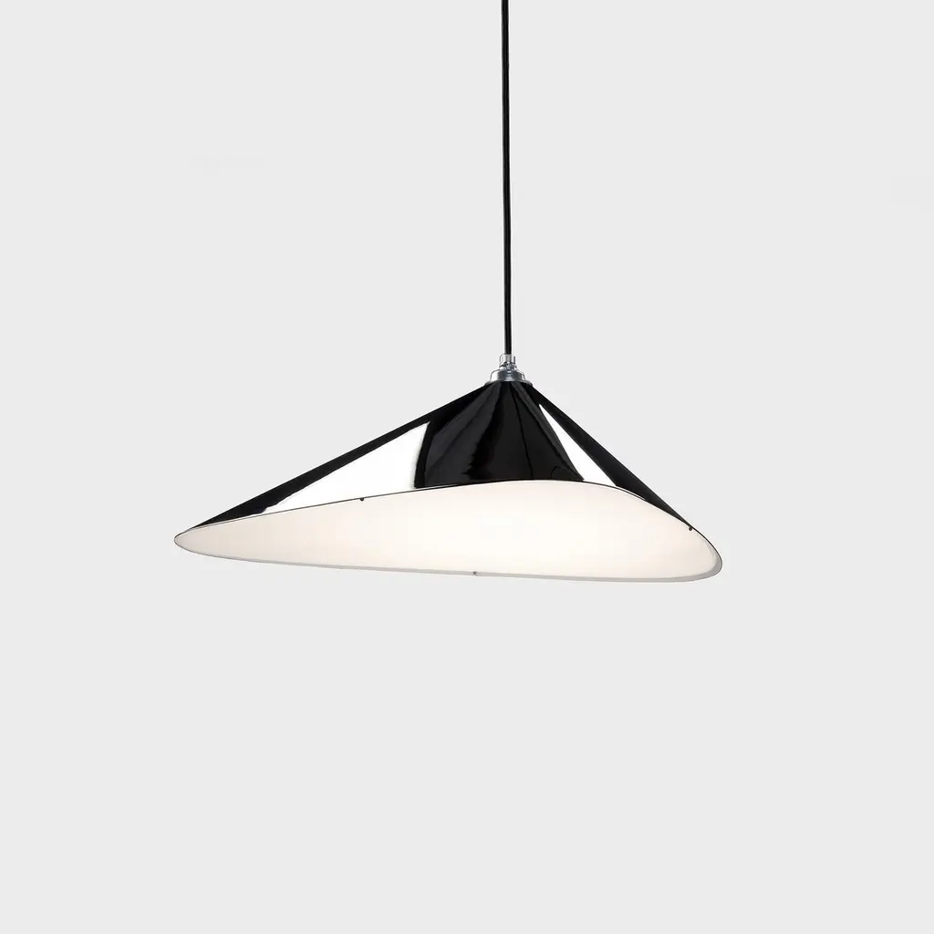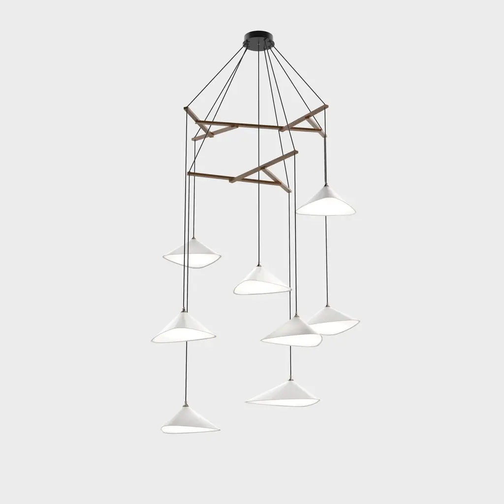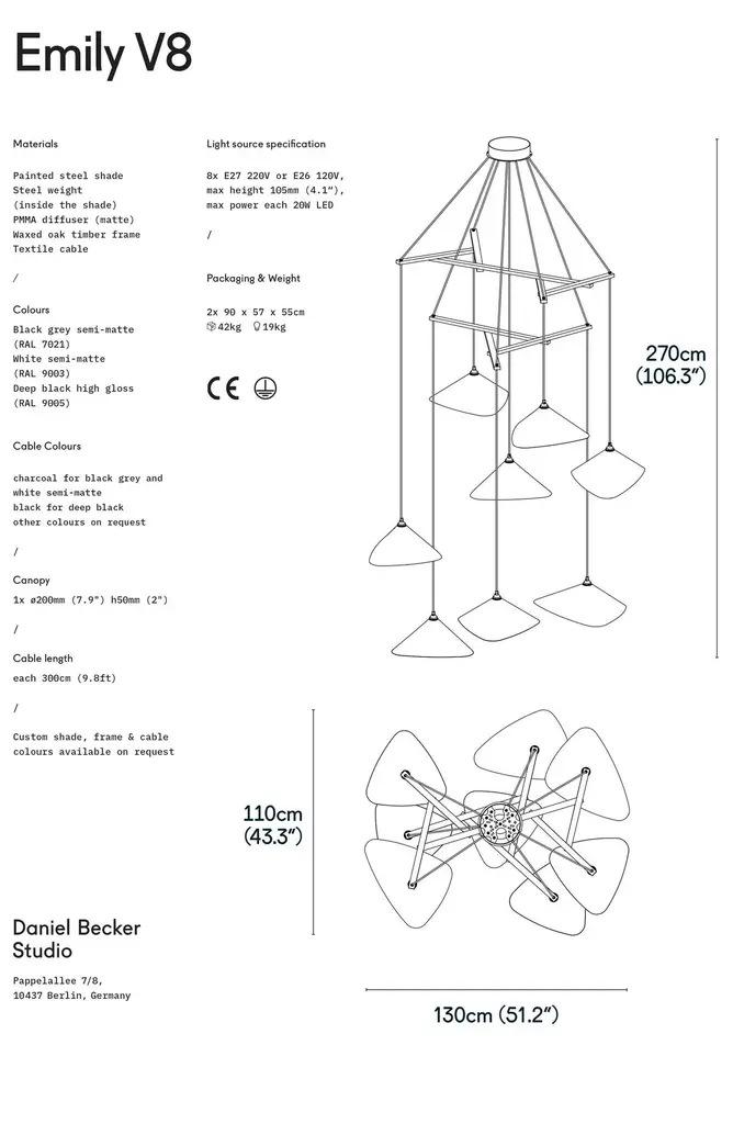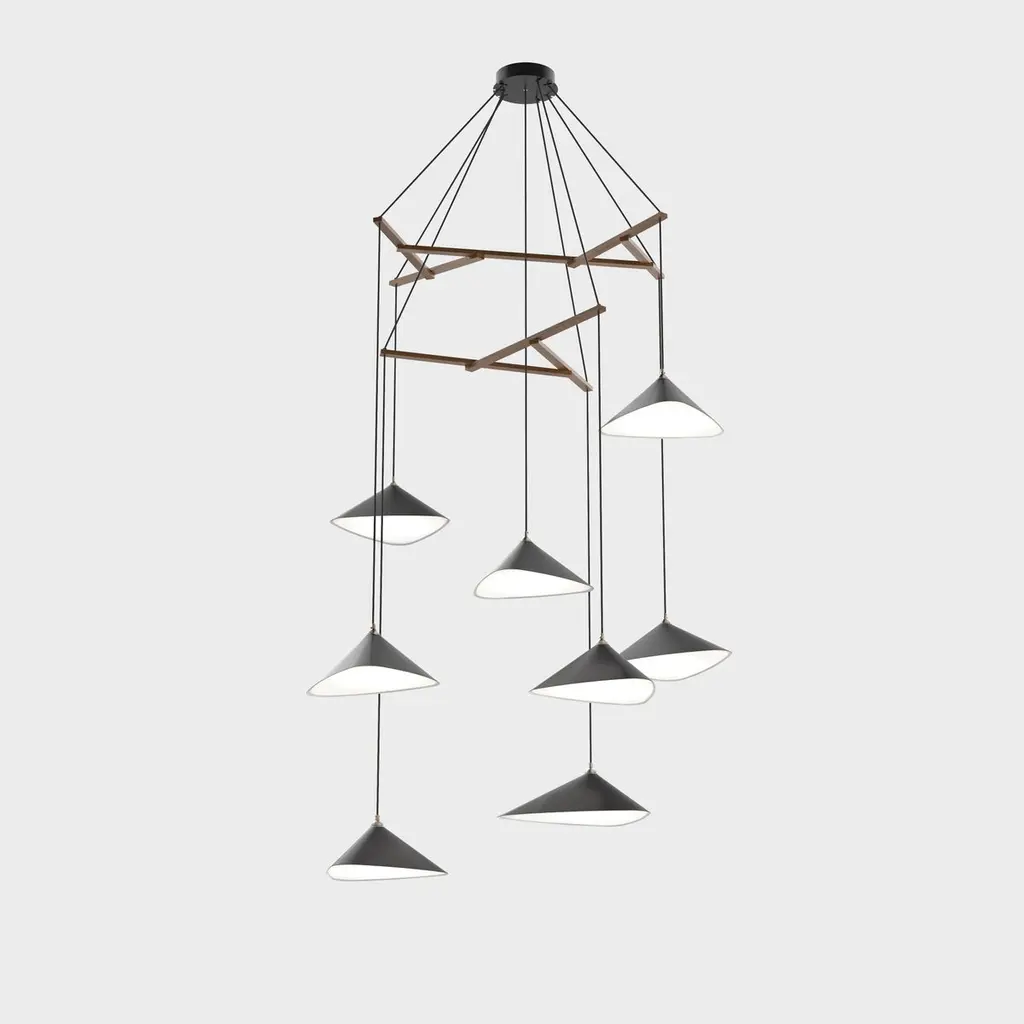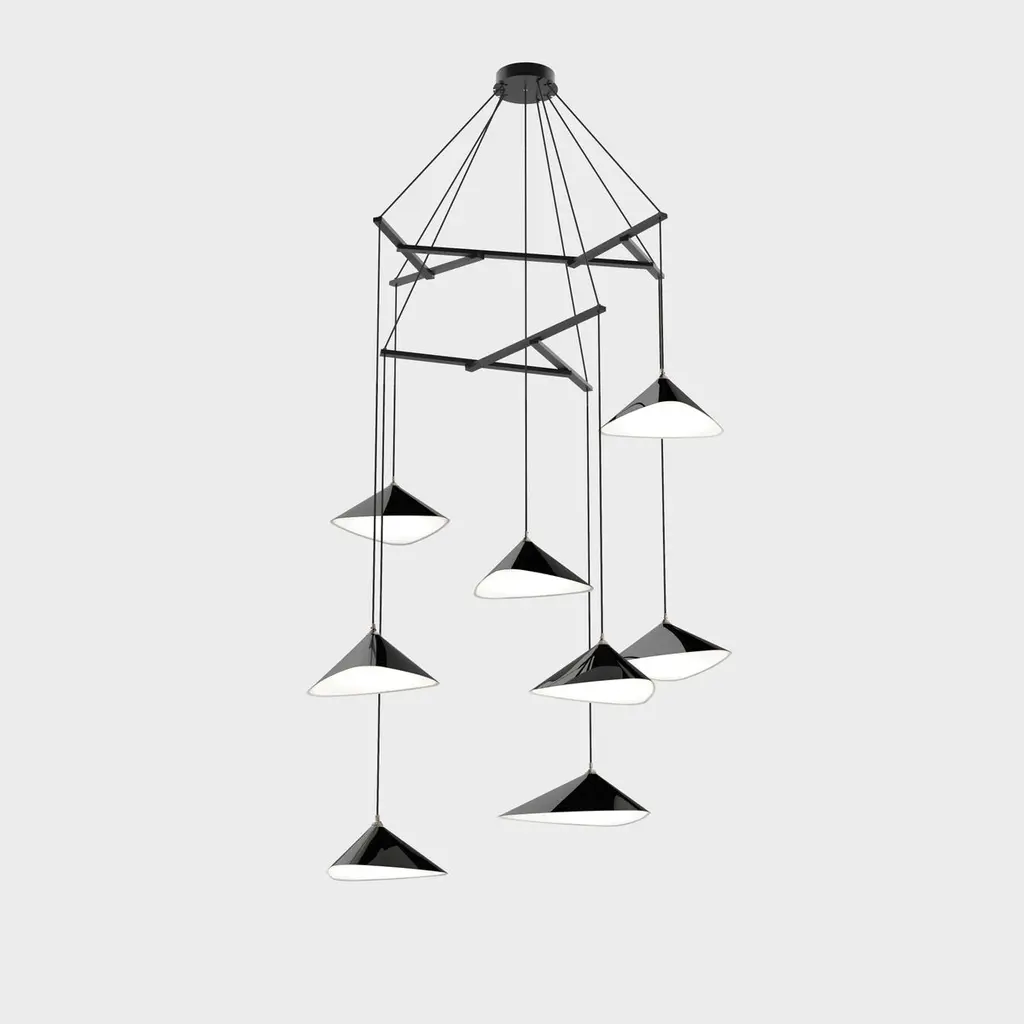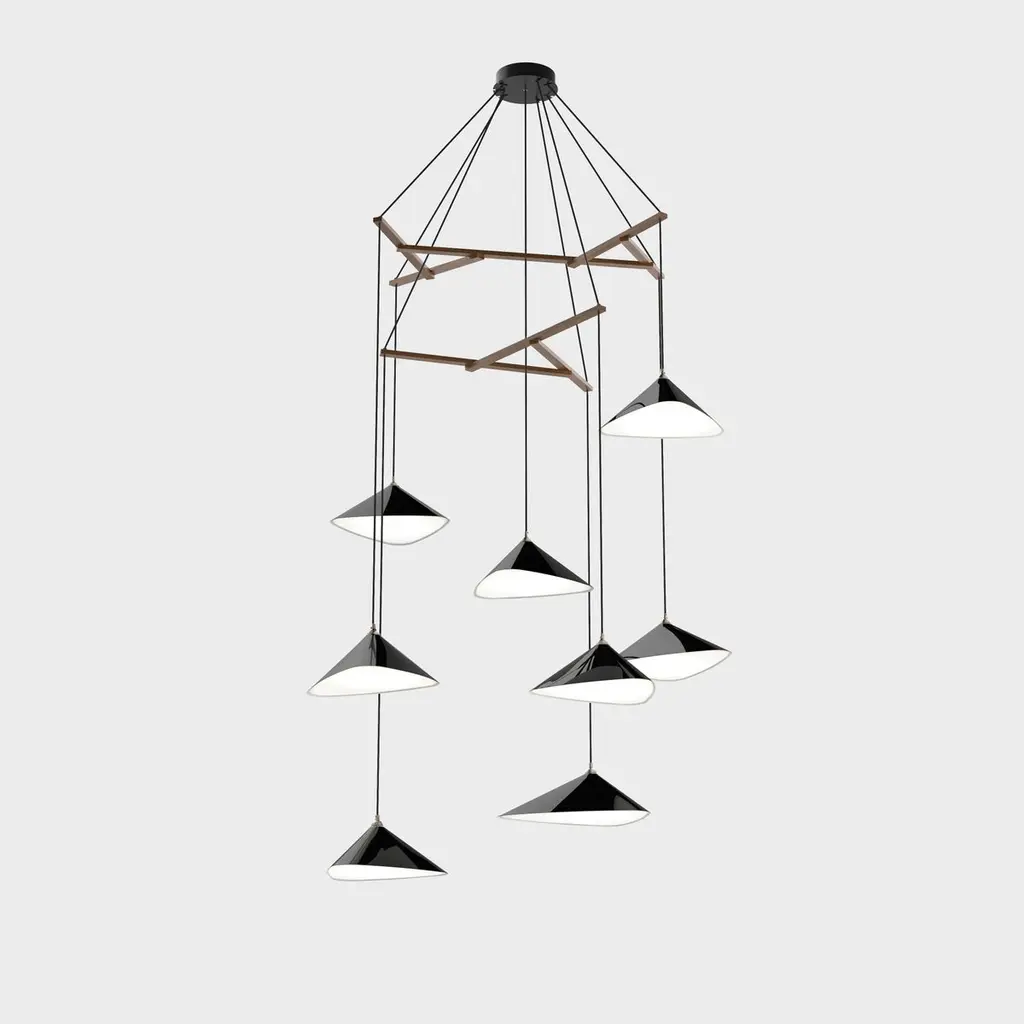 Daniel Becker 'Emily Vertikal 8' Chandelier in Gloss Black for Moss Objects.Designed by Berlin luminary Daniel Becker and handmade to order using modern and mid-century manufacturing techniques, the Emily Series won the prestigious German Design Award 2019. The high quality sheet steel shades are cut, bent, formed, welded and sanded by hand in a complex process to build natural, organic shapes before they are painted a high-gloss black and fitted with opaline PMMA diffusers. Then they are arranged in a mobile like fashion around a sculptural frame of waxed oak timber. This new 'Vertikal' version of Becker's iconic design is better fitted for vertical spaces such as staircases, where a long and narrow installation is needed.Price per item. Shades available in glossy black (RAL 9005) as well as a semi-matte finish in anthracite (RAL 7021) or white (RAL 9003). Frame available in choice of natural or black oak. This listing is for the Emily Vertikal 8 chandelier in gloss black with black frame. Please note that the photos in this listing also show other color and finish options. Prices vary.'Emily Vertikal 8' consists of:4 x 'Emily I' (13.6" W x 19.7" L)4 x 'Emily II' (14.6" W x 15.8" L)Standard in-stock lead time 5-6 weeks. Out of stock lead time up to 8 weeks or more. Lead time and availability are subject to change without notice. Please contact us for current lead time prior to placing time-sensitive orders.Wired for US electrical, each shade accommodates a single E26 medium base maximum 60W Equivalent LED bulb (bulb not included). Not UL listed, but recommended UL listing possible from an authorized 3rd party vendor upon request for an additional fee.Handmade to order. All sales are final.