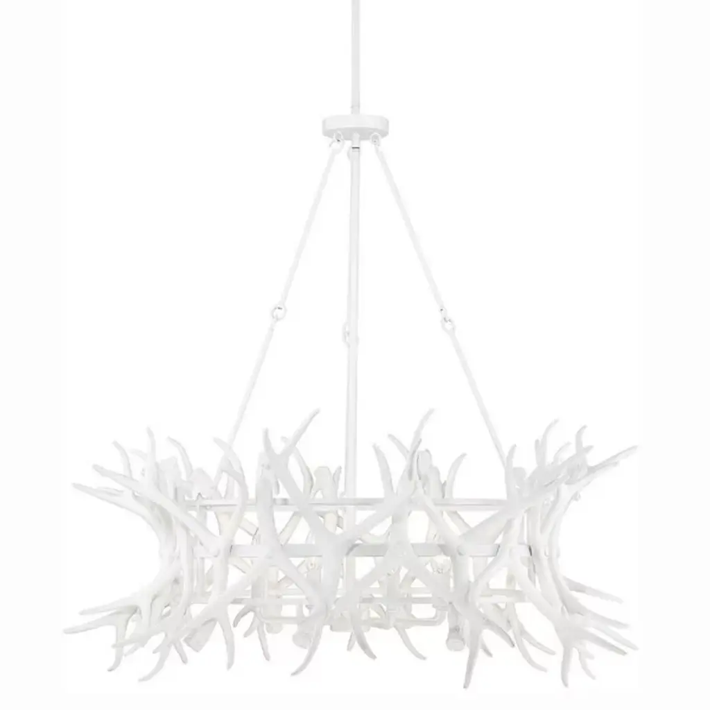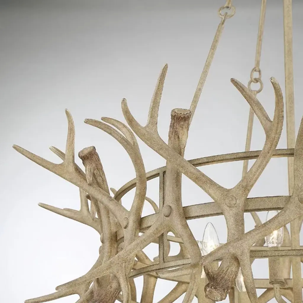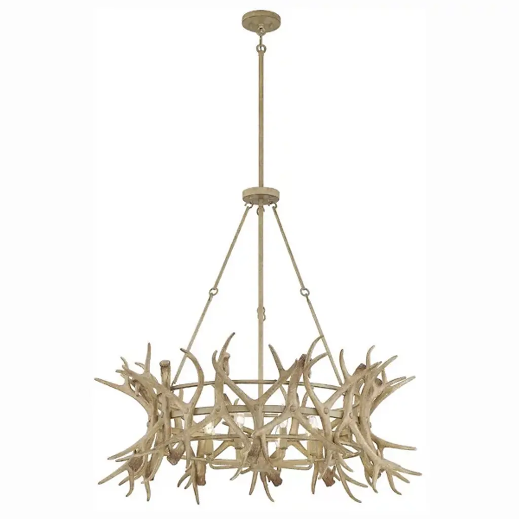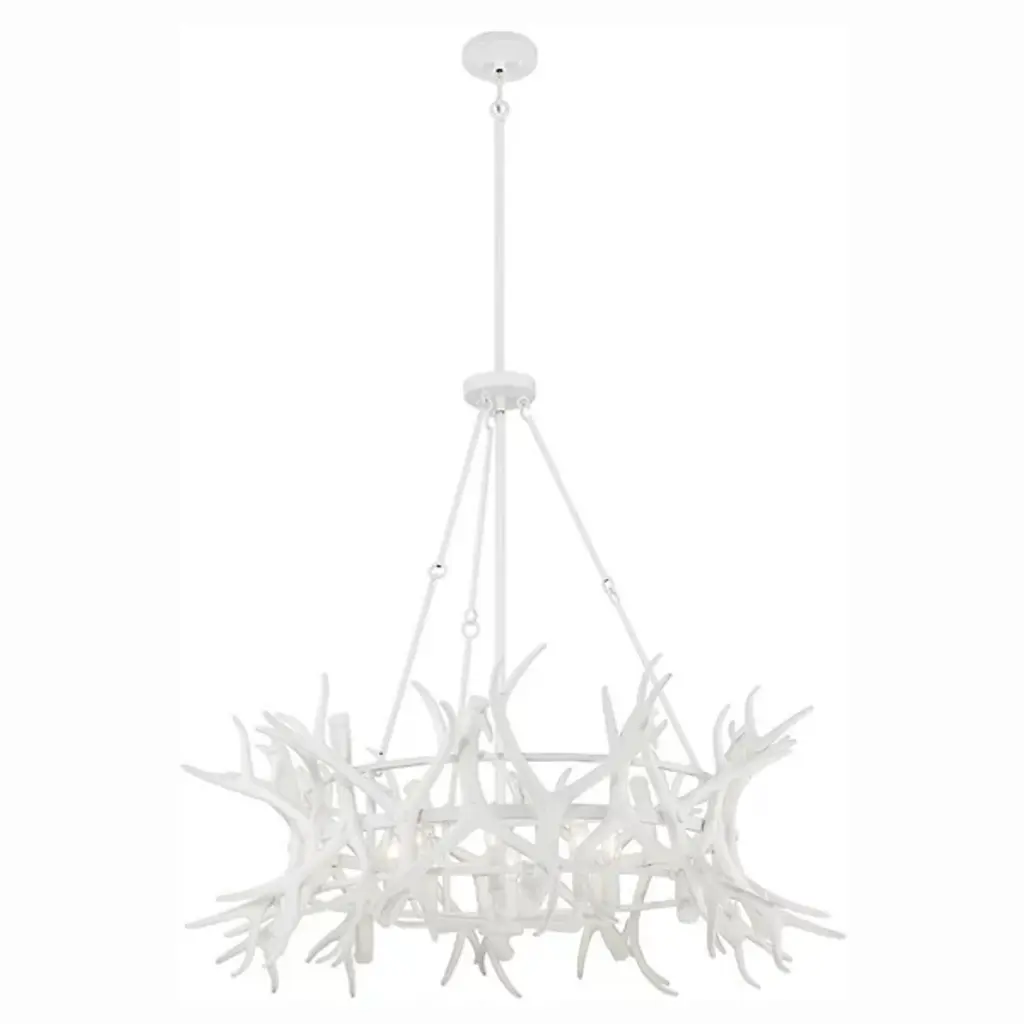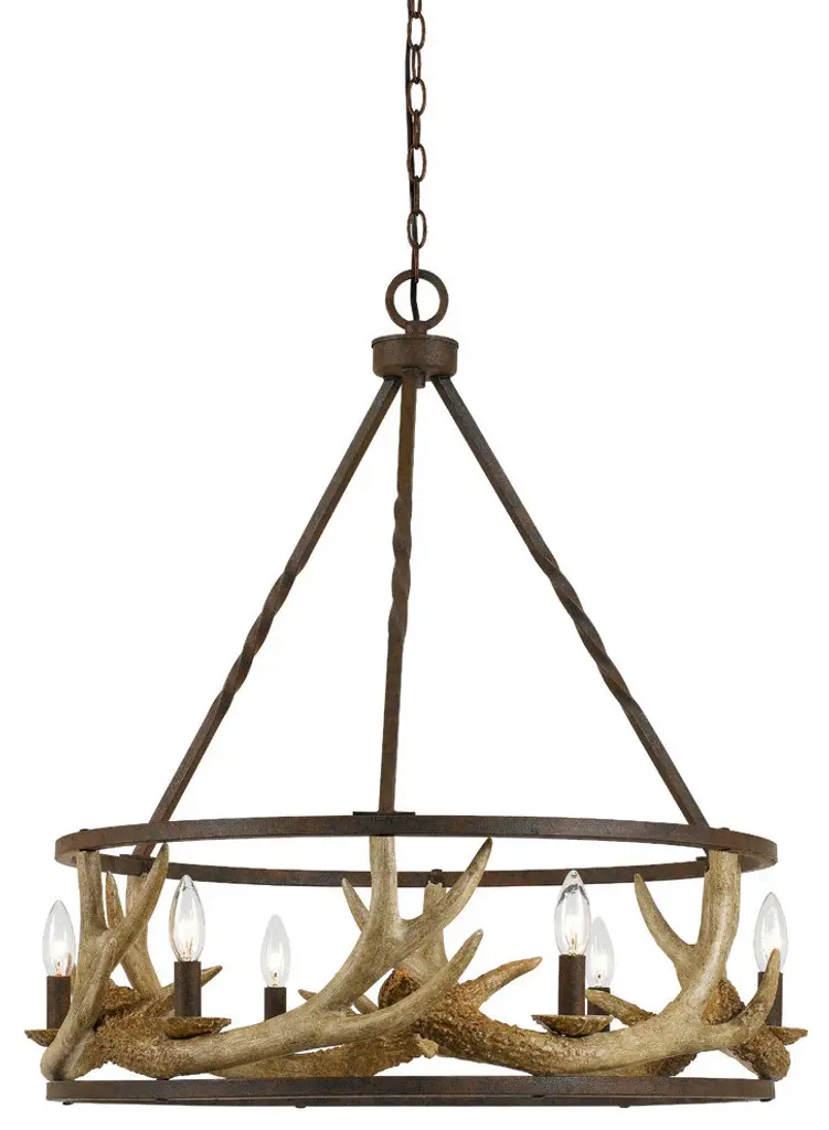 Showcase the Rustic Modern style of your decorative arrangements with the Daniels Chandelier by Savoy House. Fine metal has been worked into a frame detailed with antler addendums. The chandelier is held in place by a downrod connected to a disc-shaped ceiling canopy. Vibrant Incandescent bulbs emit light that fills your environment from a tier in the air. Take control of your ambiance by pairing the chandelier with a Standard Dimmer. Detailed antler design Hanging fixture Frame constructed in an open ring style