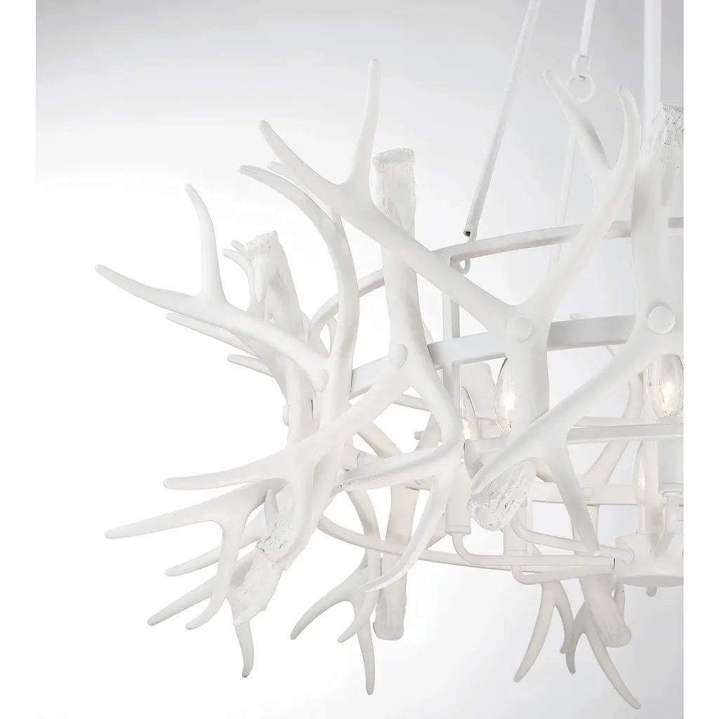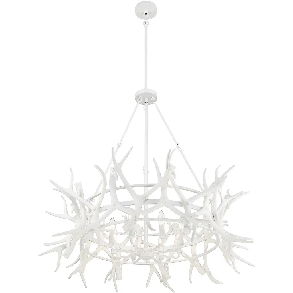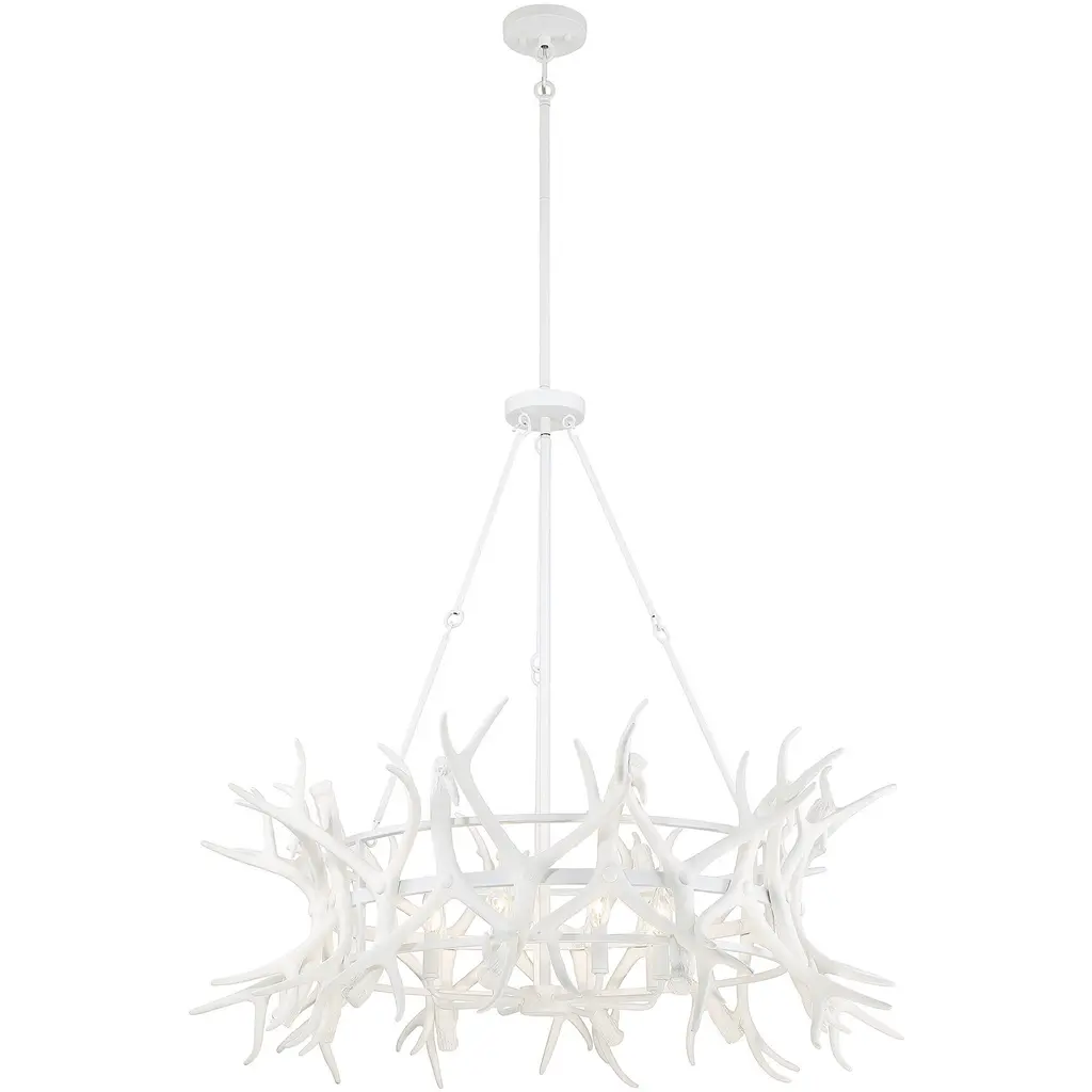 The chic Savoy House Daniels 8-light chandelier updates the rustic charm of antler chandeliers with a casual sophistication. With its fashionable matte white finish and open ring style, Daniels transports you to a cozy yet stylish mountain cabin. This chandelier is 40" in width and has an adjustable height ranging from 44" to 90". It uses eight candelabra size bulbs of up to 60 watts per bulb. Comes with four 12" downrods and one 6" downrod, plus 80" of cord.
