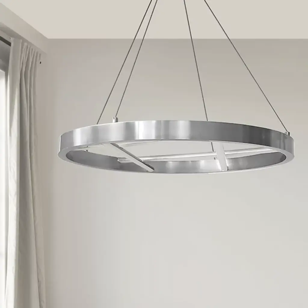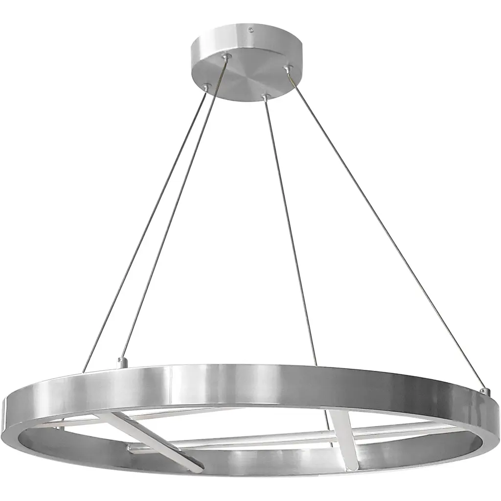 A modern lighting design with modern artistic appeal. The Dante LED Chandelier by Dainolite has a ring-shaped metal frame hanging from the ceiling canopy by slim cables. Within the ring, overlapping, perpendicular bars create a sculptural, woven effect. Those bars also cast a bright wash of downlight via the LED light that’s diffused through silicone plastic lenses. In a living room or dining room, this chandelier shows off plenty of sculptural style and ambience.