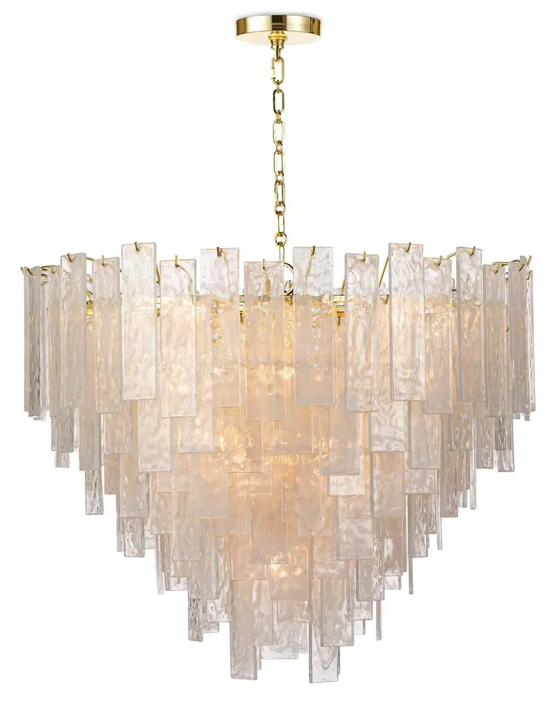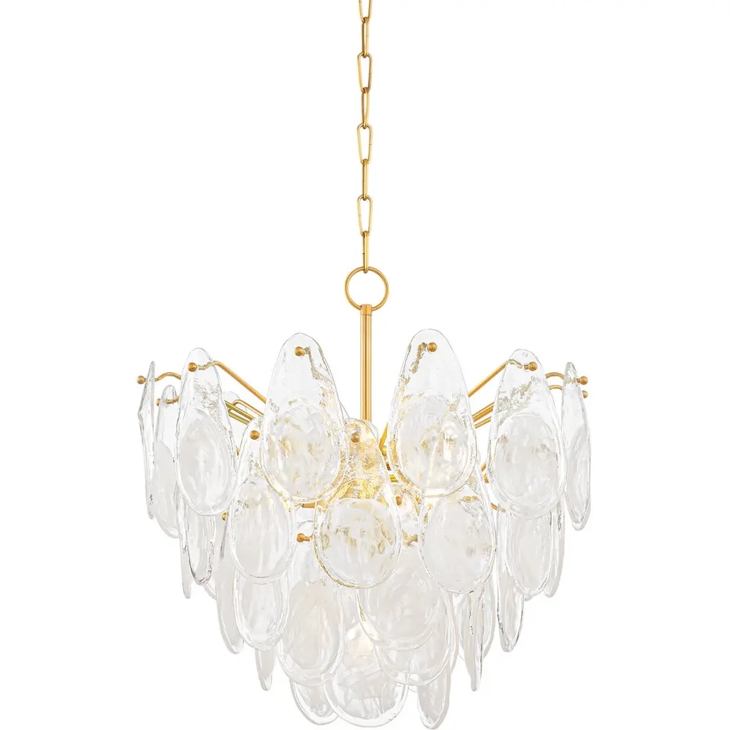 Elegantly suspended in tiers. The Darcia Chandelier from Hudson Valley Lighting features smooth Blonchino Piastra glass teardrops that cascade like a graceful waterfall. Reminiscent of delicate shells or gentle rain, these hand-blown glass pieces sparkle, softening and diffusing the light with poetic grace. Darcia makes an organic and visually stunning statement, blending artistic design with the play of light to create a luminaire that adds a touch of enchantment to any space.