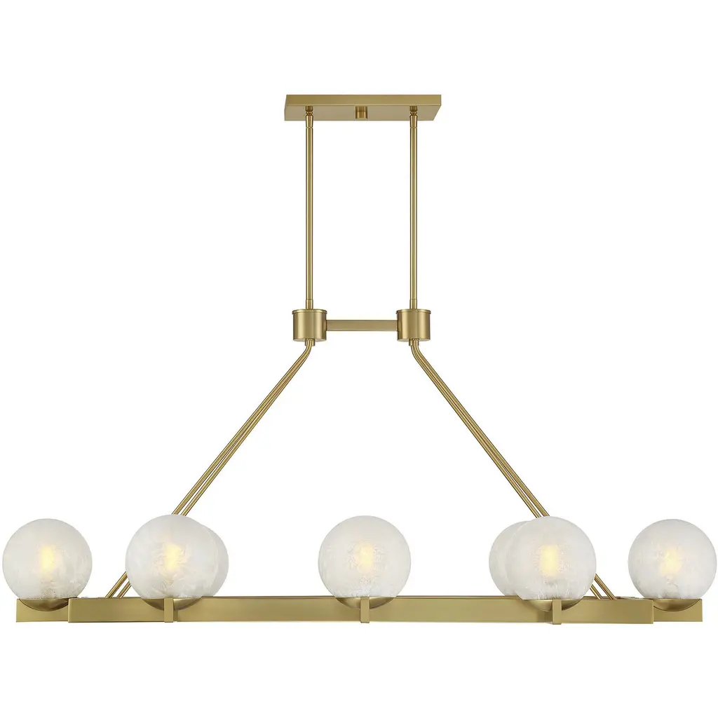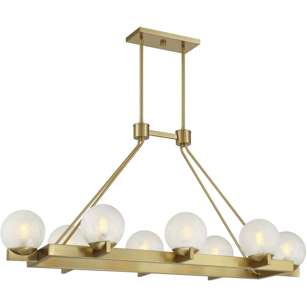 The Savoy House Darien is a 8-light linear chandelier with fabulously chilly appeal. A minimal, elongated frame is finished in bold Warm Brass and holds eight orbs of Ice Glass, adding sub-zero cool with tons of frosty texture. Darien is 48" in length, 19.75" in width and has an adjustable height ranging from 22.25" to 76.25". Uses eight candelabra size bulbs of up to 60 watts per bulb. Bulbs not included. Comes with eight 12" downrods and two 6" downrods.