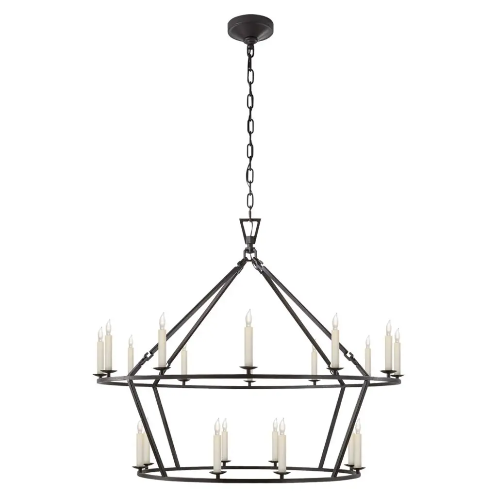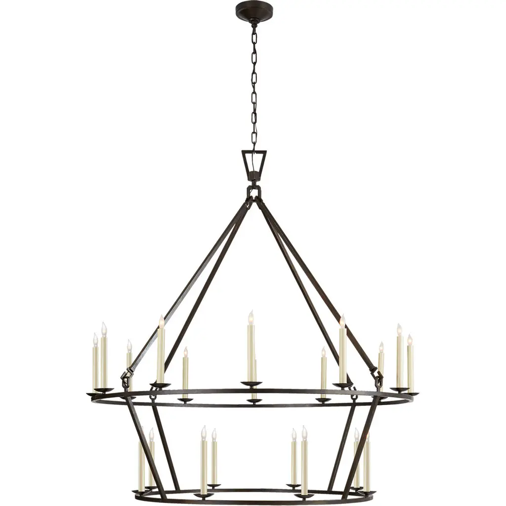 The open, airy iron frame of this large two-tiered ring chandelier brings depth and structure to any space. Sealed in an aged iron finish for added luster. Hardwired.