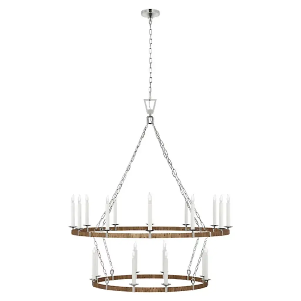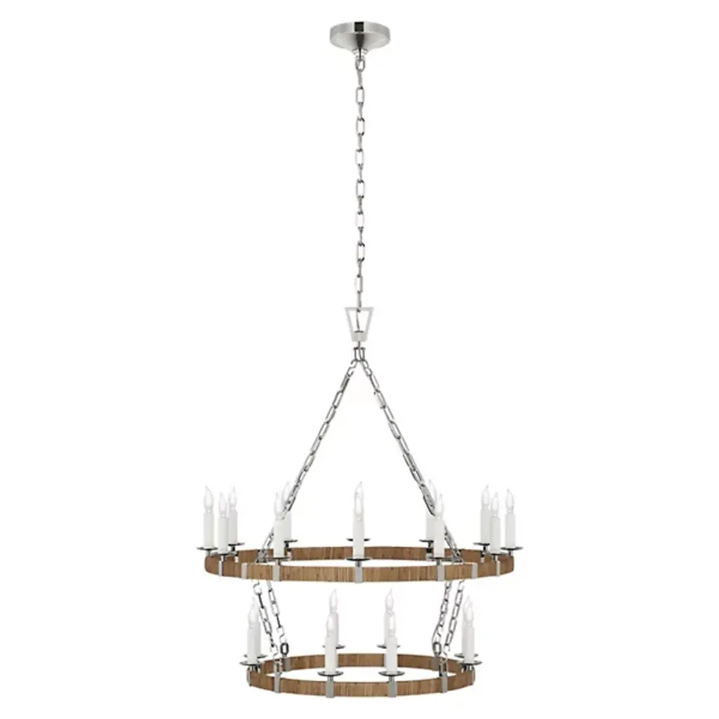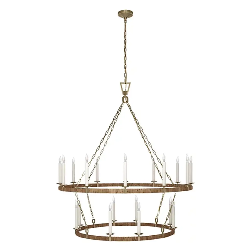Give your open spaces an elegant focal point with the ornate Darlana Two Tier Chandelier from Visual Comfort Signature. Designed by Chapman & Myers, this chandelier is arranged into 2 ring-shaped tiers. Your chandelier's framework is composed of fine steel. Linked chains facilitate your chandelier's suspension in midair. Candelabra bulbs pair beautifully with the piece's wax candle-inspired holders for an evocative silhouette and enveloping glow. The framework under the holders sports a gorgeous rattan wrap that's distinct all around. Easily adjust Darlana's brightness level through.