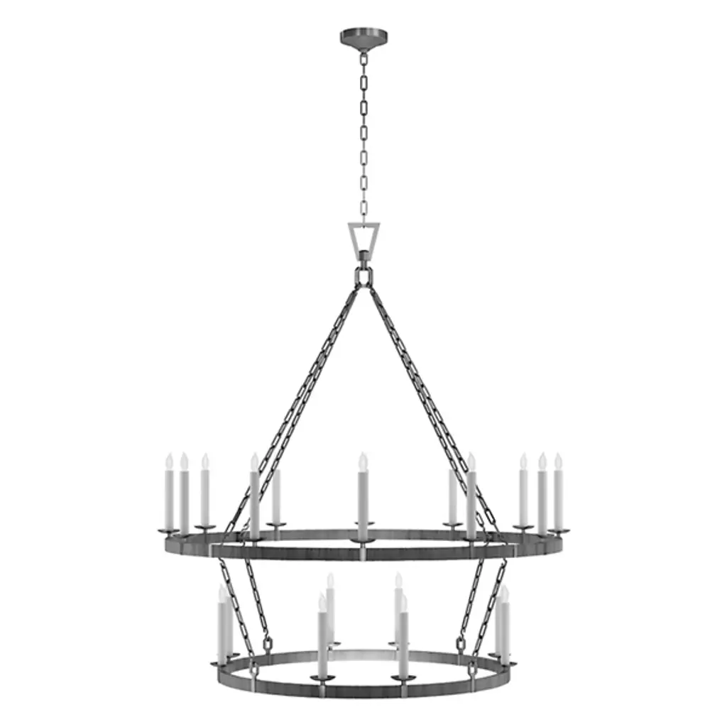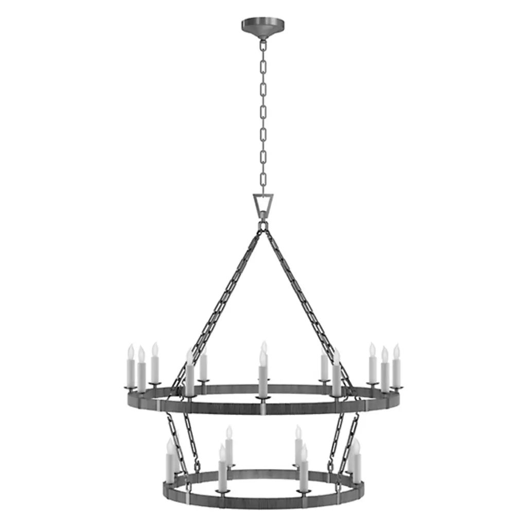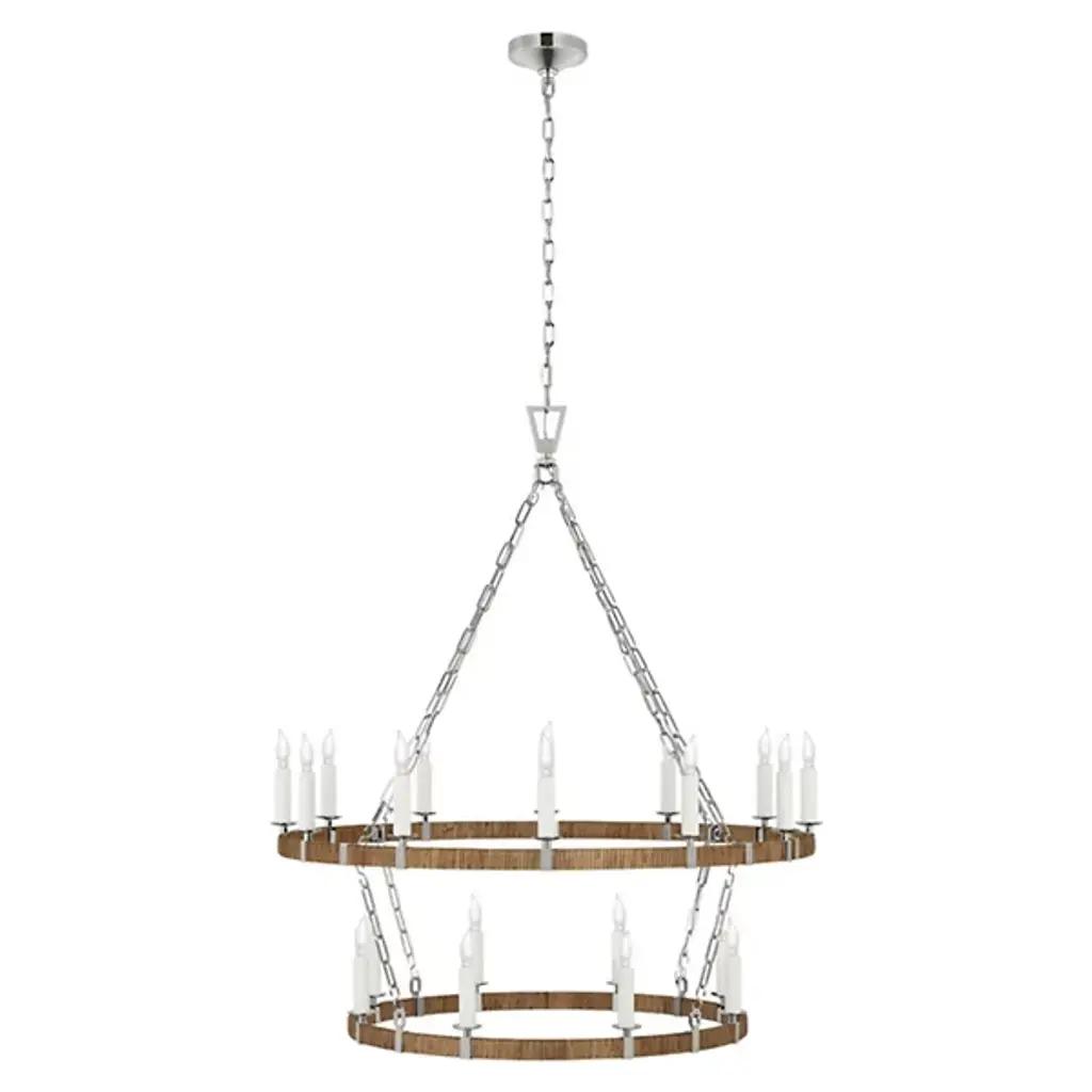 Give your open spaces an elegant focal point with the ornate Darlana Two Tier Chandelier from Visual Comfort Signature. Designed by Chapman & Myers, this chandelier is arranged into 2 ring-shaped tiers. Your chandelier's framework is composed of fine steel. Linked chains facilitate your chandelier's suspension in midair. Candelabra bulbs pair beautifully with the piece's wax candle-inspired holders for an evocative silhouette and enveloping glow. The framework under the holders sports a gorgeous rattan wrap that's distinct all around. Easily adjust Darlana's brightness level through.