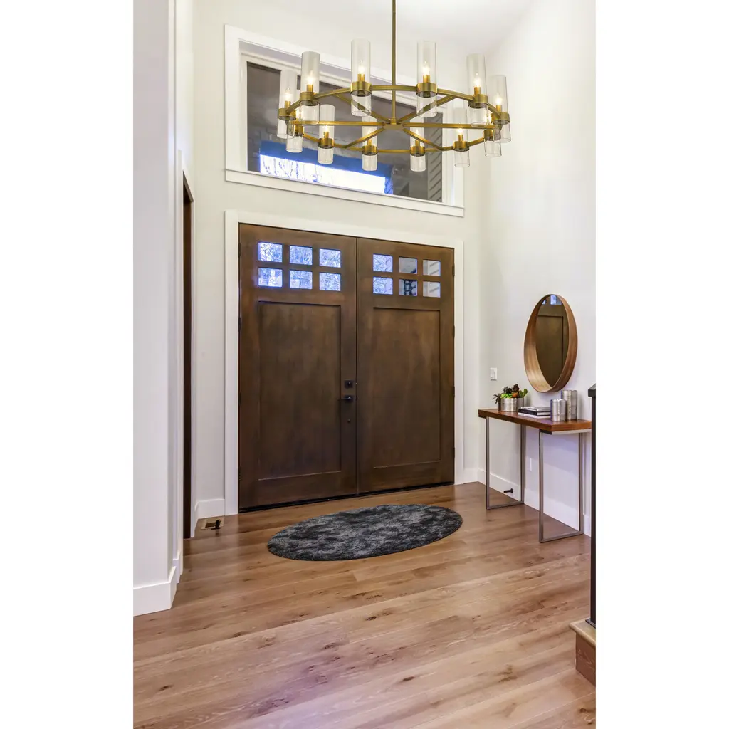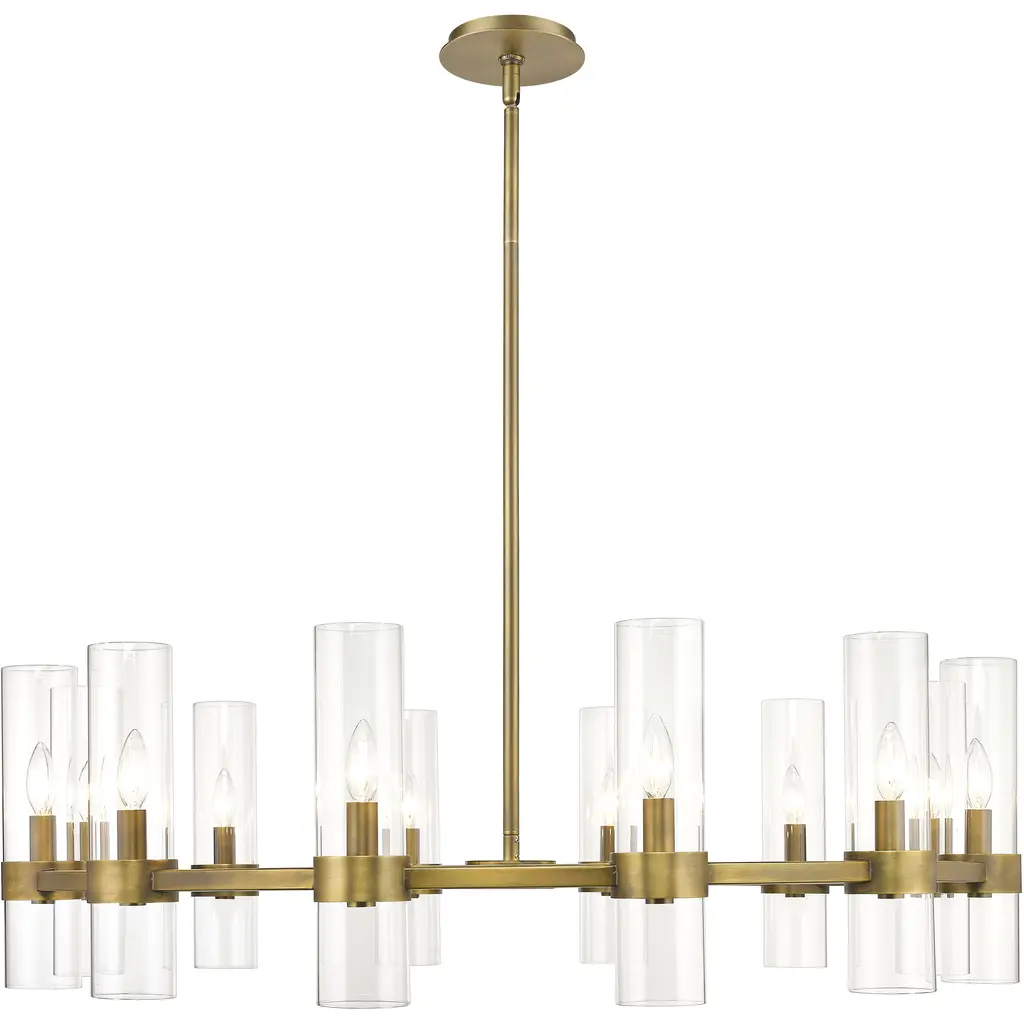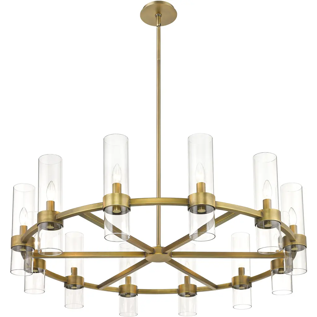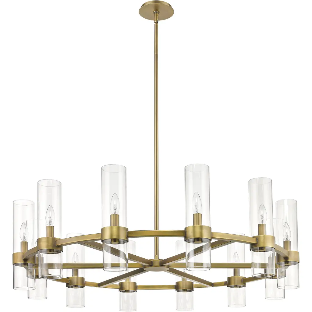 This contemporary twelve-light chandelier from the Datus collection features a slick round silhouette and a sense of simple elegance. Illuminate a foyer, dining area, or main living space with this circular-inspired chandelier featuring solid iron with a warm rubbed brass finish and delicate clear glass cylinders.