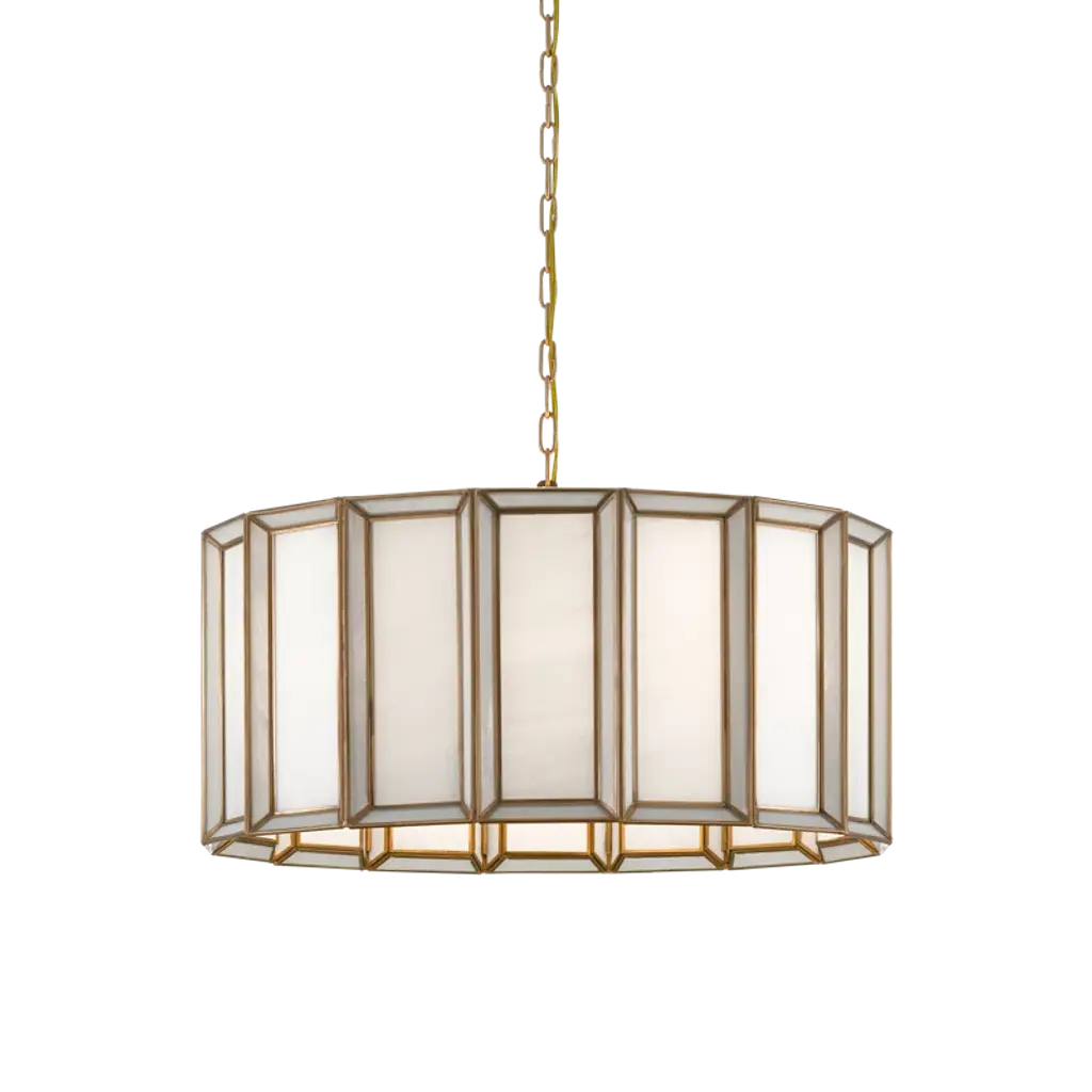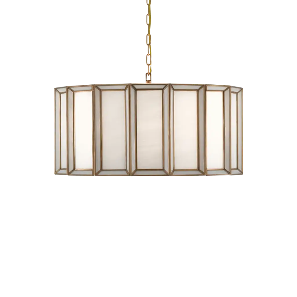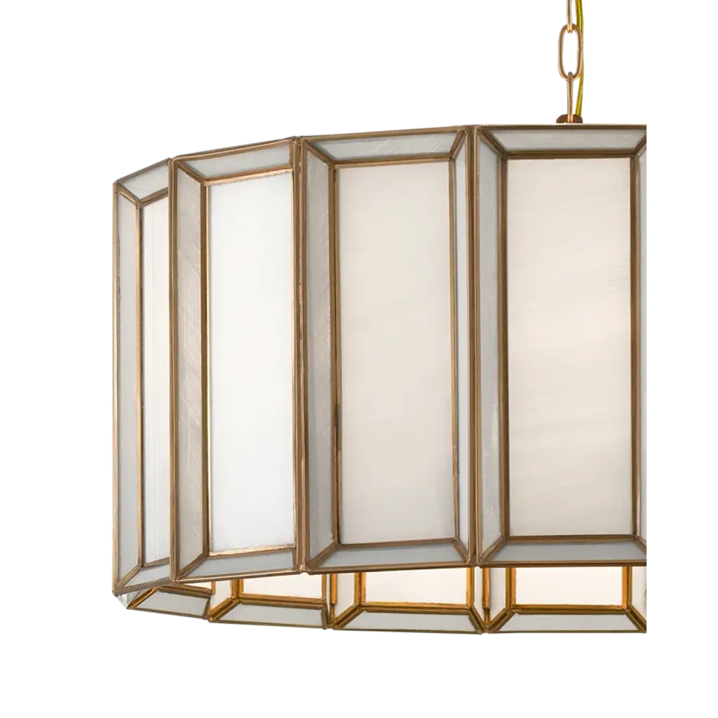 When a soft glow is desired, milk glass is one of the best materials to diffuse illumination. Our Daze Large Pendant is made of articulated panels of white milk glass that are joined together by ribs of metal in an antique brass finish. This white pendant, which joins a number of fixtures in the Daze family designed by Clarence Mallari, will turn luminous when it is switched on.