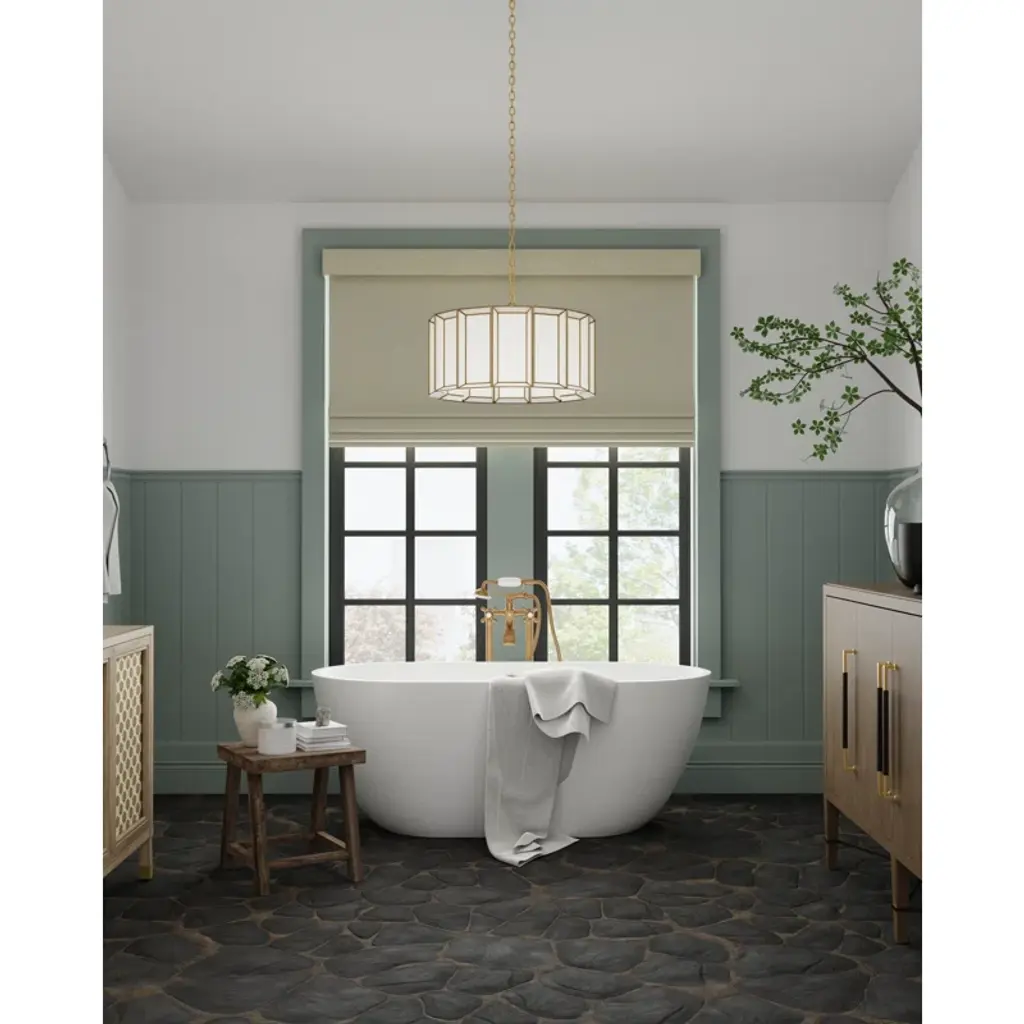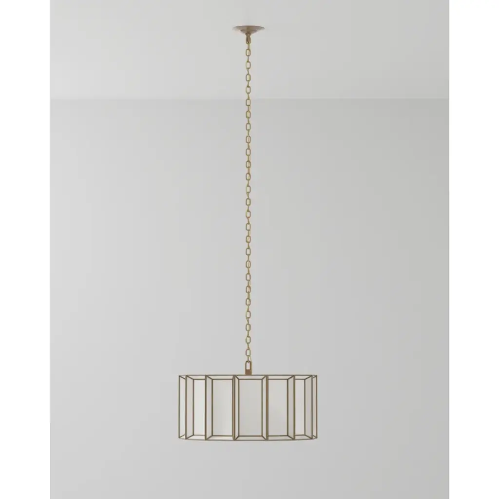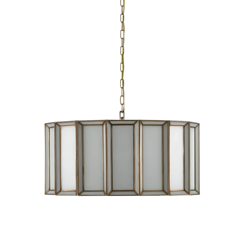 When a soft glow is desired, milk glass is one of the best materials to diffuse illumination. Our Daze Large Pendant is made of articulated panels of white milk glass that are joined together by ribs of metal in an antique brass finish. This white pendant, which joins a number of fixtures in the Daze family designed by Clarence Mallari, will turn luminous when it is switched on.
