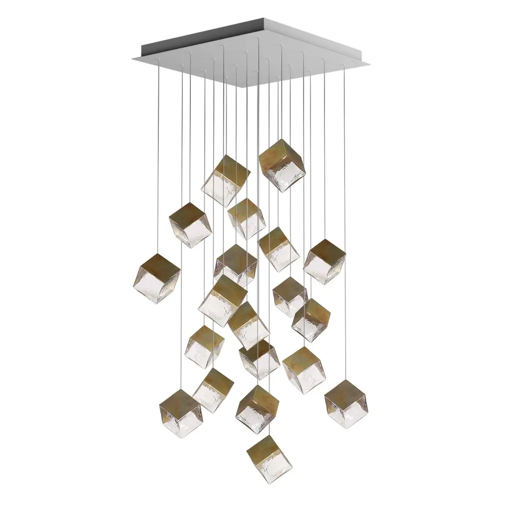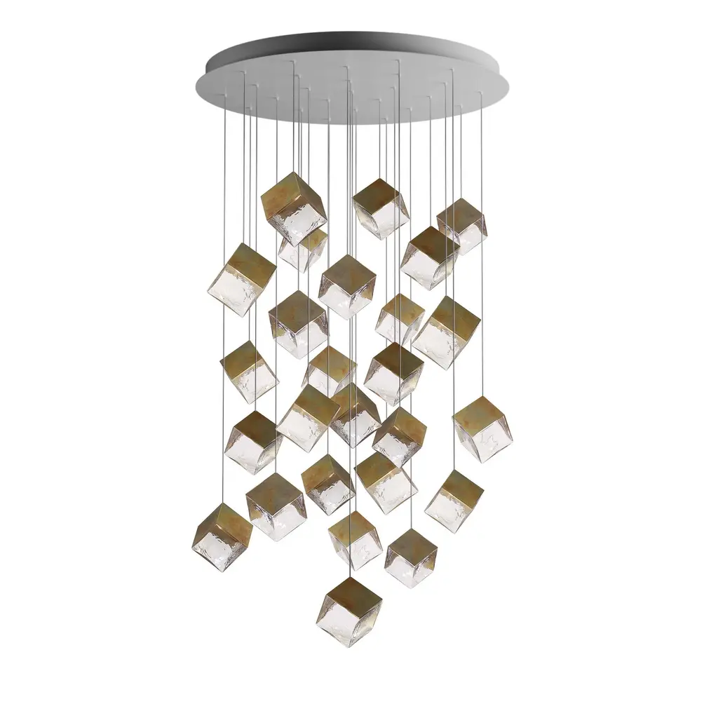 Indulge in total luxury with De Castelli x Pyrite Round Chandelier from Bomma. Featuring a hand-blown crystal cube encased in a DeOpale brass element, the golden firestone is transformed into an exquisite brass fitting with manual oxidation, creating vibrant and iridescent tones. Available in small and large sizes, this chandelier is the perfect statement maker for any entryway, dining room, or living space. Highlights