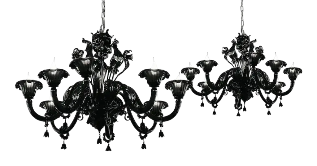 Finish: black nichel, shiny gold. Other finishes on request.Color: central body, arms, glasses are decorated with shades of tiffany color, of blue color, of amber color. The glass cup is entirely decorated in tiffany color, blue color or amber color. Other colors on request.Details: central body, arms, cup made in Venice. Hand-blown glasses made in Tuscany. Bracelets and decorative elements in metal filigree and with silver weldings are produced handmade on our drawing. Embellished with Swarovski® pendant. Shade 34/71 mod. cone with grey colour pongè fabric. Other lampshades on request.