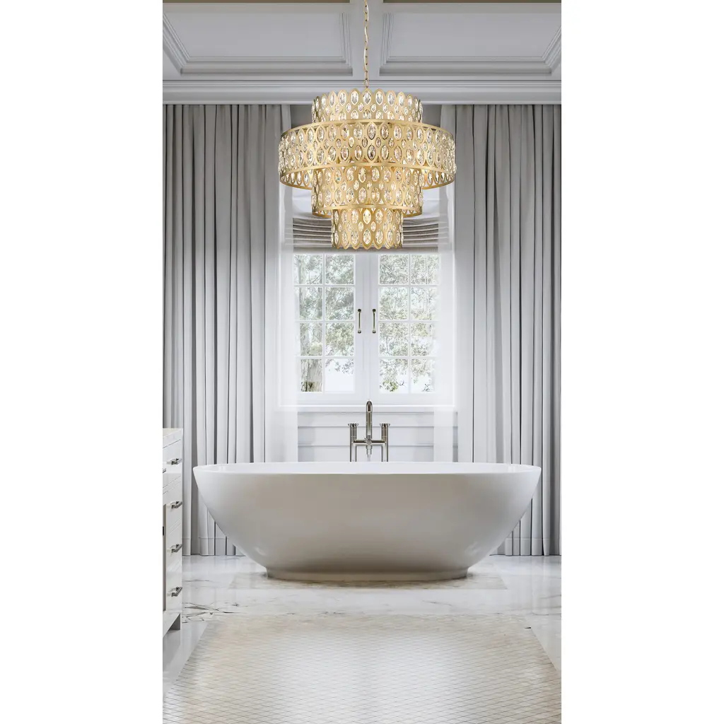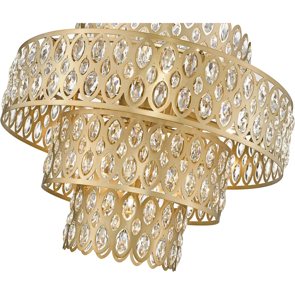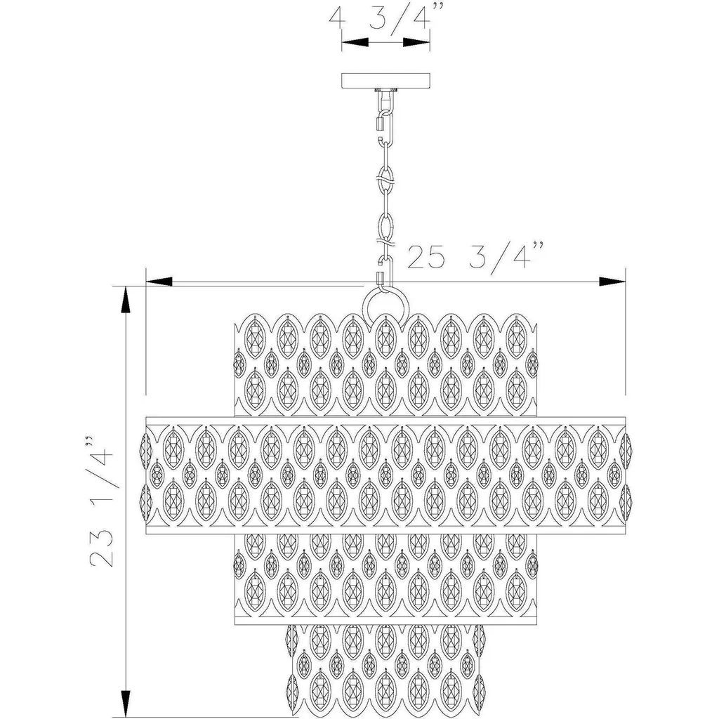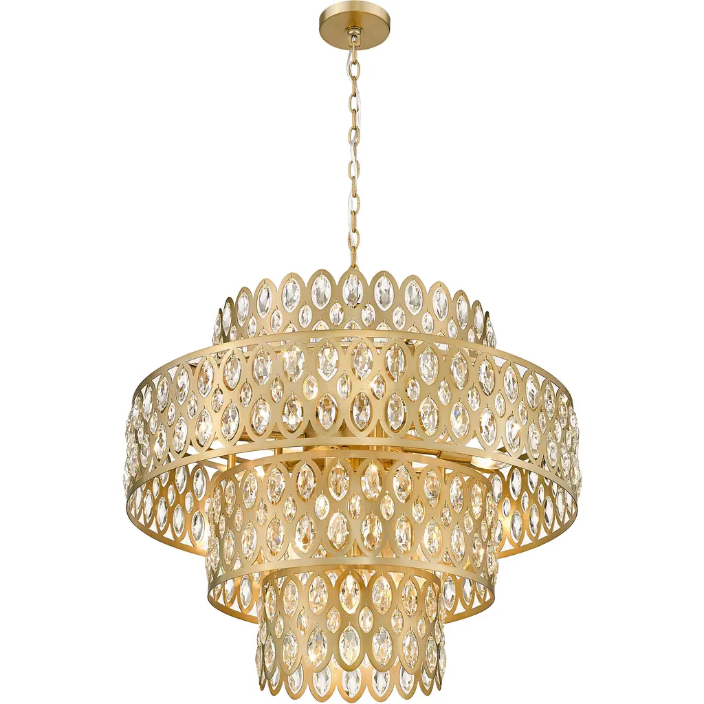 Layered drums create a tiered effect for the sparkling presentation of a modern glam 13-light pendant. Glittering oval crystals fill cut outs in each of the four drums with sophisticated ambiance, creating a rich and elegant look that blends beautifully in elegant living spaces. From the Dealey collection, this pendant offers a warm heirloom brass finish for a welcoming touch over a staircase or in a foyer.