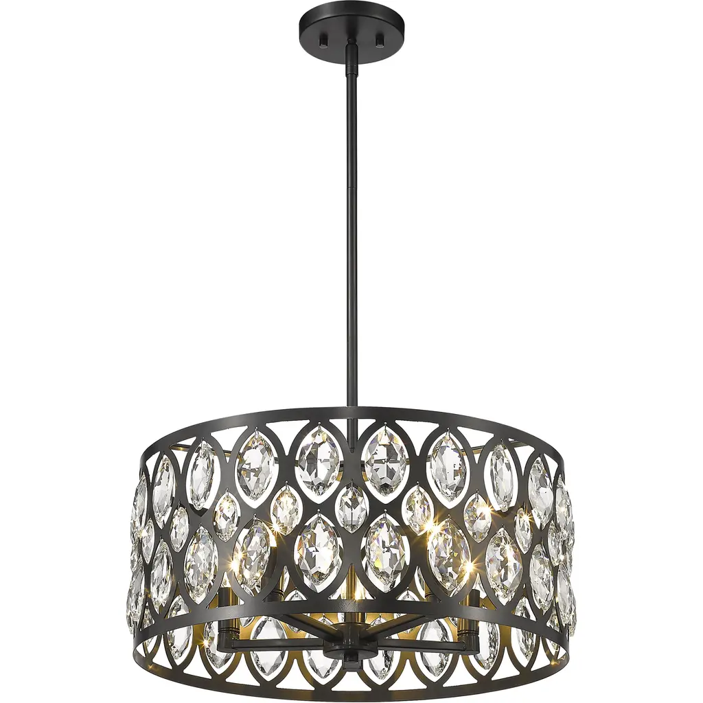 From the Dealey collection comes this graceful and round five-light chandelier. This chandelier also features a dark matte black steel shade with a repeating ellipse-style design, hung with shimmering clear crystal pendants that lend a glamorous flair. Place this chandelier above a table in a transitional dining room for a sophisticated look.