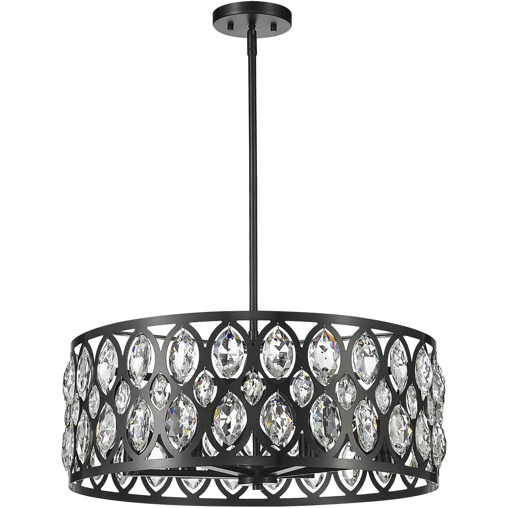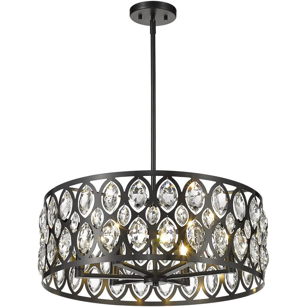 From the Dealey collection comes this elegant, round six-light chandelier. Featuring a striking ellipse-carved steel shade circling each of the six candelabras, this chandelier also features a dark matte black finish that accentuates the dangling, shimmering clear crystal pendants that disperse the light. Hang this alluring chandelier above a contemporary dining room table to lend a traditional touch.