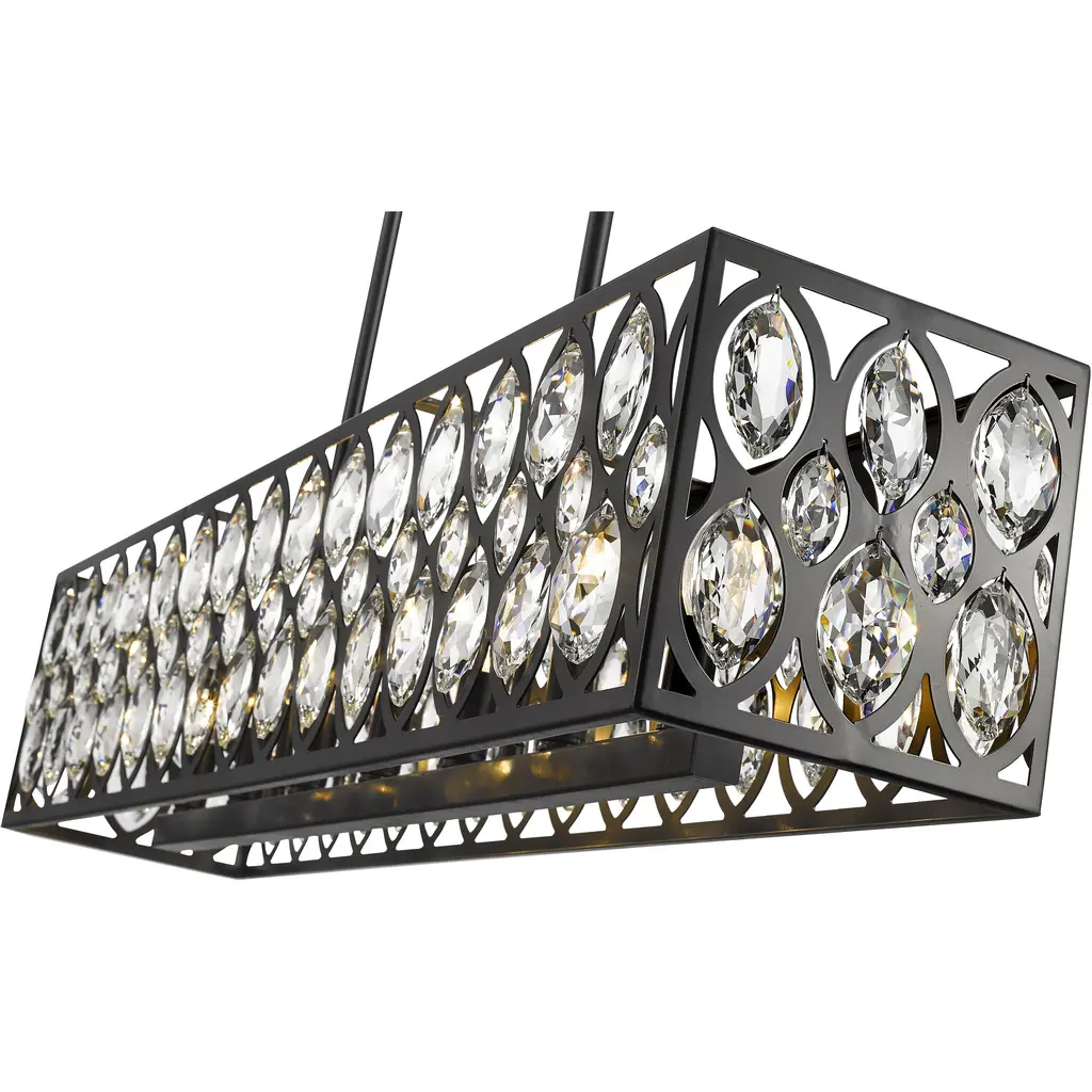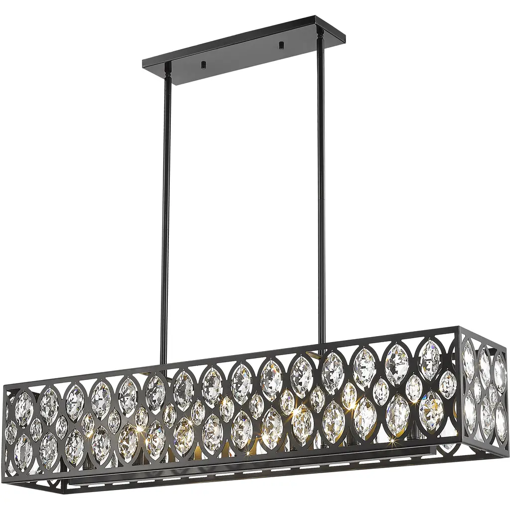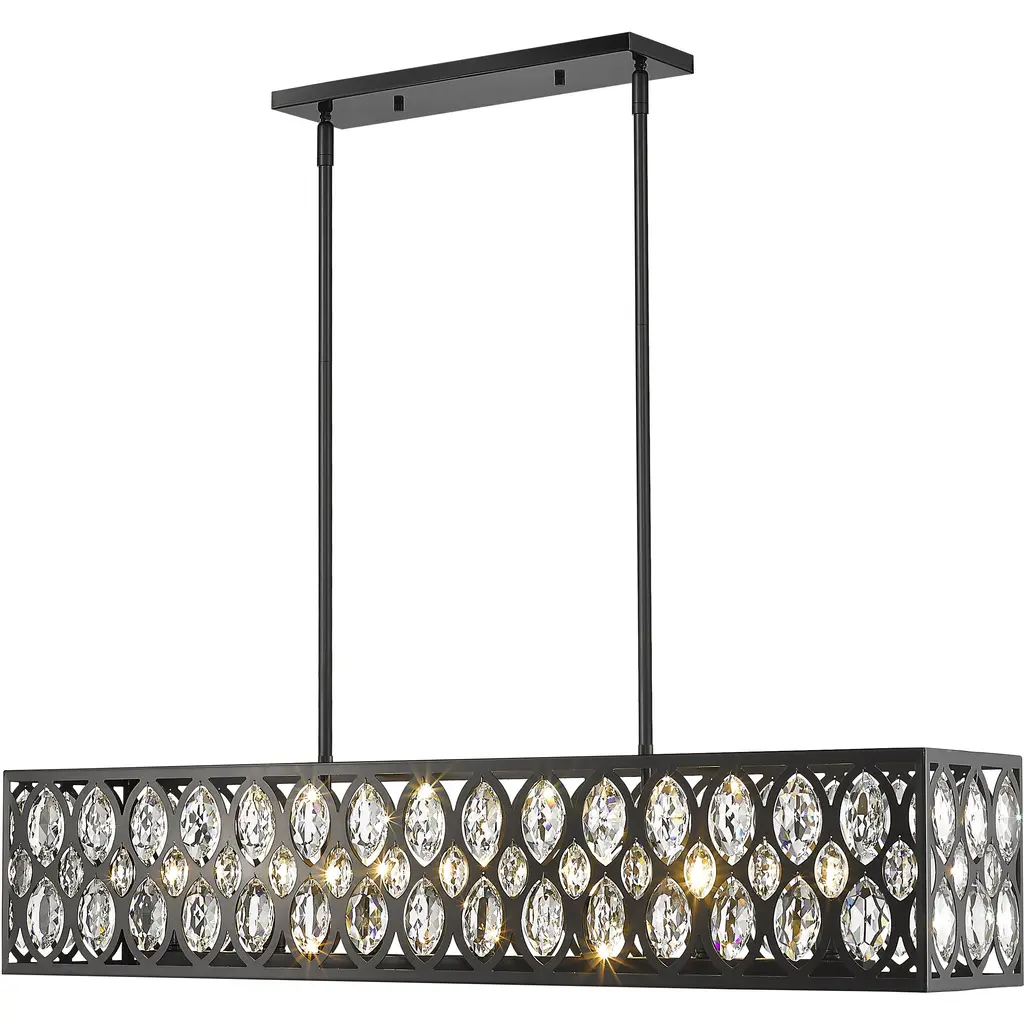 From the Dealey collection comes this contemporary seven-light chandelier, featuring a box-like rectangular design and held by two rod supports. Its elegant steel shade is punched with an ellipse-style motif, each set with a glimmering clear crystal pendant that adds stark contrast against the dark matte black finish. With an elongated shape, this chandelier spreads a warm, even glow across a wide dining table or along a hallway, adding a touch of glamour as well.