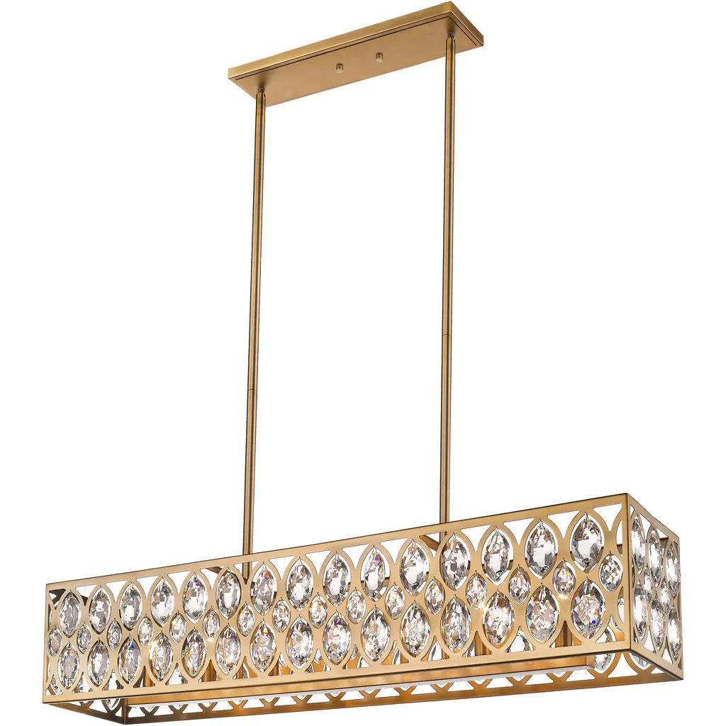 Complete a vintage-inspired living area with the elongated style of this hanging ceiling light. The open rectangular shade boasts a radiant heritage brass finish that encases reflective crystal accents.