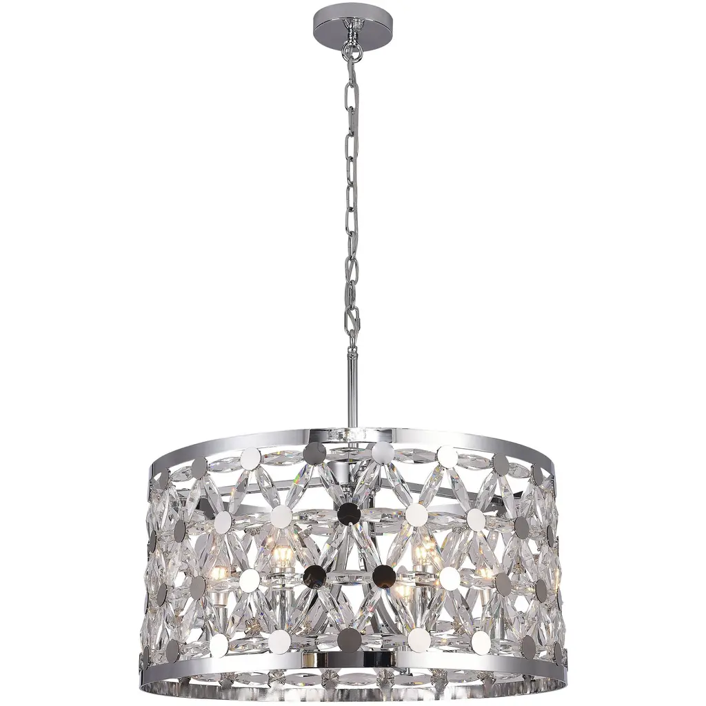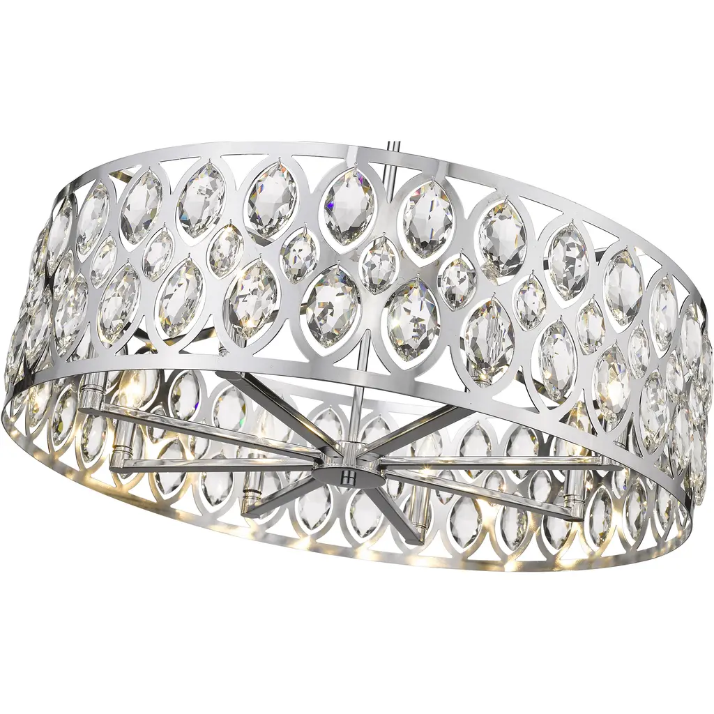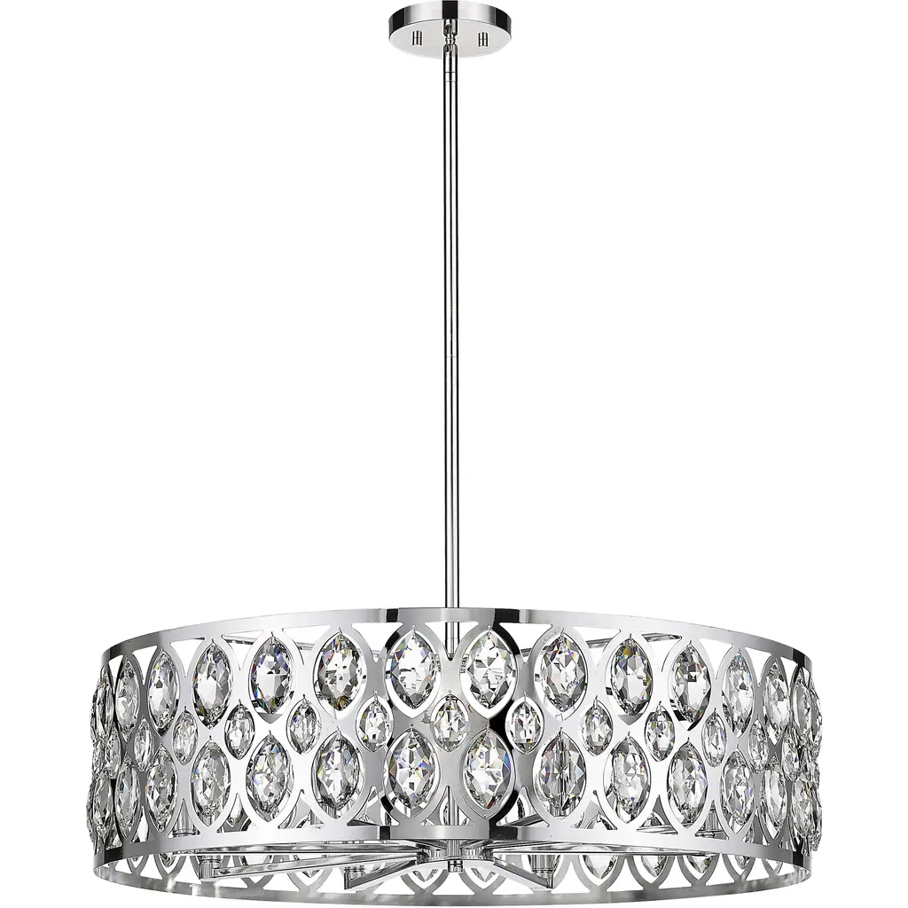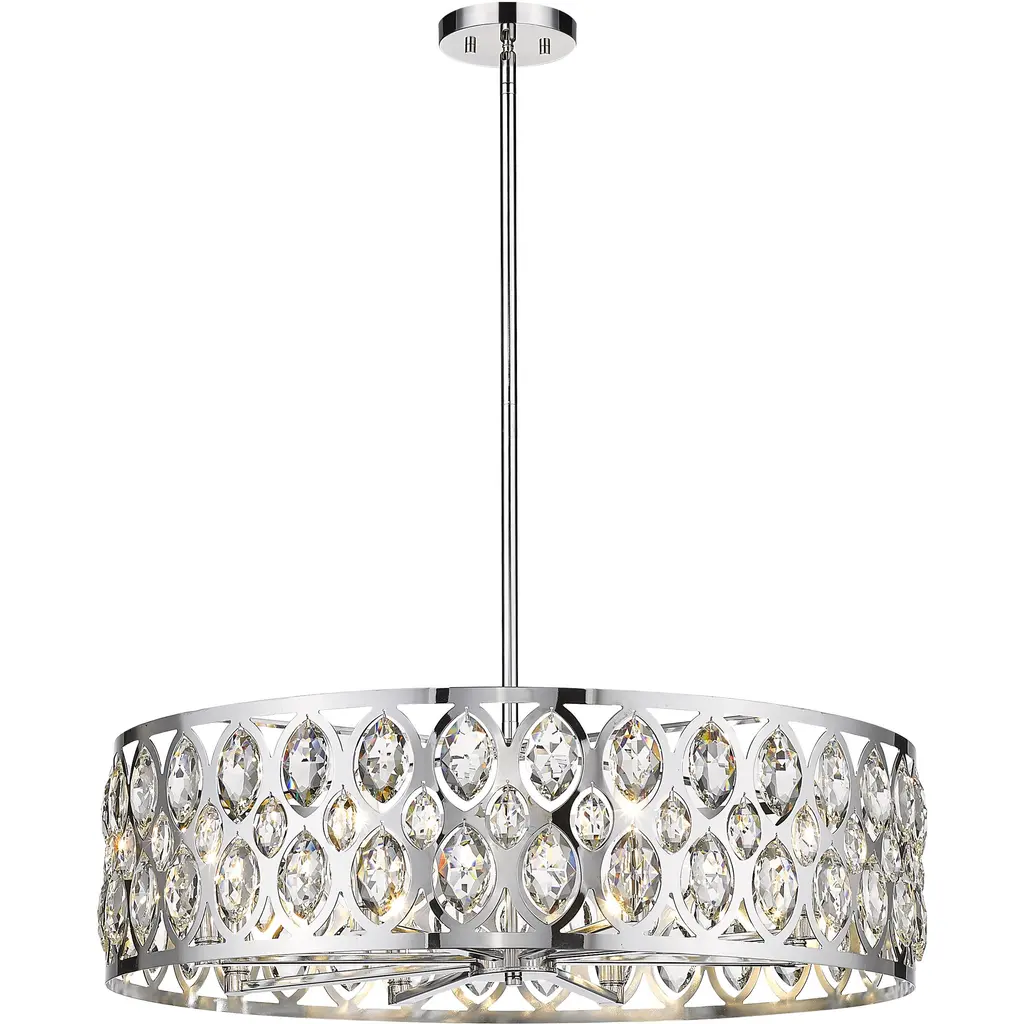 From the Dealey collection comes this elegant and wide eight-light chandelier. Featuring a round steel shade in a lustrous chrome finish, this lighting piece boasts an ellipse-carved pattern, each possessing a glimmering clear crystal pendant that dangles within. This charming and glamorous contemporary chandelier makes a wonderful addition to a great room or even hung above an entryway foyer.