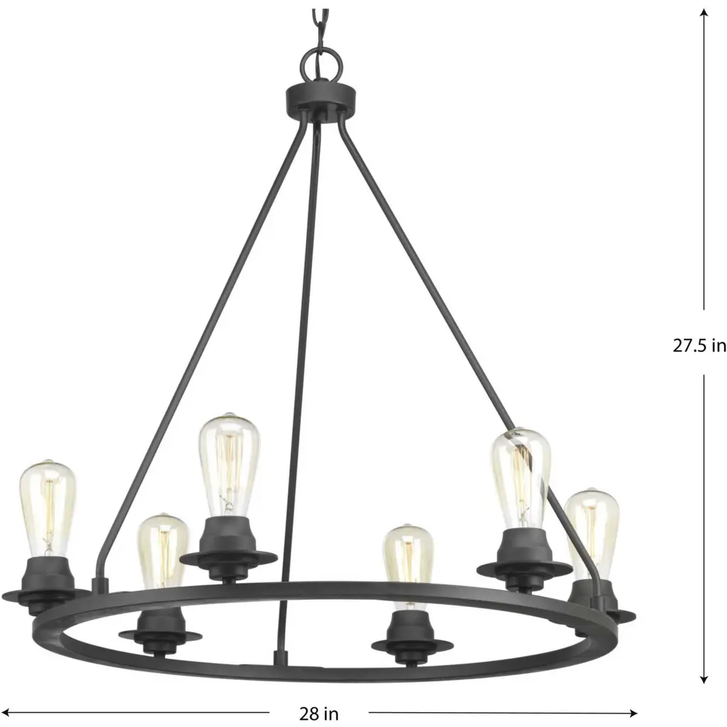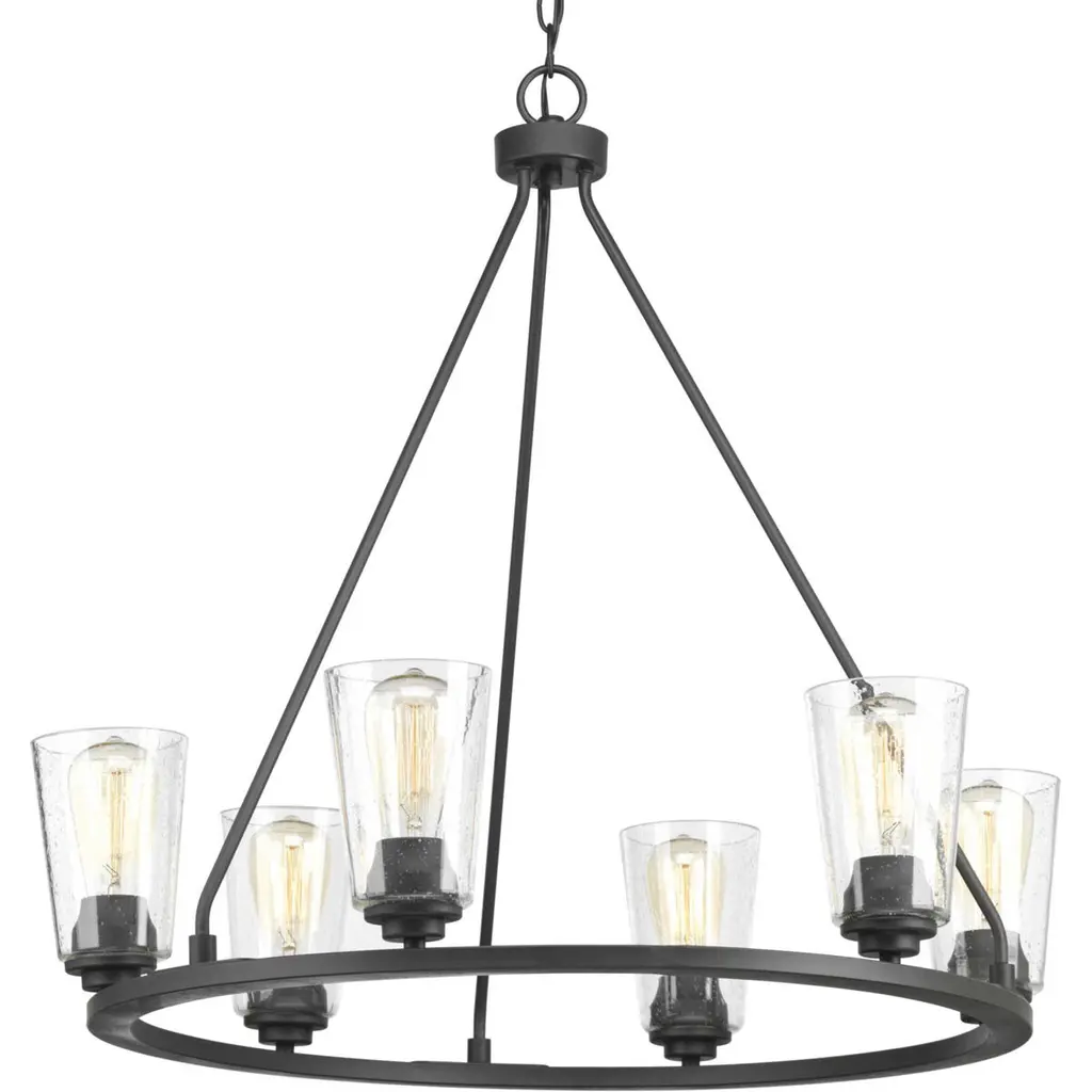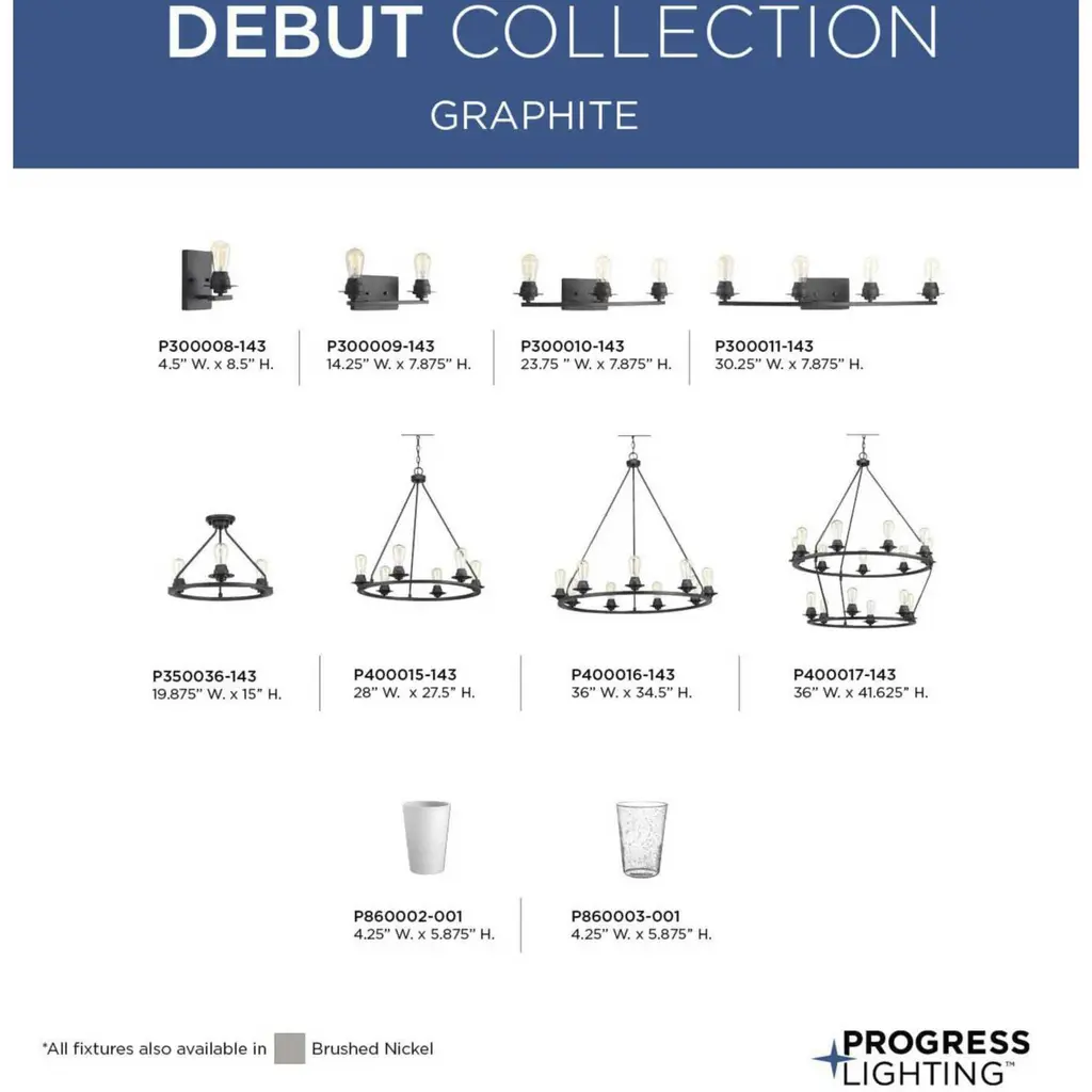 A new category of vintage modern fixtures takes center stage with this six-light chandelier from one of our Design Series collections. Delicate details in a Graphite finish, create statement making focal pieces for a variety of interiors. Debut provides a fitting stage to feature nostalgic, vintage lamps. Glass accessory shades available in clear or frosted seeded finishes (sold separately).