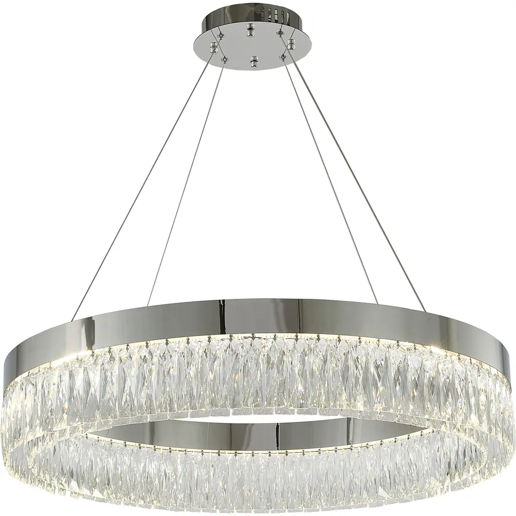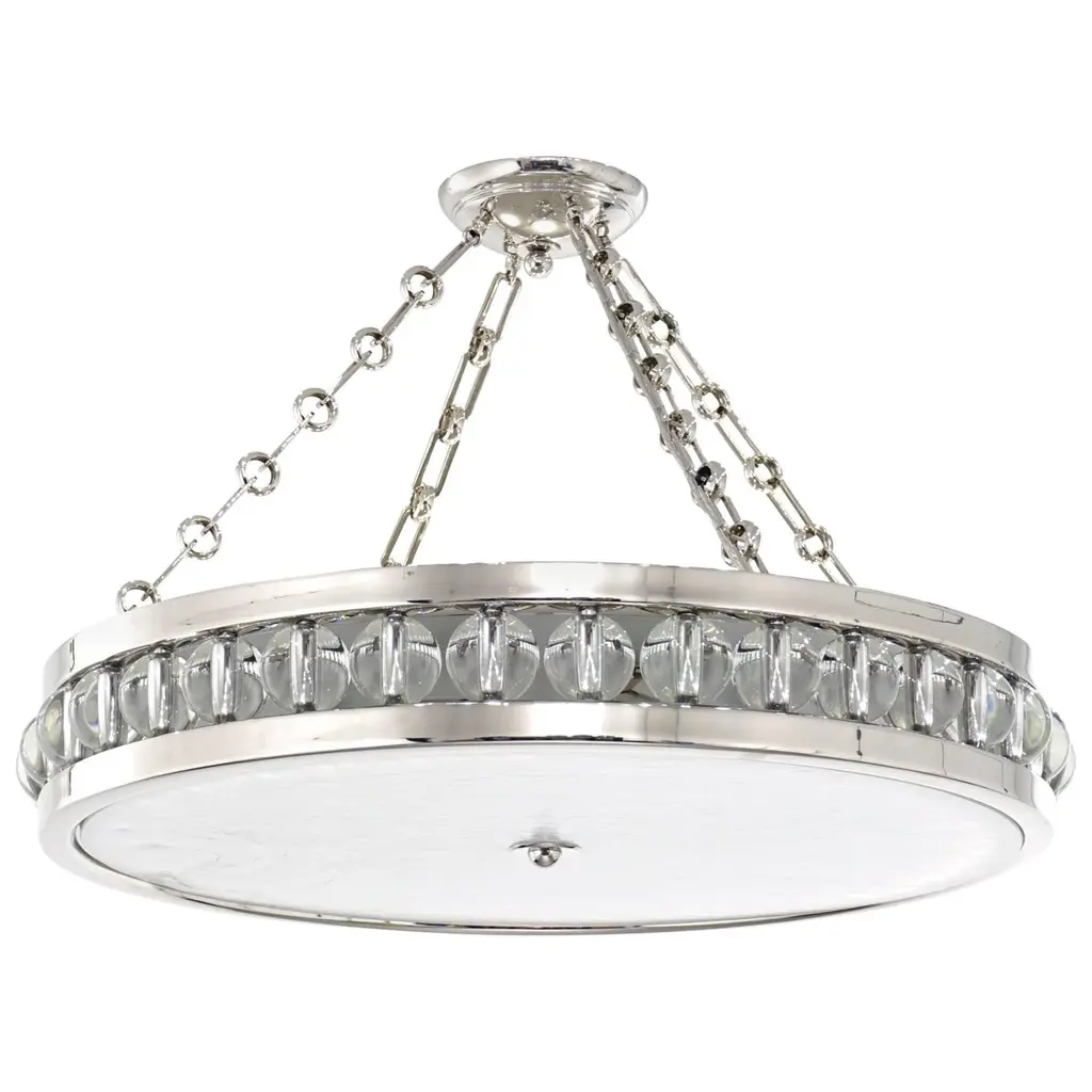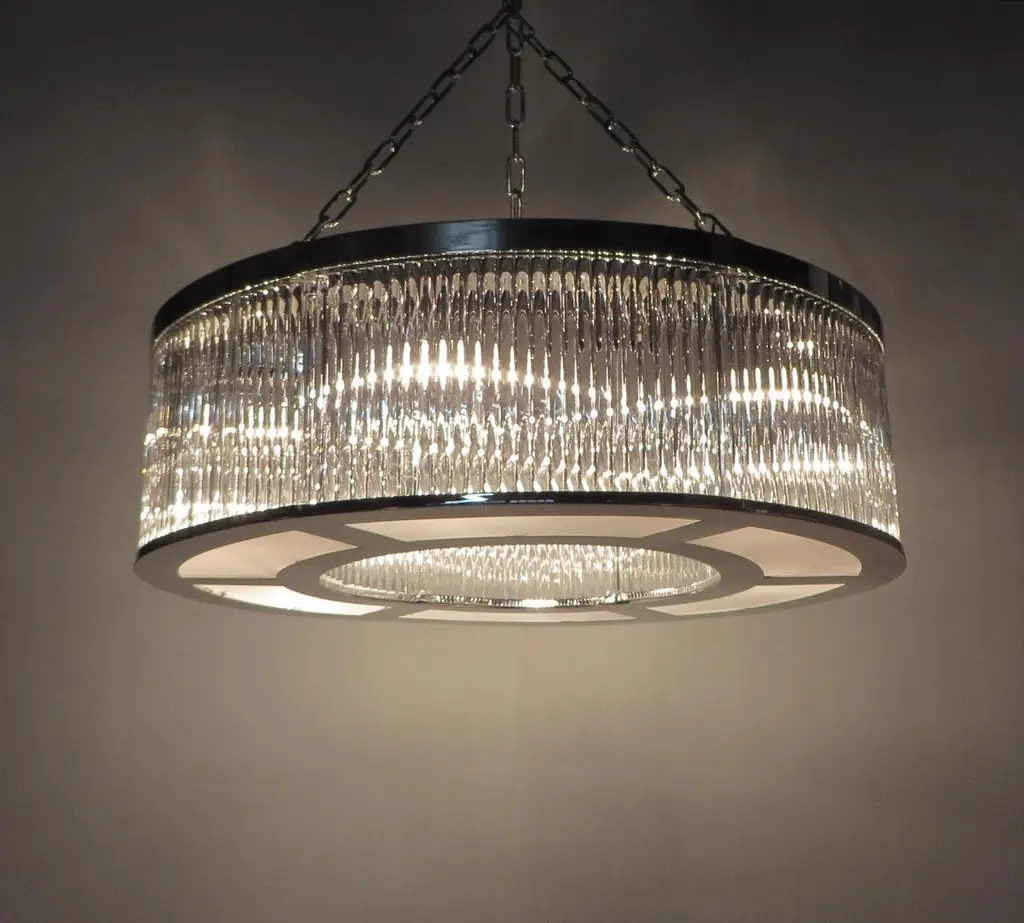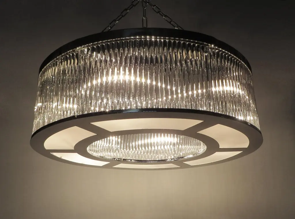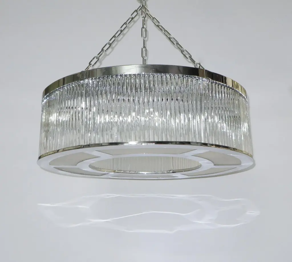 Italian art deco style drum chandelier with double layers of thin clear Murano glass rods mounted on chrome finish structure / Made in Italy by Fabio Ltd8 lights / E26 or E27 type / max 60W eachMeasures: diameter 31.5 inches, height 12 inches plus chain and canopyOrder only / This item ships from Italy Order Reference #: FABIOLTD C845