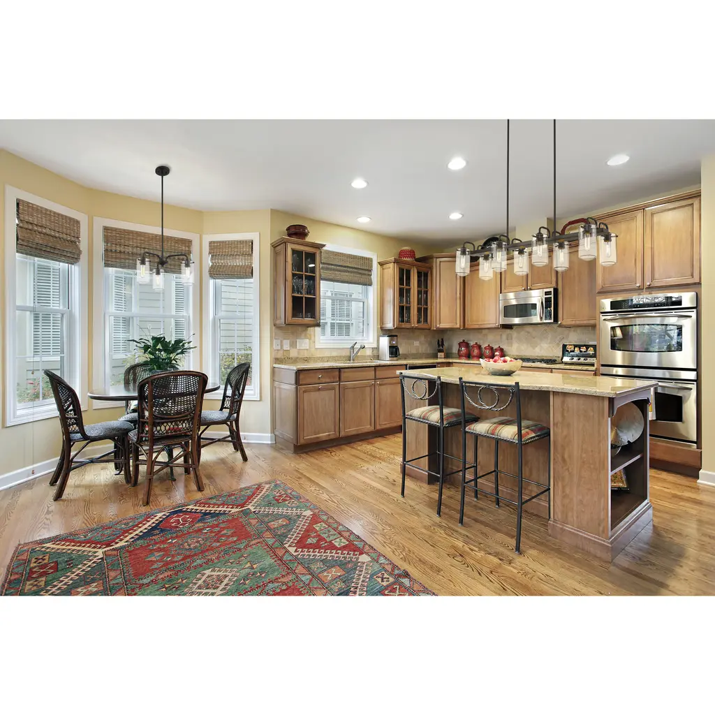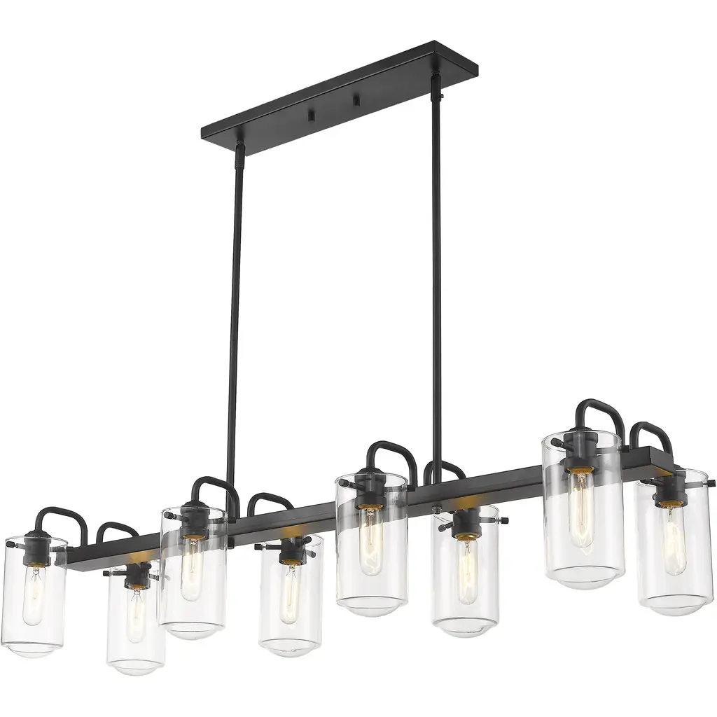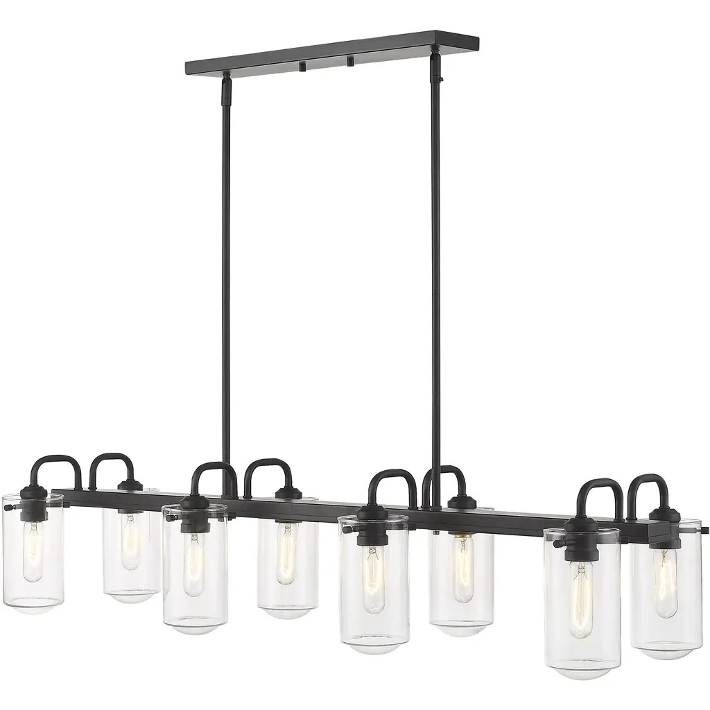 This elegant eight-light island chandelier focuses attention in a kitchen or entertaining space. Enjoy the dynamic contrast of black finish metal and clear glass shades, fashioned in an artful and charming industrial theme.