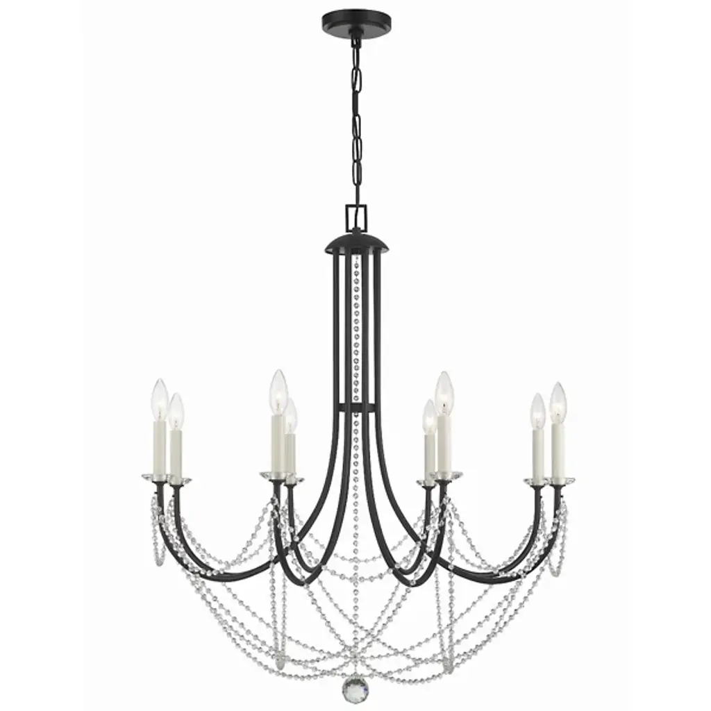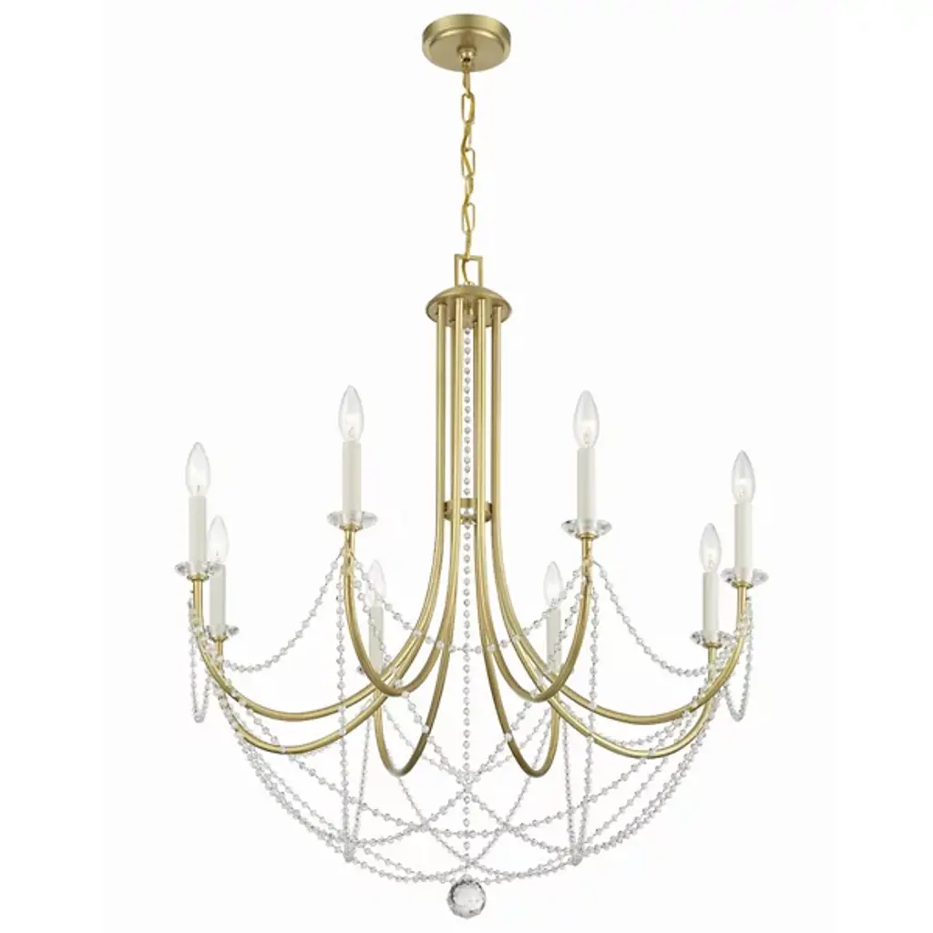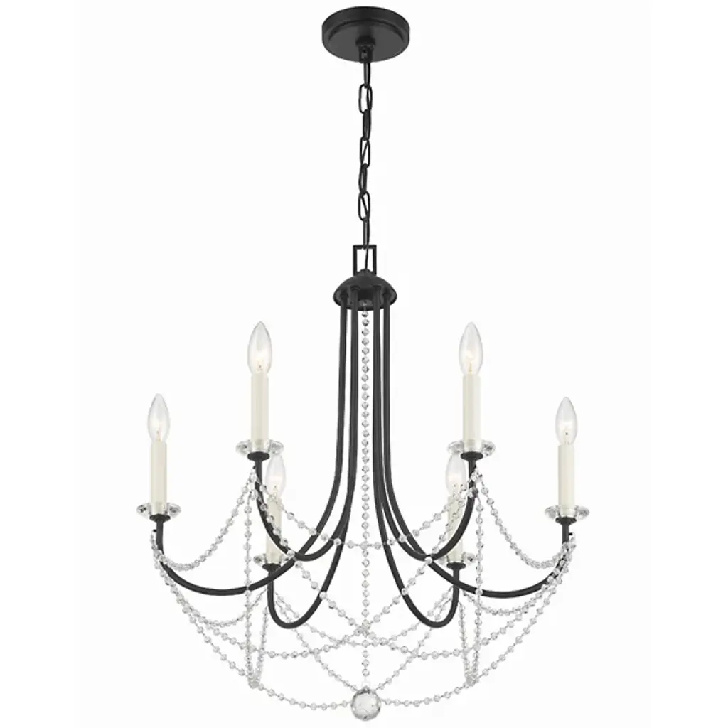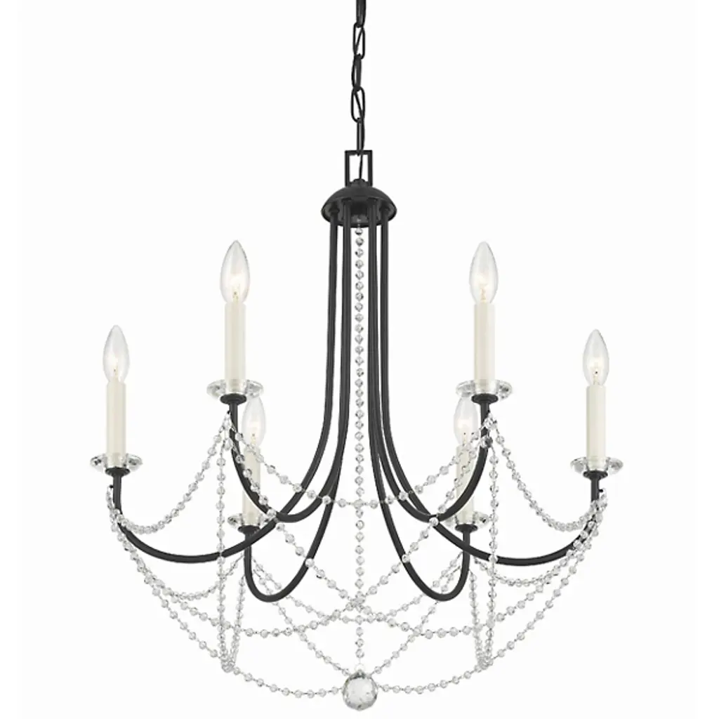 The captivating Delilah Chandelier from Crystorama elevates any interior, making a bold statement in every room. Its graceful swooping metal frame delicately suspends cascading crystal beads from each arm, creating a mesmerizing visual display. This modern-style crystal chandelier adds a touch of opulence and formality to any space, enhancing the ambiance with its rich and luxurious appearance. Meticulously designed as the ultimate final touch, this exquisite light fixture exudes sophistication, becoming a captivating focal point that enhances the overall allure of the space.