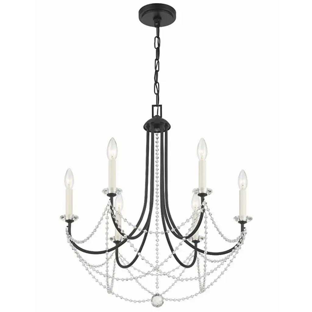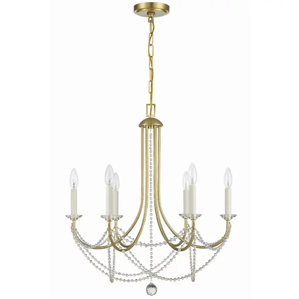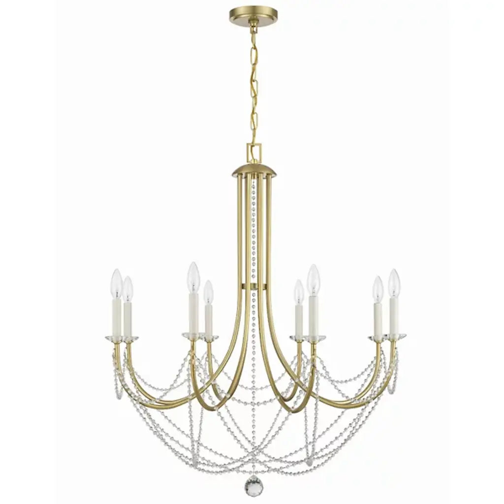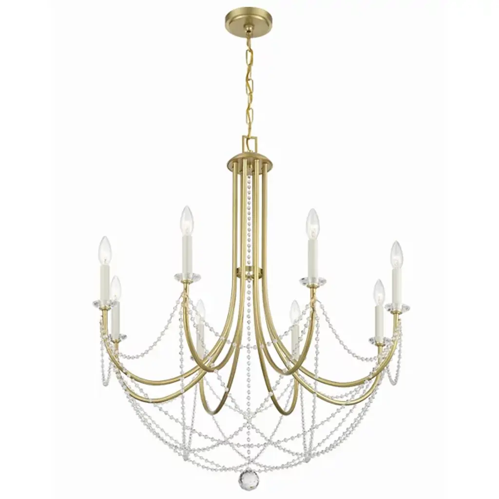 The captivating Delilah Chandelier from Crystorama elevates any interior, making a bold statement in every room. Its graceful swooping metal frame delicately suspends cascading crystal beads from each arm, creating a mesmerizing visual display. This modern-style crystal chandelier adds a touch of opulence and formality to any space, enhancing the ambiance with its rich and luxurious appearance. Meticulously designed as the ultimate final touch, this exquisite light fixture exudes sophistication, becoming a captivating focal point that enhances the overall allure of the space.