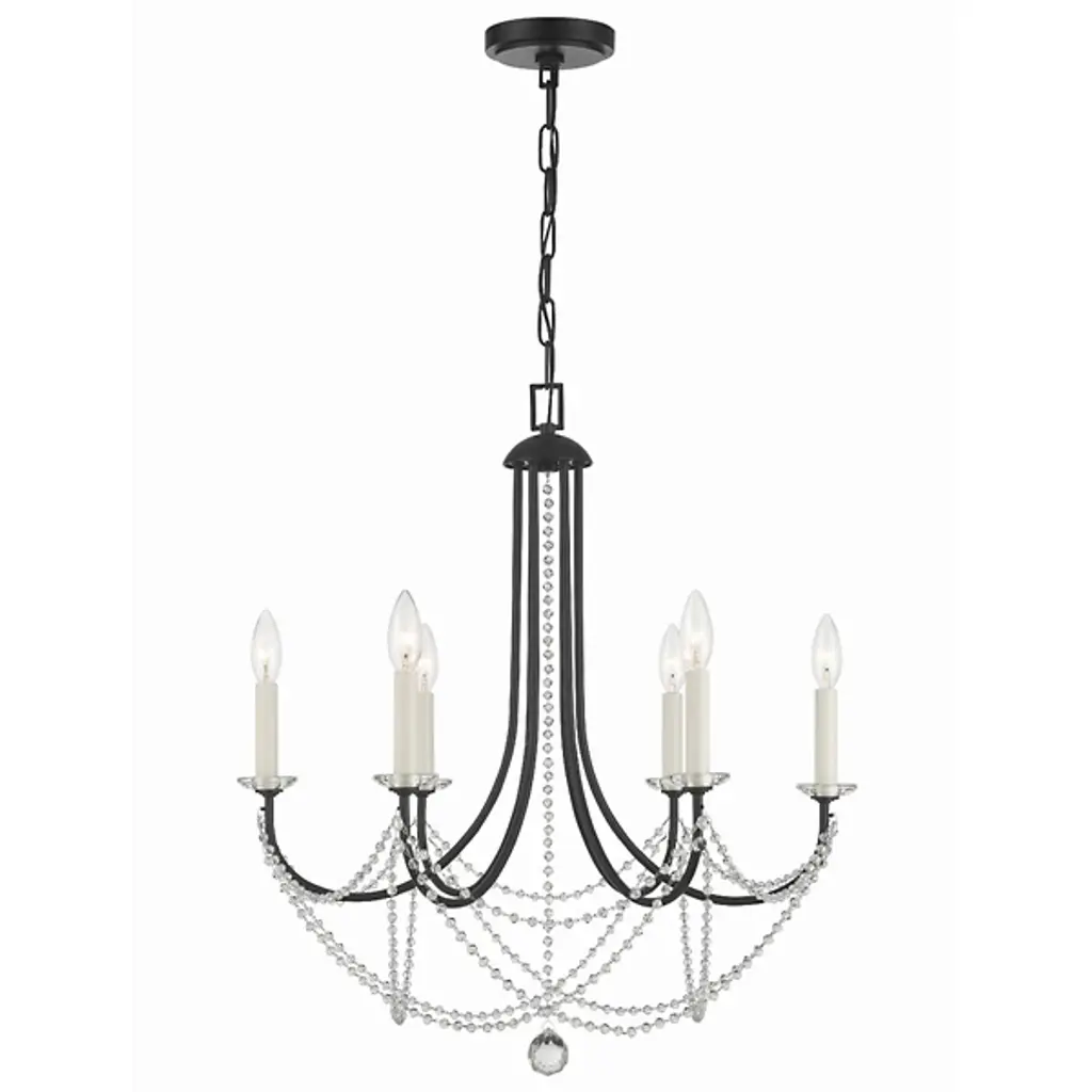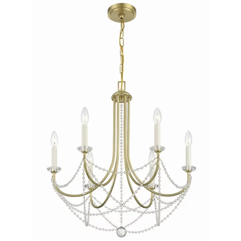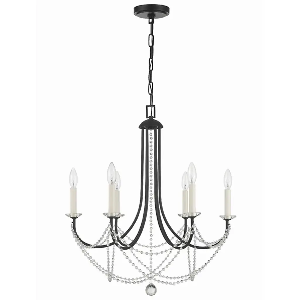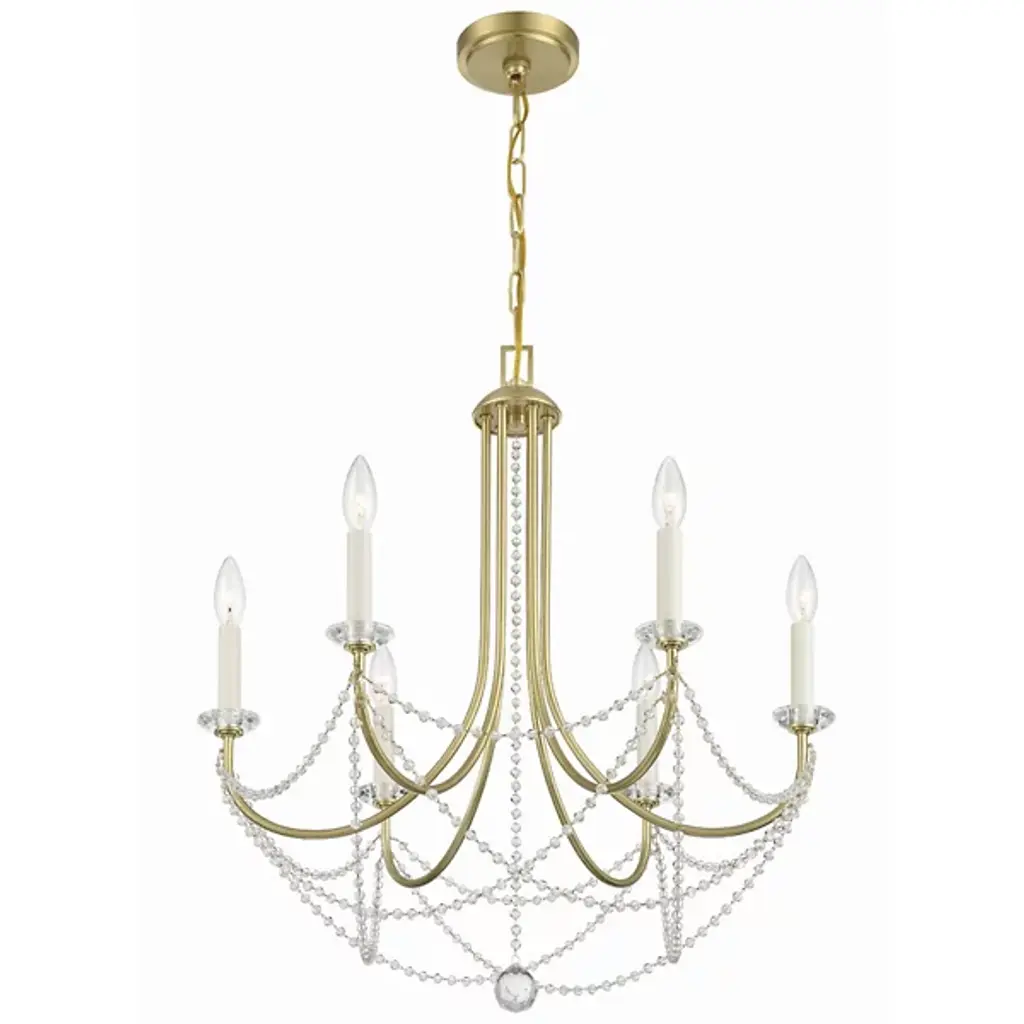 The captivating Delilah Chandelier from Crystorama elevates any interior, making a bold statement in every room. Its graceful swooping metal frame delicately suspends cascading crystal beads from each arm, creating a mesmerizing visual display. This modern-style crystal chandelier adds a touch of opulence and formality to any space, enhancing the ambiance with its rich and luxurious appearance. Meticulously designed as the ultimate final touch, this exquisite light fixture exudes sophistication, becoming a captivating focal point that enhances the overall allure of the space.
