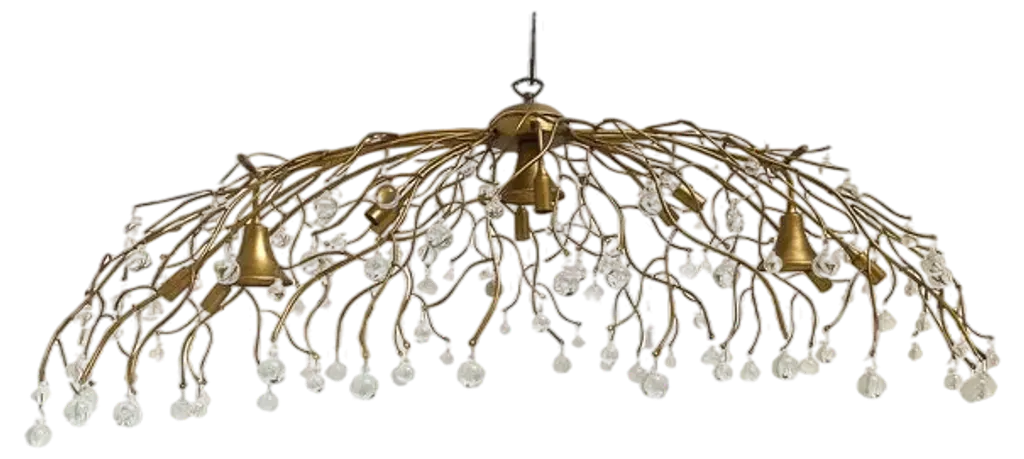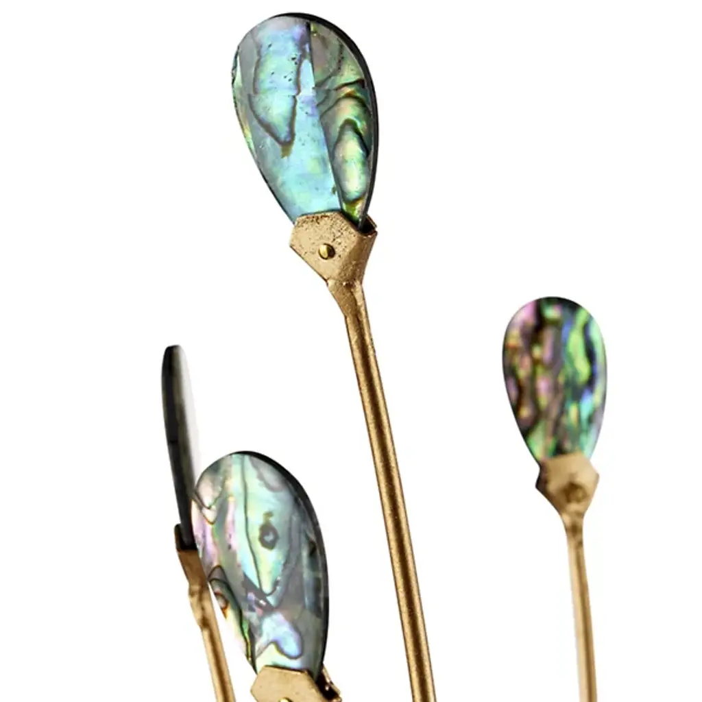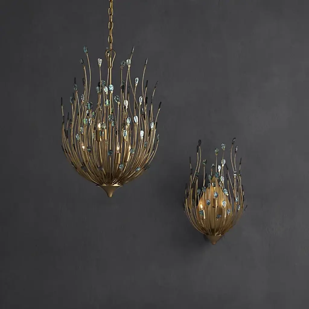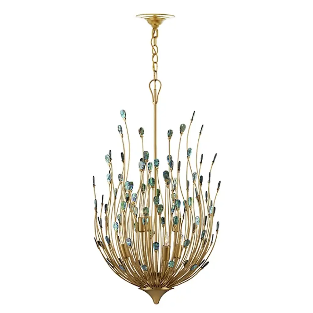 The Delphos Chandelier by Currey & Company takes its inspiration from the grace of birds and feathers, nodding at the upswept elegance and vibrant colors of a peacock's tail. The fixture is crafted with meticulous attention, its teardrop-shaped accents featuring wrought iron in a contemporary gold finish. Adorned with double-sided, highly polished New Zealand Paua Shells, the chandelier is a masterpiece of craftsmanship. Hand-bent rods form the undulant composition, ascending from a conical hub at the base of a fine chain, and the luminous shells are painstakingly hand-placed. With iridescent hues that vary within each shell, this turquoise and gold chandelier brings lively color to any interior, seamlessly blending nature-inspired and transitional styles.