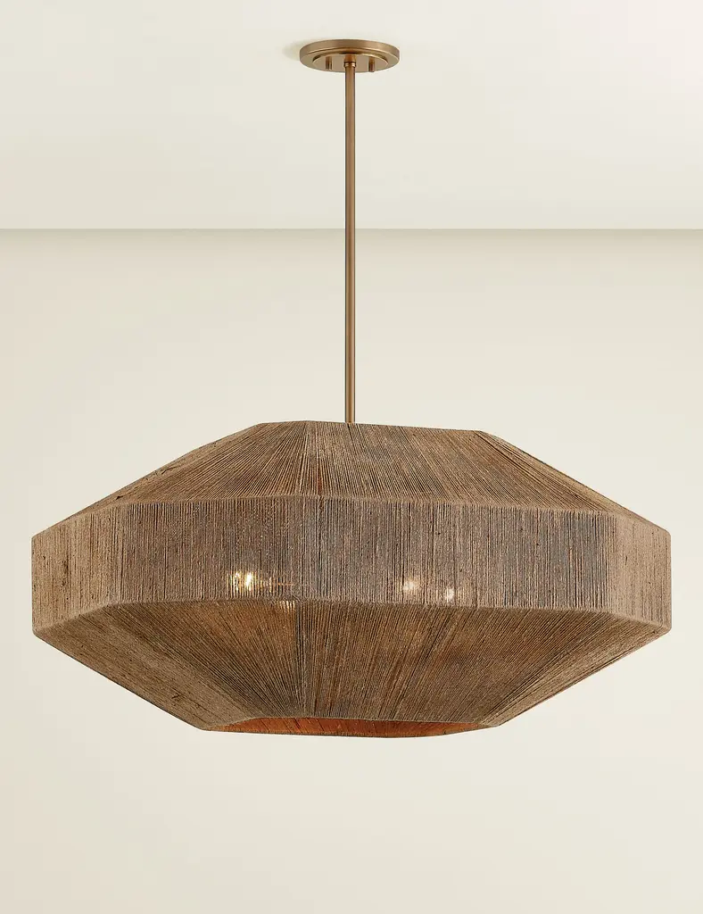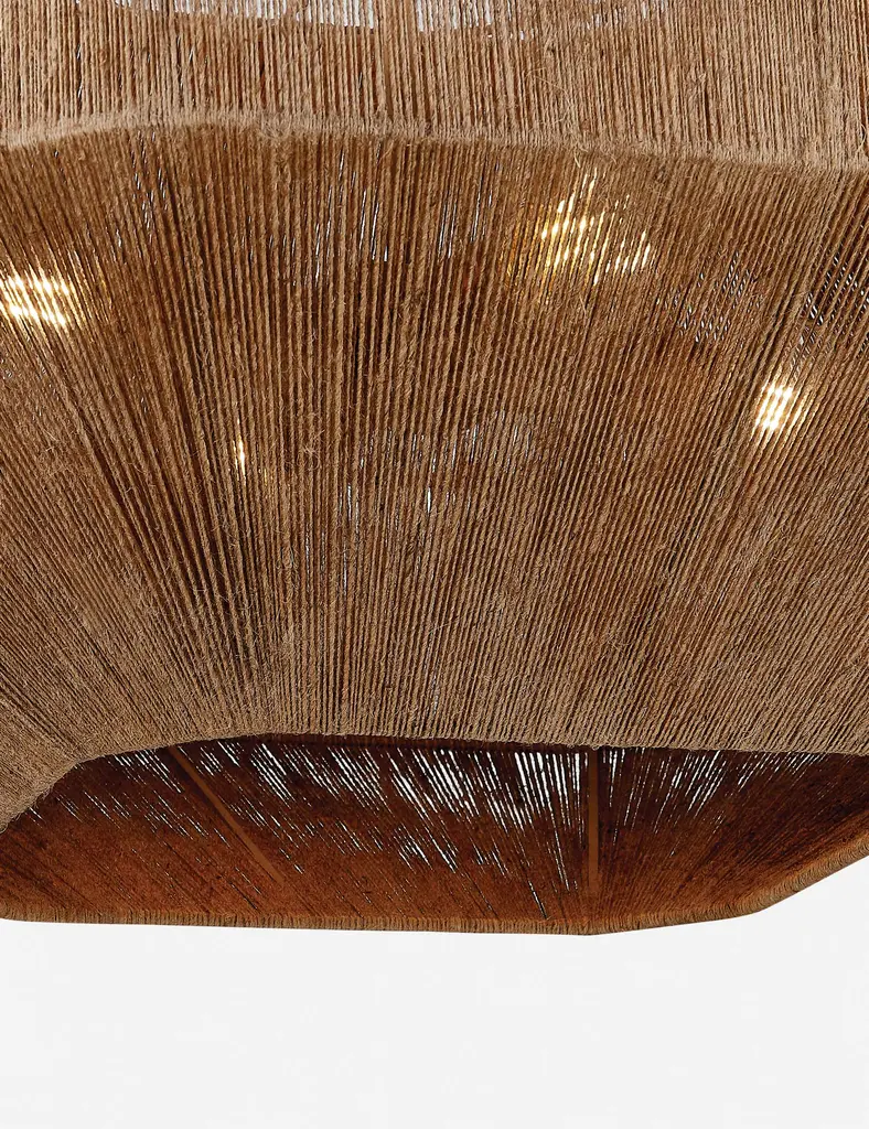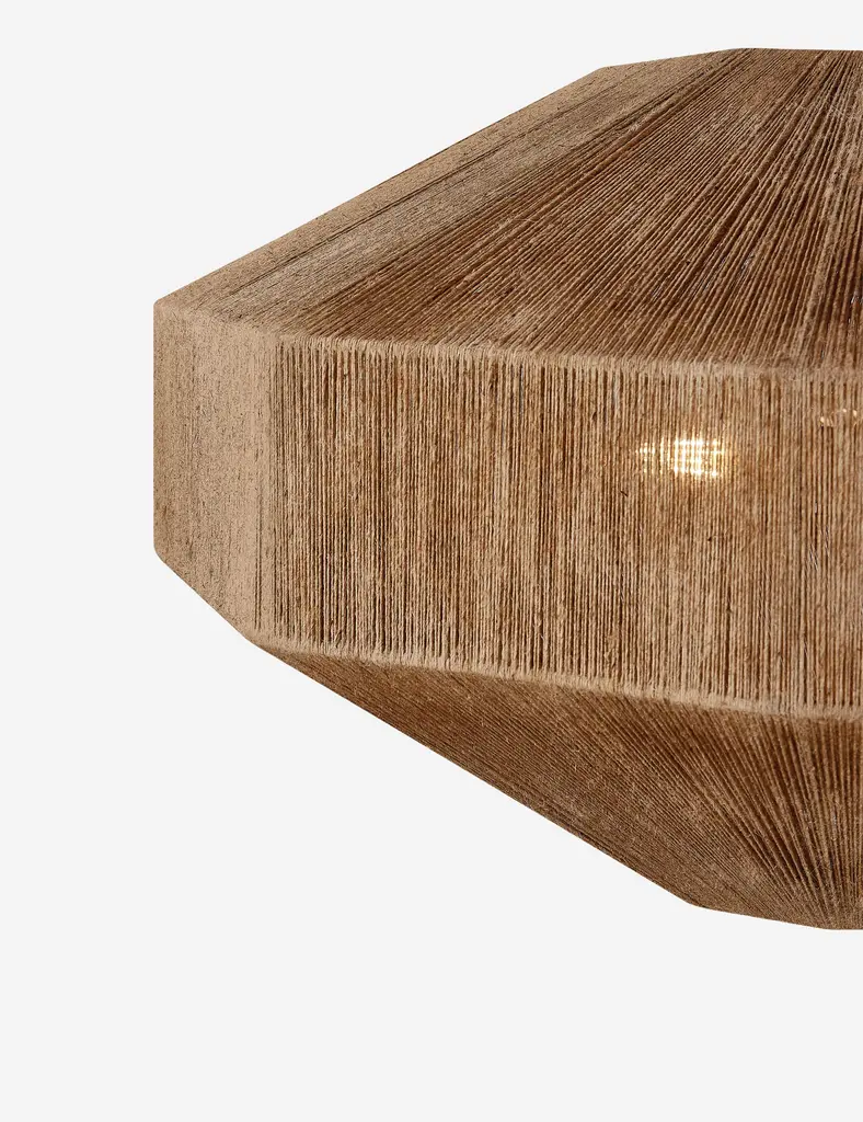 Demond brings a modern form to woven lighting. Its geometric frame is wrapped in jute, offering natural fiber texture overhead. The cluster of lights inside filters warmly through the shade with a generous pour of illumination from the opening below.