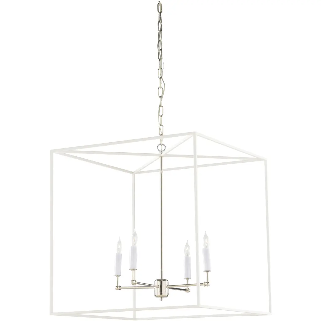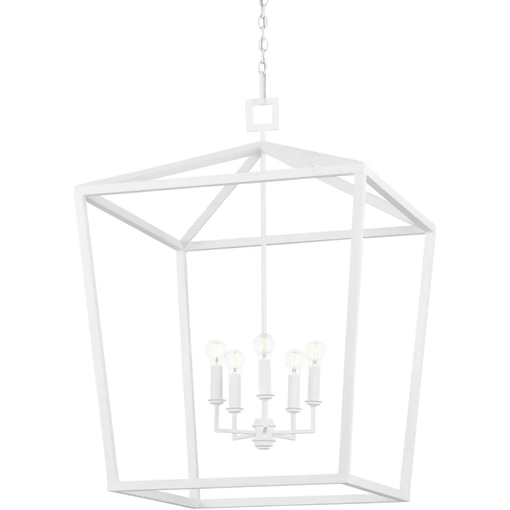 The Denison White Large Chandelier is a hammered wrought-iron fixture in a gesso white finish. This classic lantern shape has stood the test of time to make it one of our most popular offerings. A refined aspect of the design is the square that fastens the lantern to the chain. This white chandelier is one of a number of sizes and finishes in the Denison family. The pared-down profile and pale finish on this version makes it perfect for coastal aesthetics.