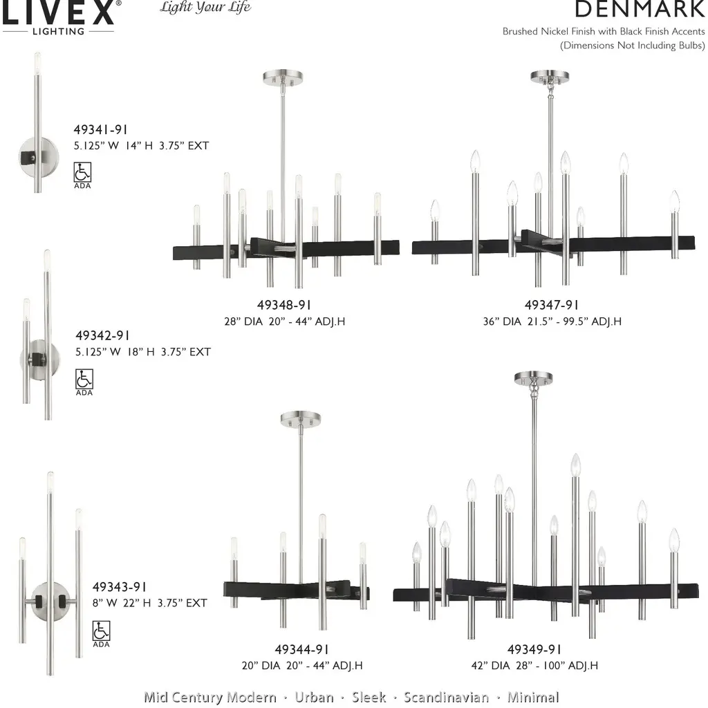 The clean lines of the Denmark collection remind of early modern Scandinavian style. The slim candles rise on the contrasting bar at different heights dynamically emulating the shape of a city skyline. This twelve-light exposed bulb chandelier comes in a
