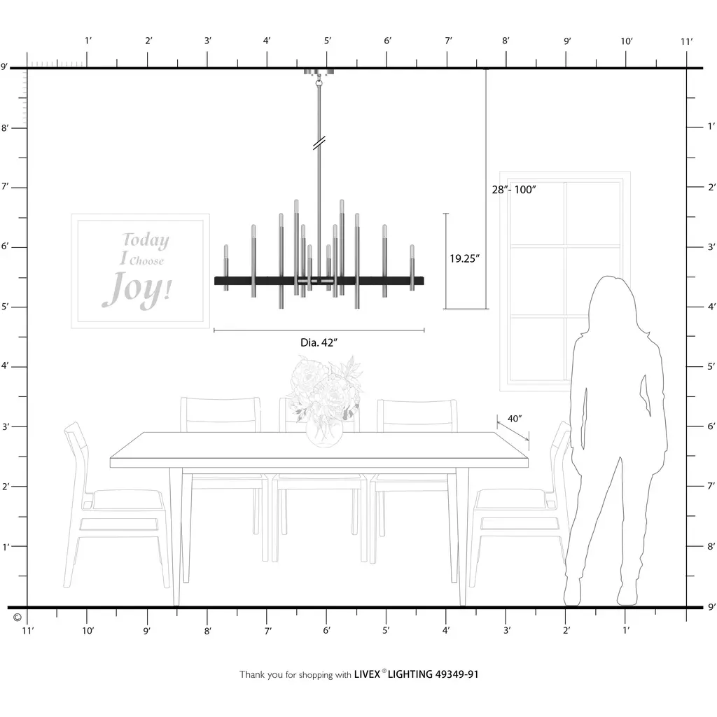 The clean lines of the Denmark collection remind of early modern Scandinavian style. The slim candles rise on the contrasting bar at different heights dynamically emulating the shape of a city skyline. This twelve-light exposed bulb chandelier comes in a