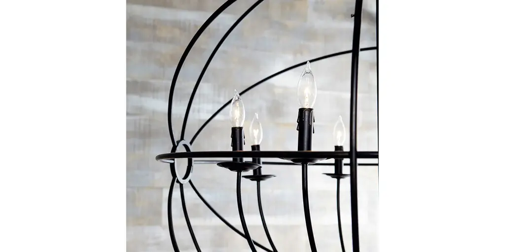 Twin iron spheres form the open frame on this eye-catching design. Use in an entry hall to make a powerful first impression, or place in a kitchen, dining room, or living room for an always inspiring visual.Includes 71 chain. Assembly required.