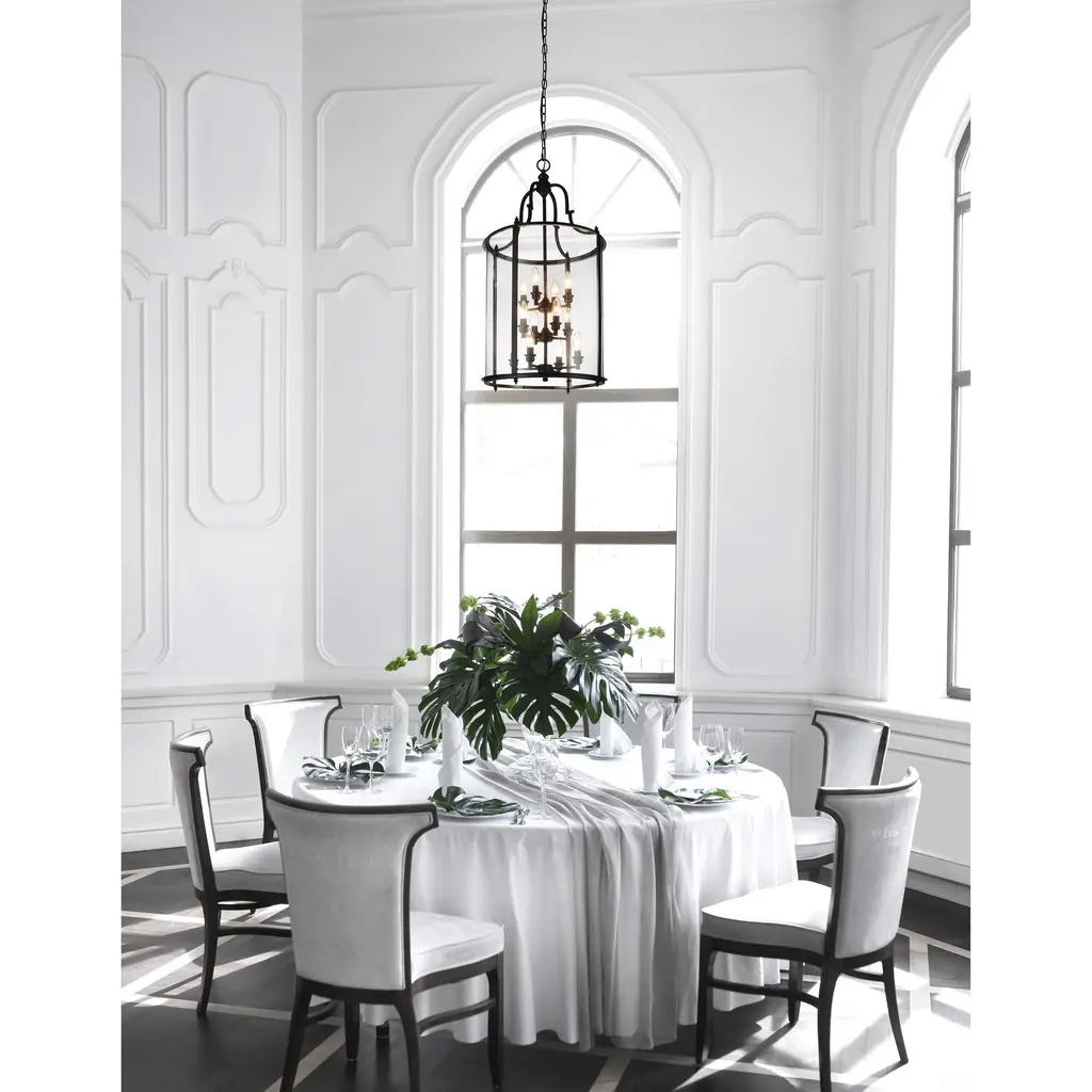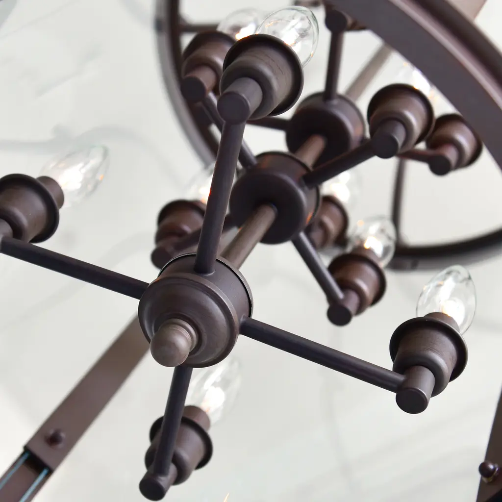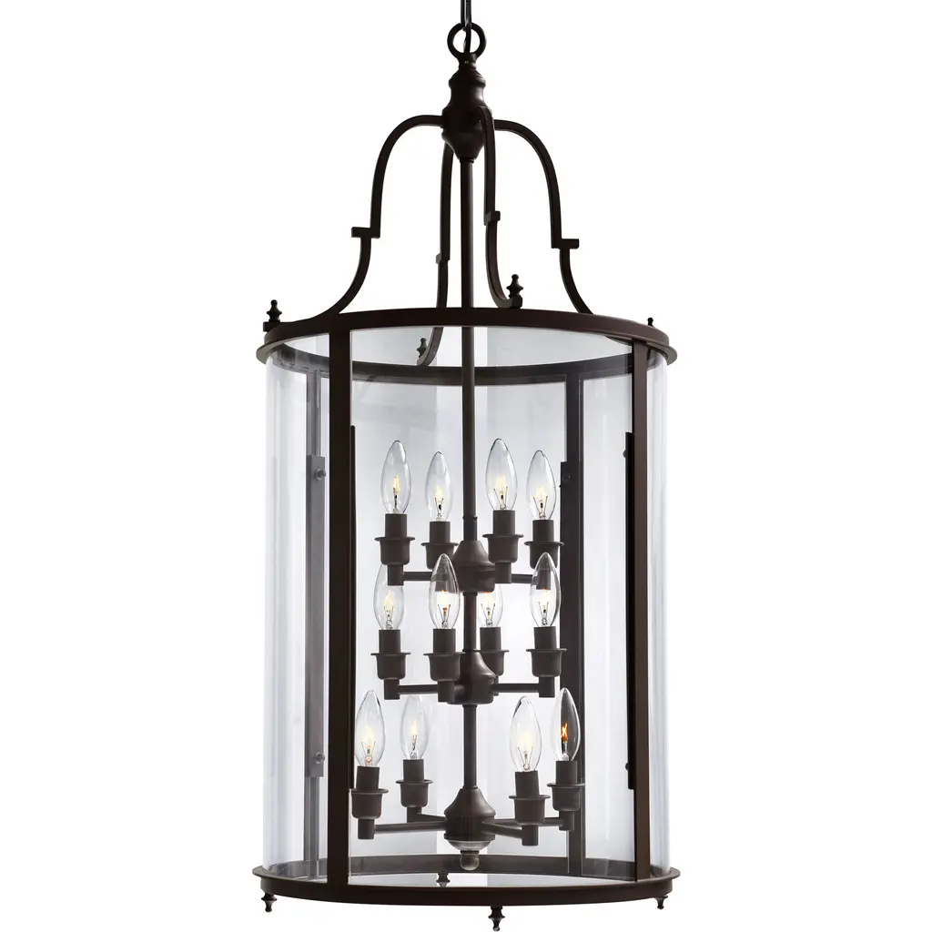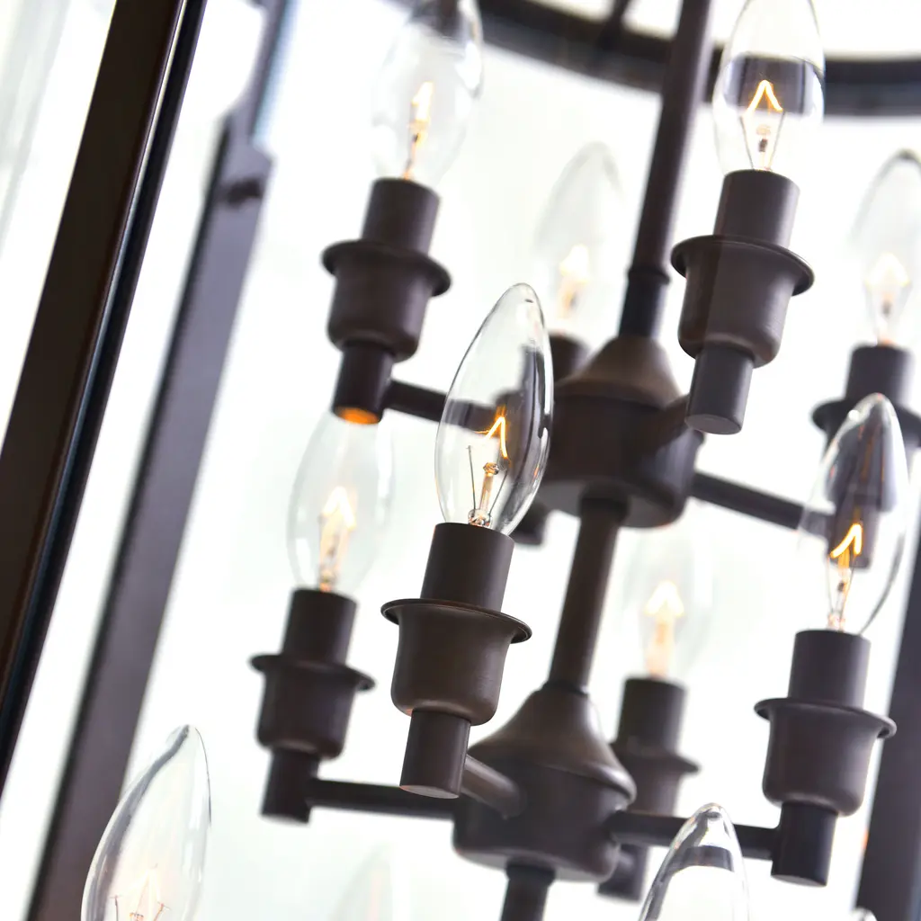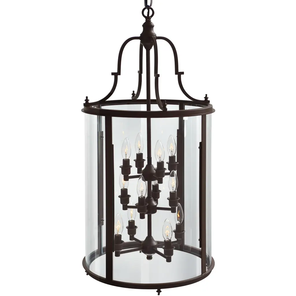 This breathtaking Desire 12-Light Drum Shade Chandelier with Oil Rubbed Bronze Finish captures the essence of classic sophistication. A 12-arm candelabra sits within a clear glass lantern-style drum shade, beautifully framed in a warm oil rubbed bronze finish. Measuring 17 inches in diameter, this chandelier offers an antique-inspired profile perfect for foyers, formal dining rooms, or vintage-style living spaces. Its timeless design and rich finish allow it to serve as both a functional light source and an elegant focal point. E12 bulbs not included. Finish: Oil Rubbed Bronze Light Count: 12 Light Source: E12 Base (Bulbs Not Included) Material: Glass, Metal Style: Vintage / Transitional / Classic