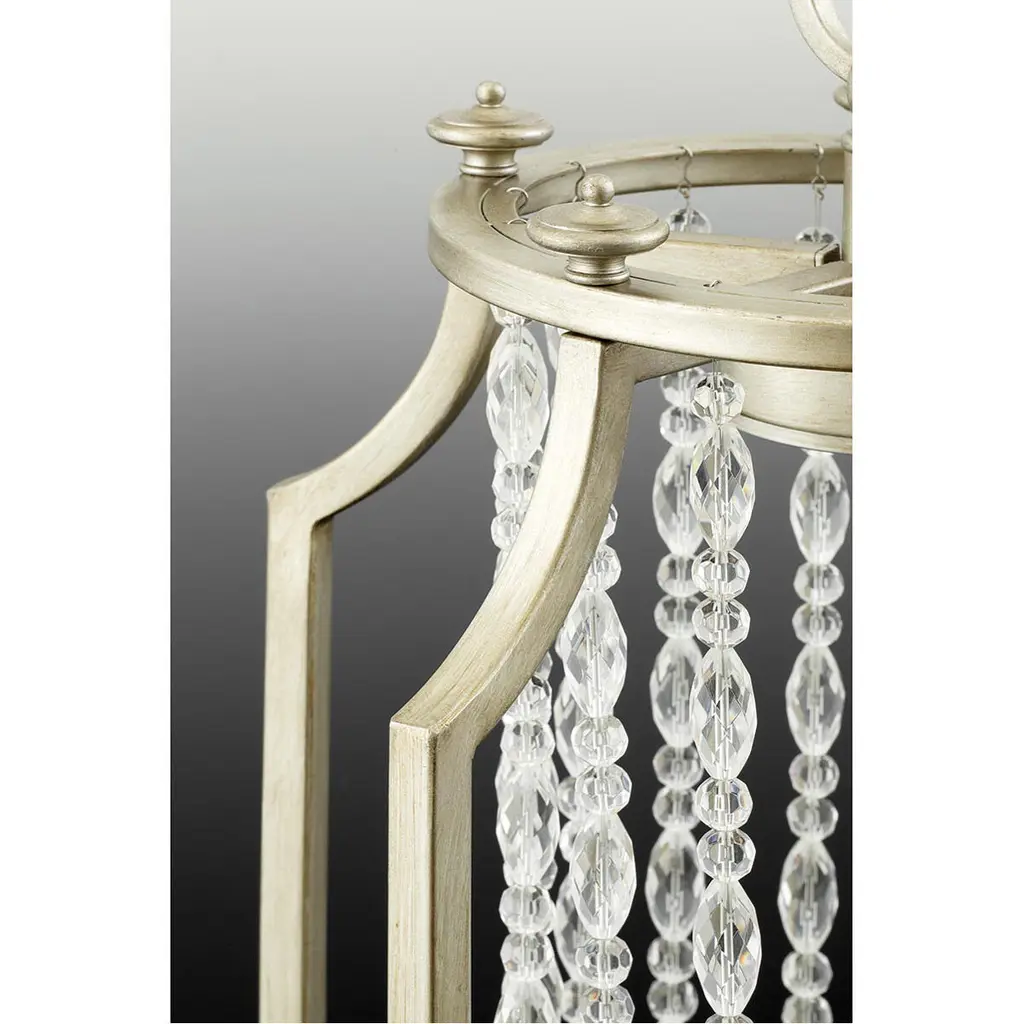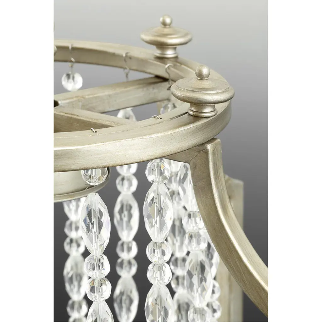 The Desiree collection six-light linear chandelier features luxury materials and details reminiscent of Hollywood's "Golden Era." A Silver Ridge finish and clear crystal strands cascade in a waterfall effect to convey the glitz and glamour from an iconic time that is making a modern comeback.