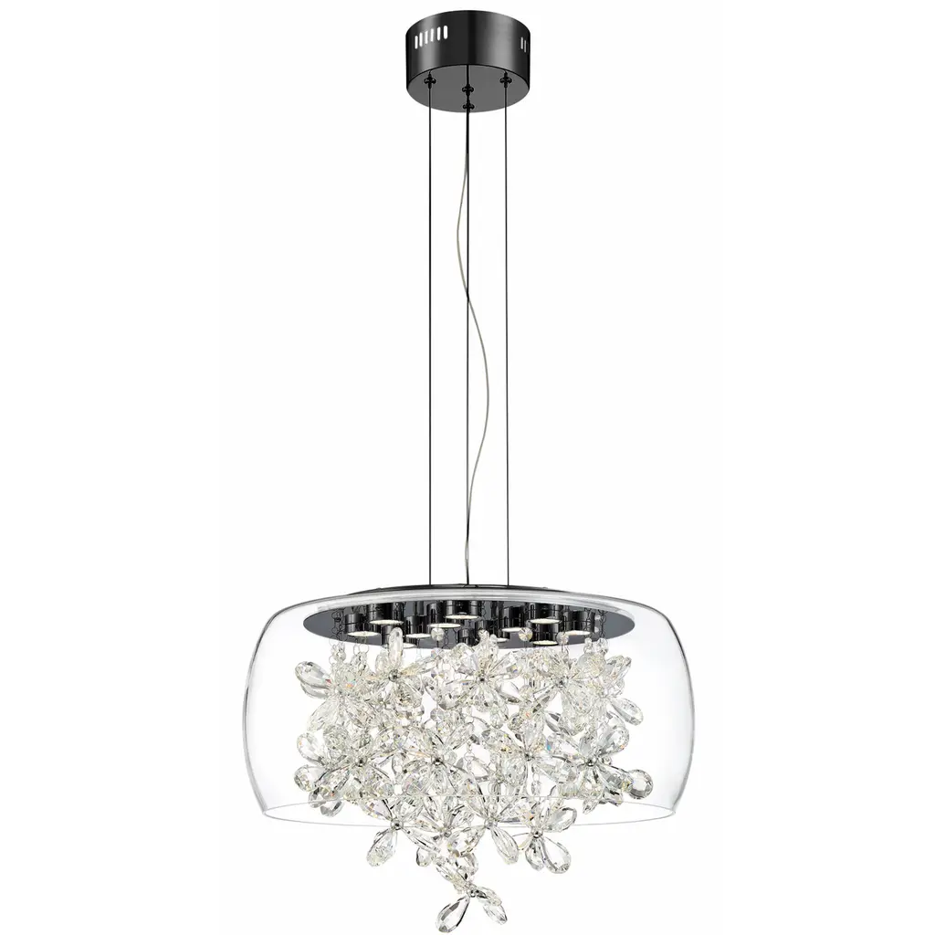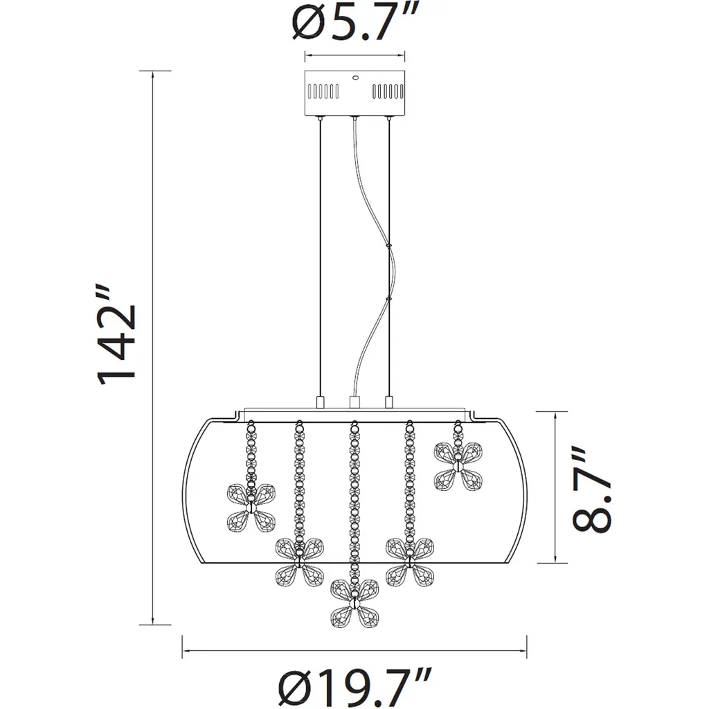 LED 20" Clear Glass Dome Shade with Clear Butterfly Crystal Stranded Chandelier with Matte Black Metal Finish.