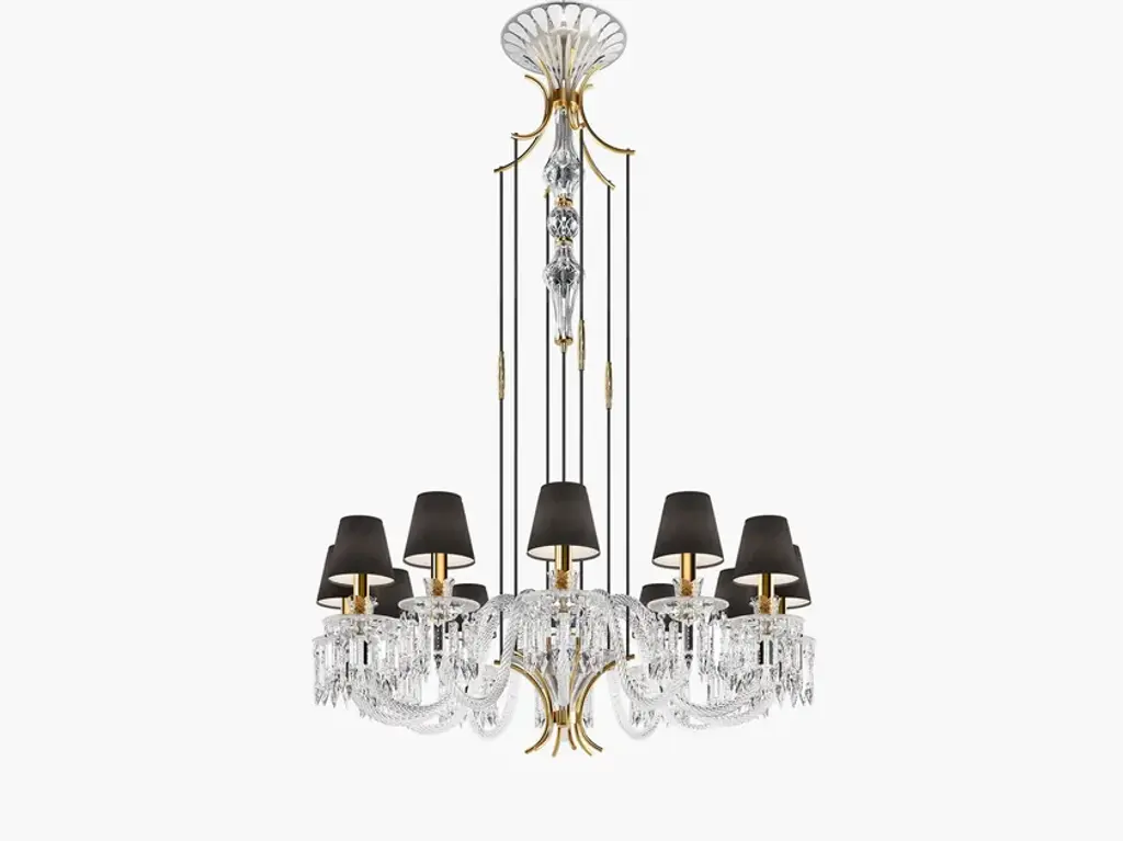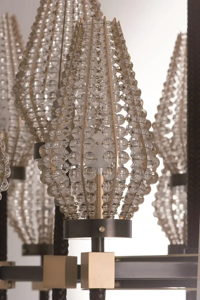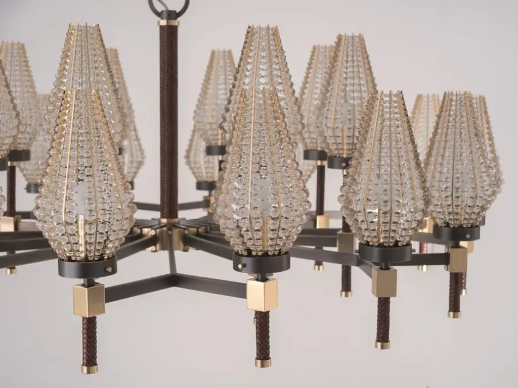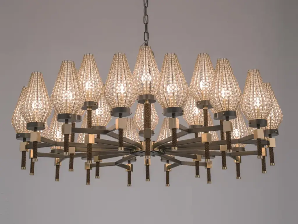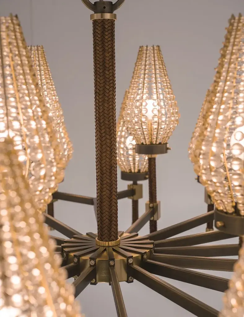 D01 is a 24 lights chandelier, burnished brass and satin gold details, brown leather tape, satin gold lampshades and clear crystal pearls.24x28W E14not suppliedDEW is a collection of lamps structurally held by supporting vertical elements coated by hand-braided leather, available in white, lime, peach, brown, grey, or black colour. A complex handmade manufacture, able to bring an added value to the product and to make it unique in its genre. Each bracket of the lamp is assembled with screws, created to become themselves a decorative part, granting a compositional modularity which allows to create infinite forms and dimensions. Versatile in its possibilities of use, it defines a complex system of components which can be combined with one another, either as chandelier, free-standing or wall lamp. Even from a material point of view, different offers are available, with finish combinations in burnished brass and satin gold details, satin brass and gold plated details, gunmetal and polished nickel details, gunmetal and copper details. Beside the crystal lampshade, it is possible to request fabric lampshades, available in ivory, white or black color.
