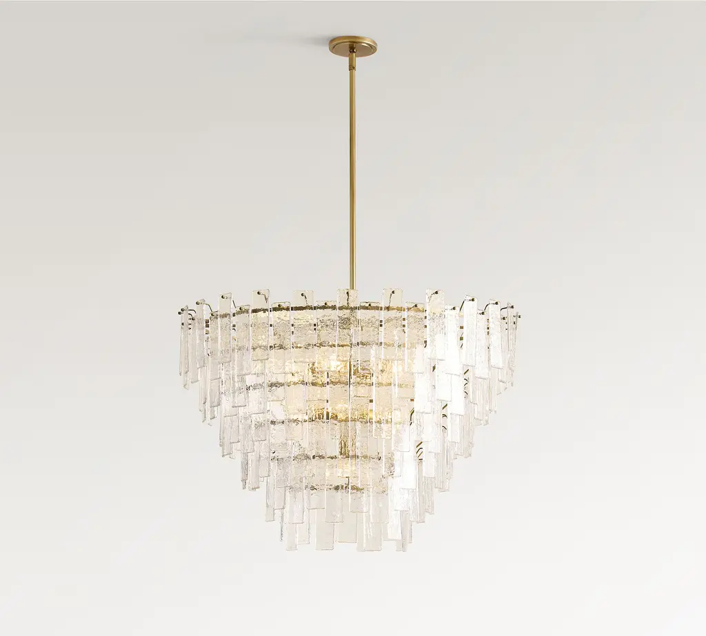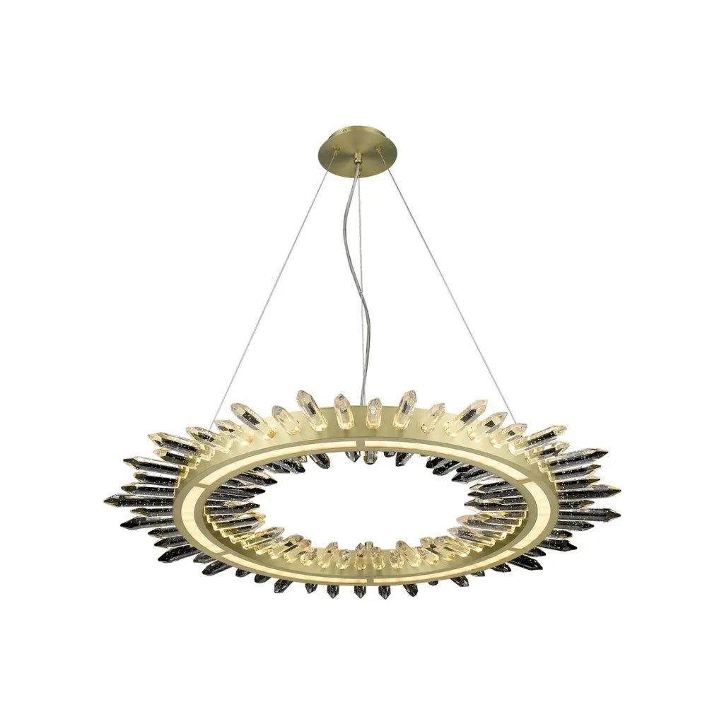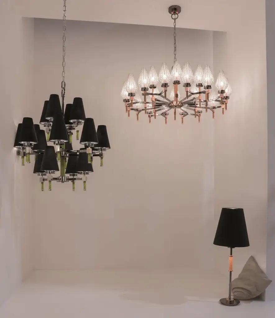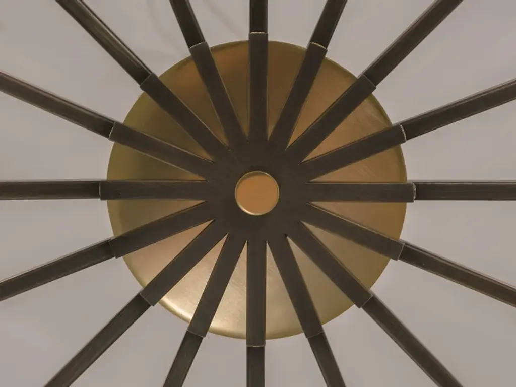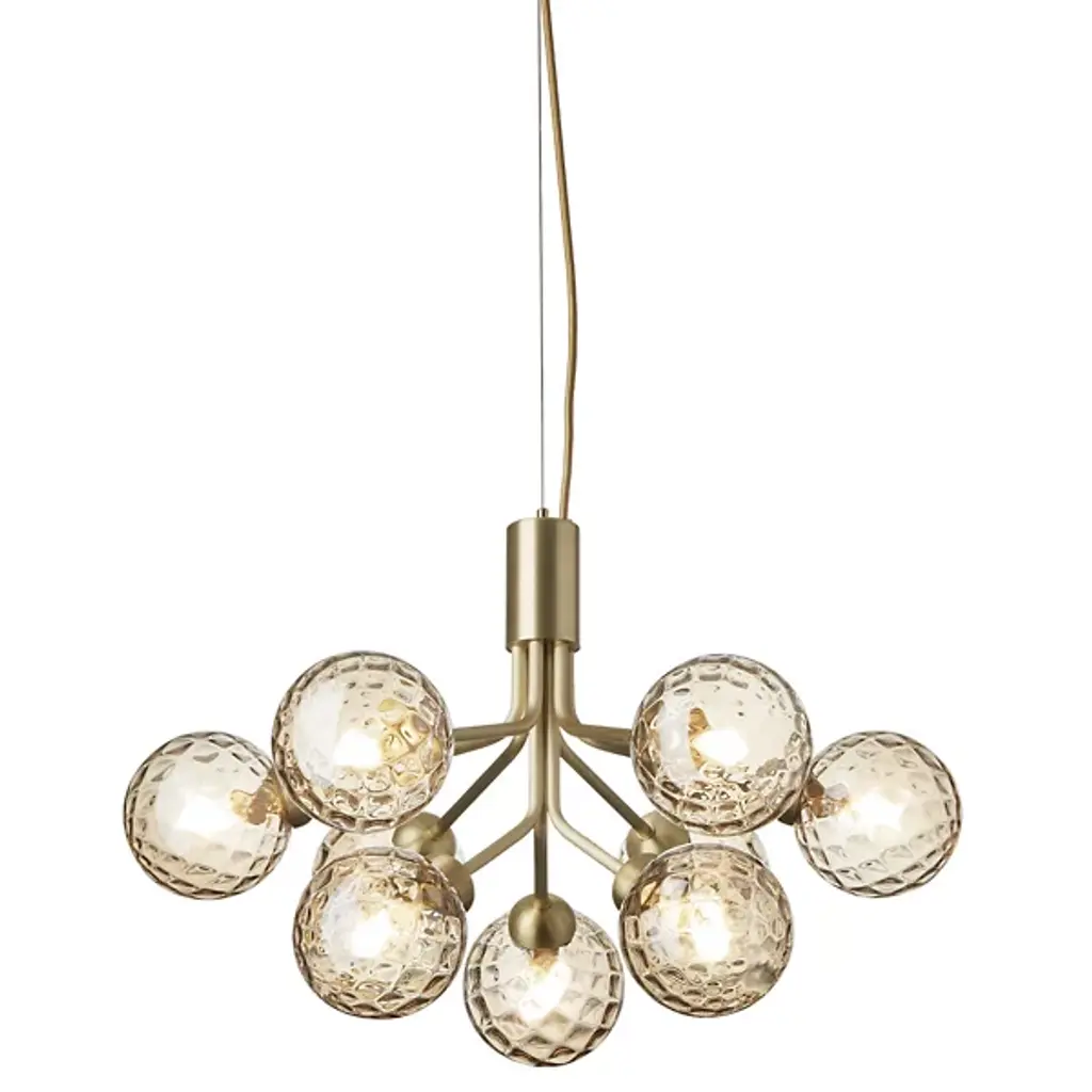 D01 is a 24 lights chandelier, burnished brass and satin gold details, brown leather tape, satin gold lampshades and clear crystal pearls.24x28W E14not suppliedDEW is a collection of lamps structurally held by supporting vertical elements coated by hand-braided leather, available in white, lime, peach, brown, grey, or black colour. A complex handmade manufacture, able to bring an added value to the product and to make it unique in its genre. Each bracket of the lamp is assembled with screws, created to become themselves a decorative part, granting a compositional modularity which allows to create infinite forms and dimensions. Versatile in its possibilities of use, it defines a complex system of components which can be combined with one another, either as chandelier, free-standing or wall lamp. Even from a material point of view, different offers are available, with finish combinations in burnished brass and satin gold details, satin brass and gold plated details, gunmetal and polished nickel details, gunmetal and copper details. Beside the crystal lampshade, it is possible to request fabric lampshades, available in ivory, white or black color.