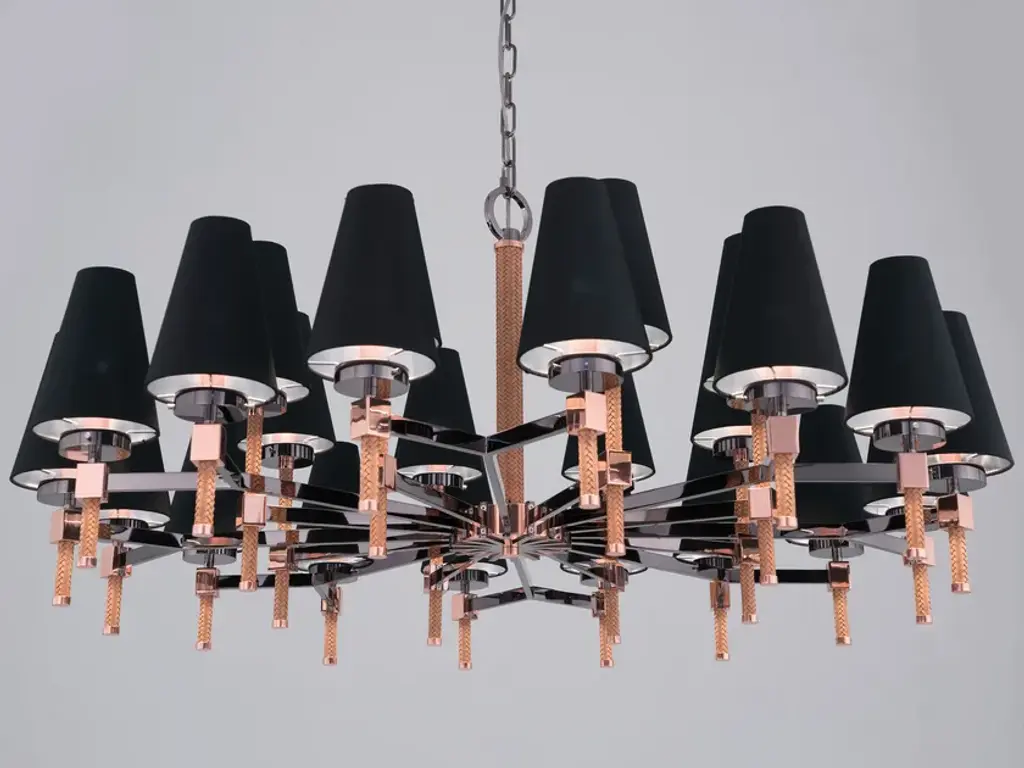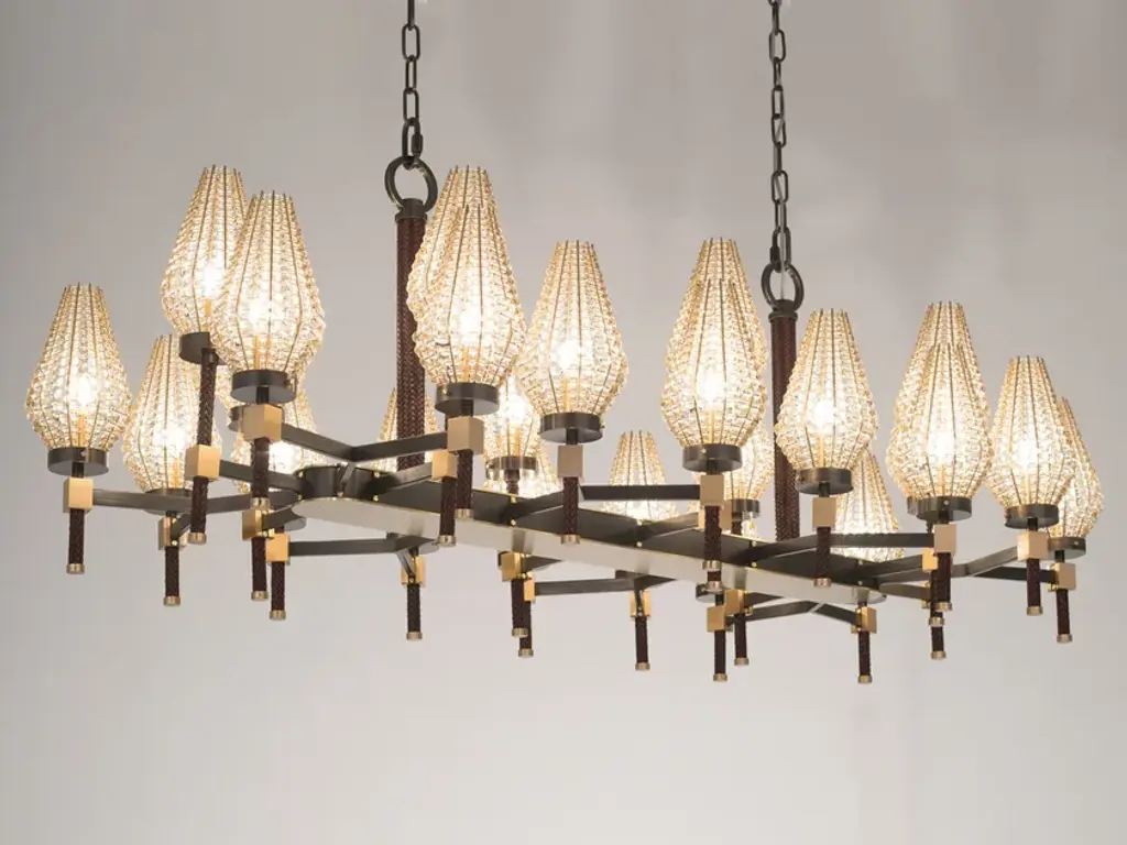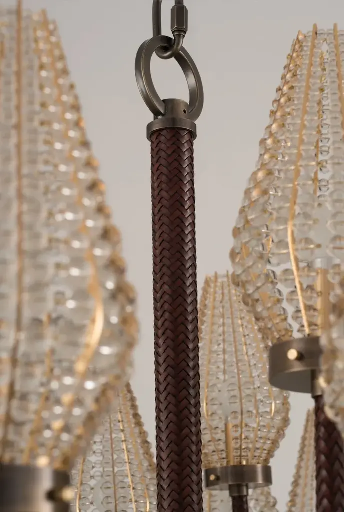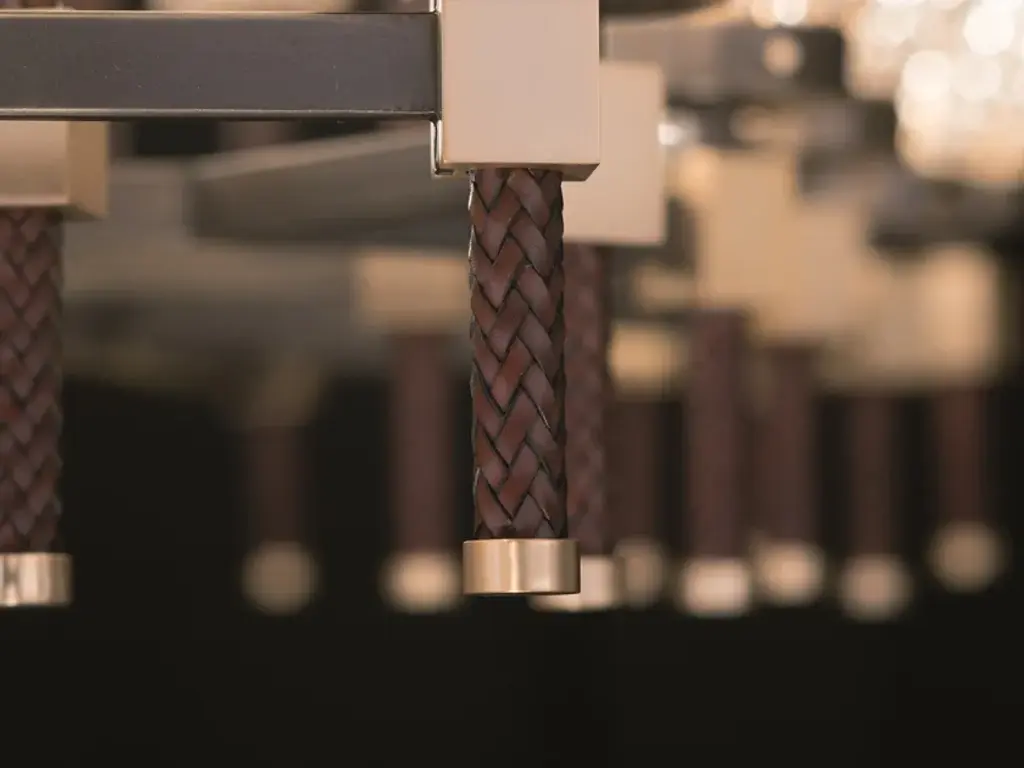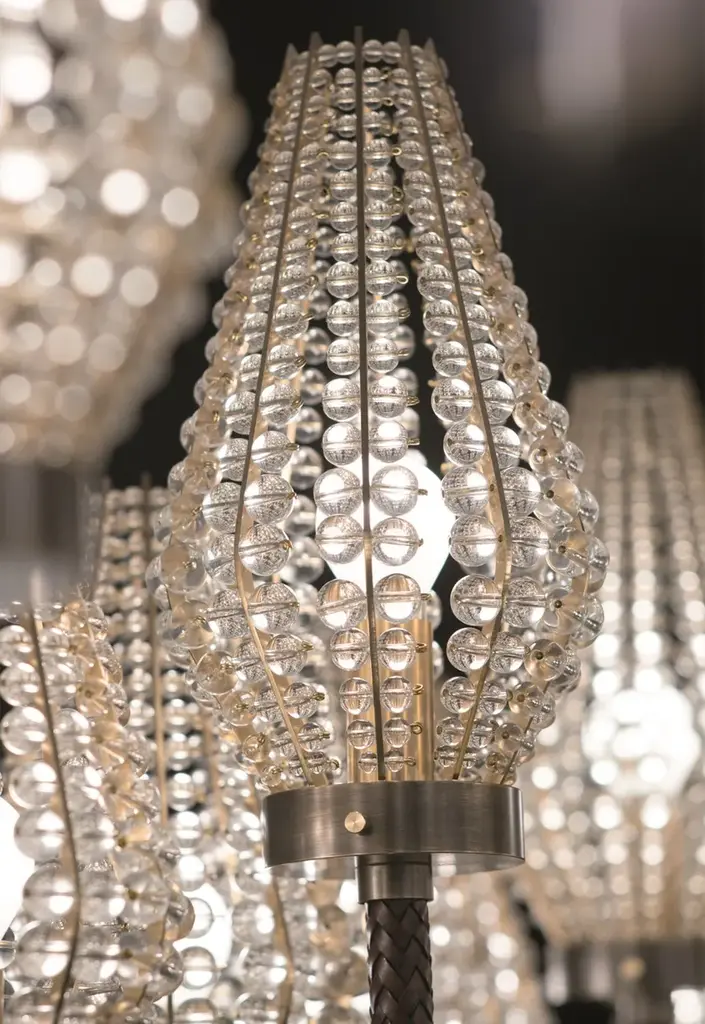 D04 is a 24 lights chandelier, satin brass finish and gold plated details, brown leatehr tape, satin gold lampshades and clear crystal pearls.24x28W E14not suppliedDEW is a collection of lamps structurally held by supporting vertical elements coated by hand-braided leather, available in white, lime, peach, brown, grey, or black colour. A complex handmade manufacture, able to bring an added value to the product and to make it unique in its genre. Each bracket of the lamp is assembled with screws, created to become themselves a decorative part, granting a compositional modularity which allows to create infinite forms and dimensions. Versatile in its possibilities of use, it defines a complex system of components which can be combined with one another, either as chandelier, free-standing or wall lamp. Even from a material point of view, different offers are available, with finish combinations in burnished brass and satin gold details, satin brass and gold plated details, gunmetal and polished nickel details, gunmetal and copper details. Beside the crystal lampshade, it is possible to request fabric lampshades, available in ivory, white or black color.