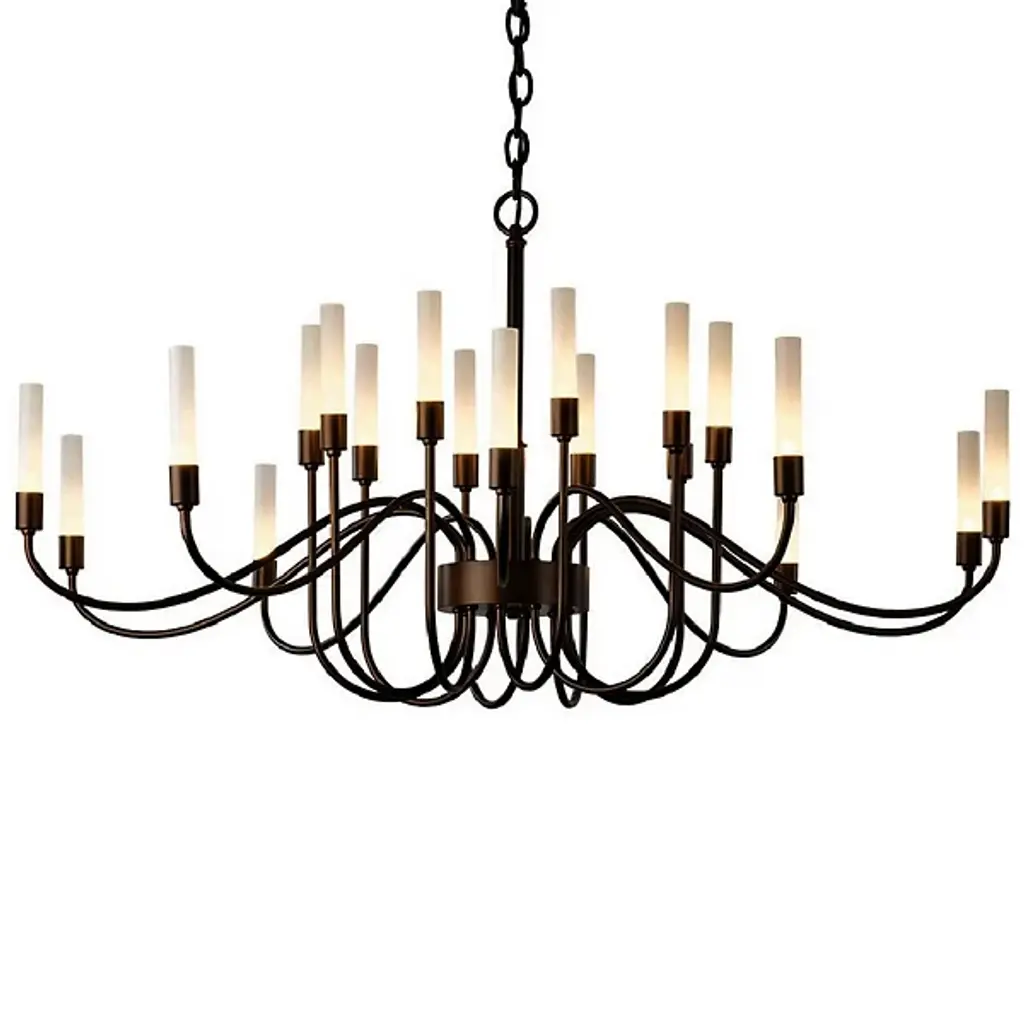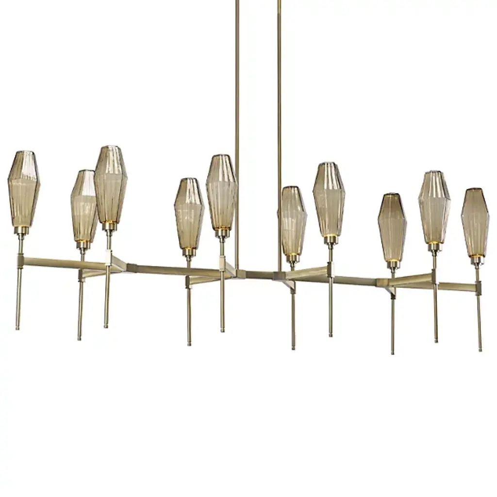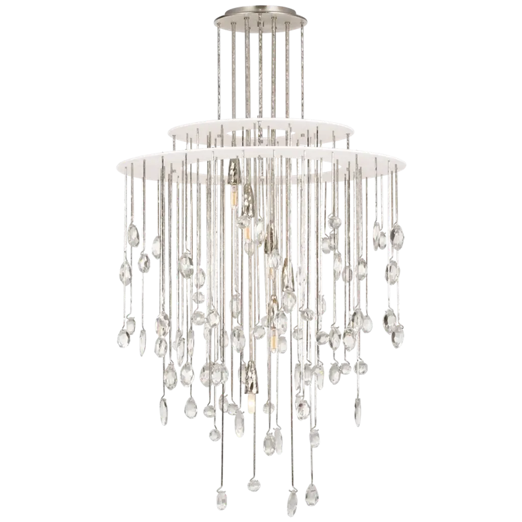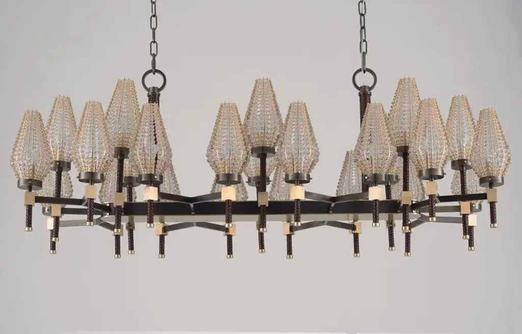 D04 is a 24 lights chandelier, satin brass finish and gold plated details, brown leatehr tape, satin gold lampshades and clear crystal pearls.24x28W E14not suppliedDEW is a collection of lamps structurally held by supporting vertical elements coated by hand-braided leather, available in white, lime, peach, brown, grey, or black colour. A complex handmade manufacture, able to bring an added value to the product and to make it unique in its genre. Each bracket of the lamp is assembled with screws, created to become themselves a decorative part, granting a compositional modularity which allows to create infinite forms and dimensions. Versatile in its possibilities of use, it defines a complex system of components which can be combined with one another, either as chandelier, free-standing or wall lamp. Even from a material point of view, different offers are available, with finish combinations in burnished brass and satin gold details, satin brass and gold plated details, gunmetal and polished nickel details, gunmetal and copper details. Beside the crystal lampshade, it is possible to request fabric lampshades, available in ivory, white or black color.