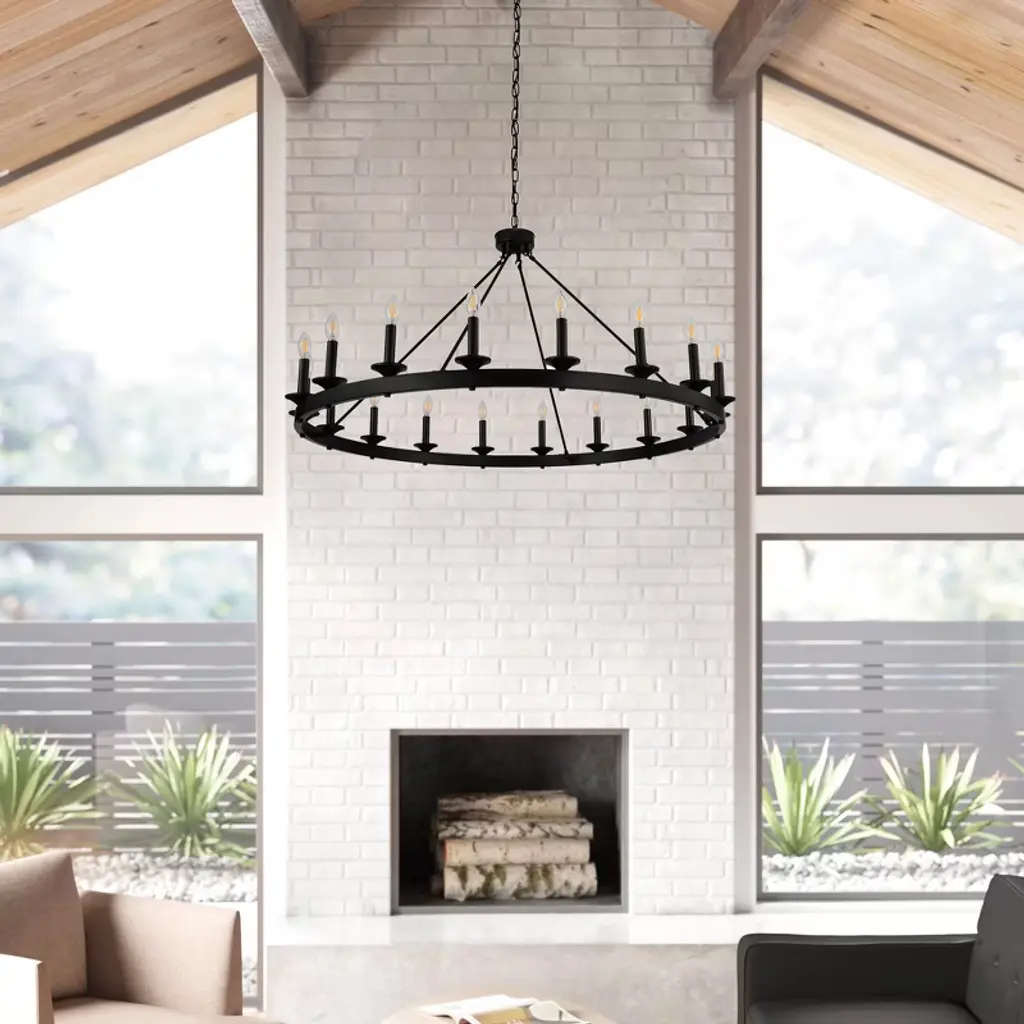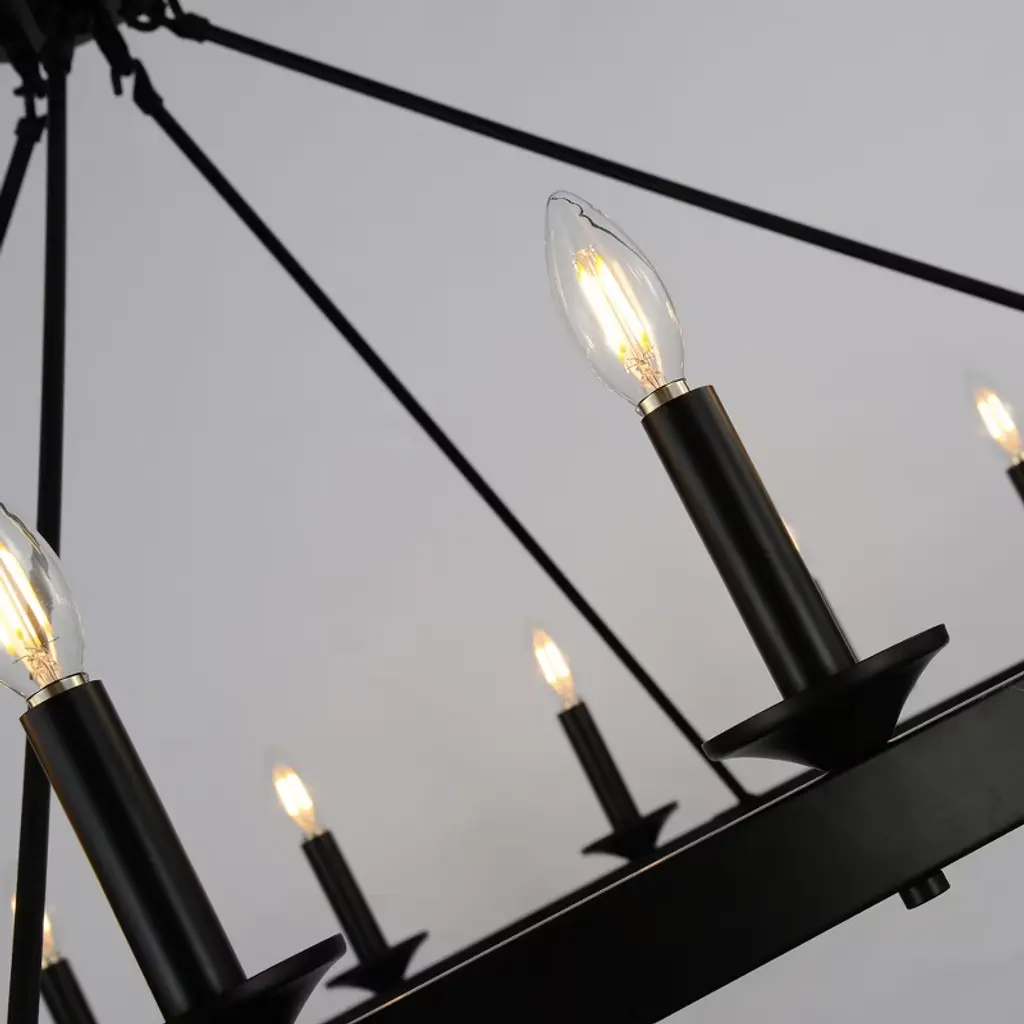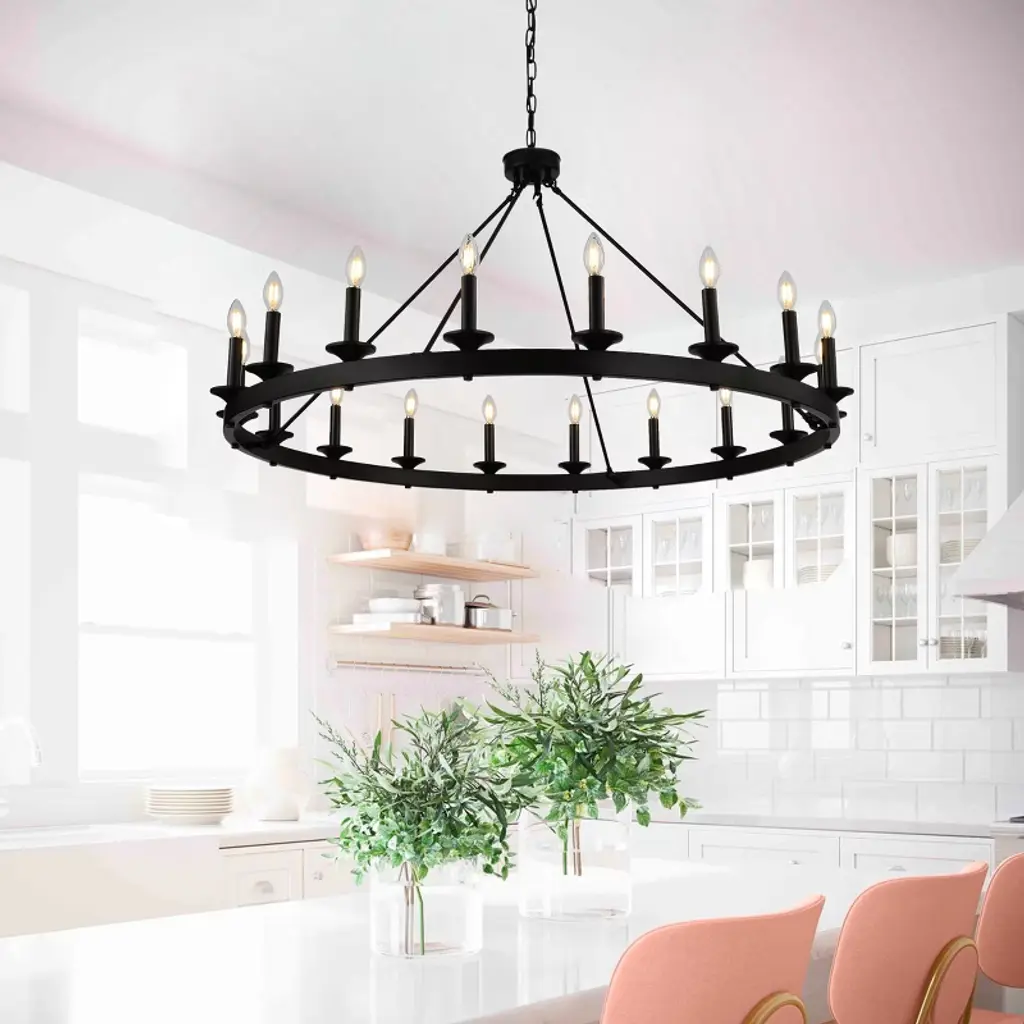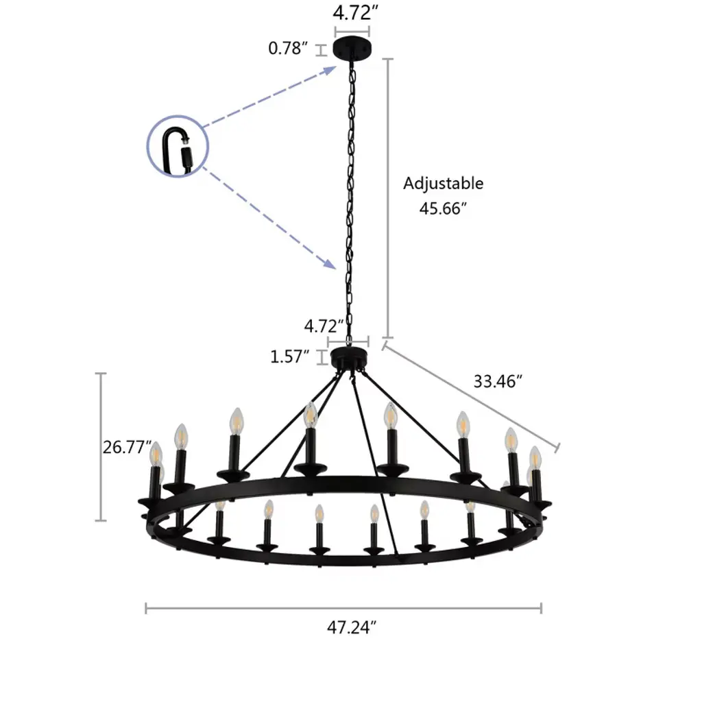 The Dewdrop 18-Light Black Iron Chandelier features a striking wagon wheel design with 18 E26 sockets, full-metal matte black finish, and ETL certification. Perfect for farmhouse, industrial, or modern interiors, it adds bold style and bright lighting to dining rooms, foyers, or vaulted ceilings. Compatible with dimmable bulbs and built for long-lasting performance.