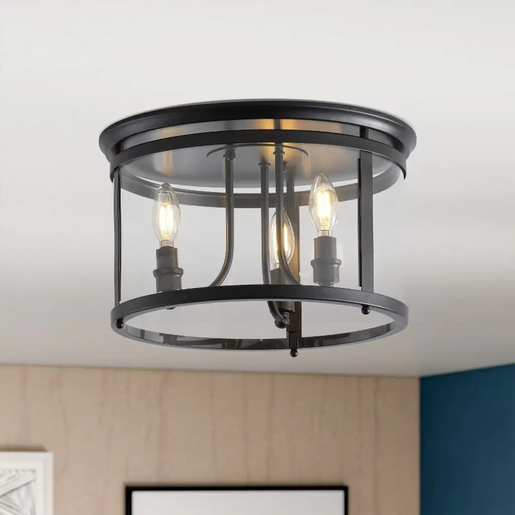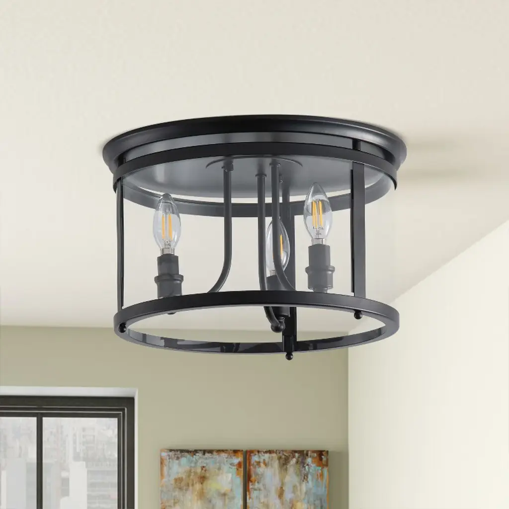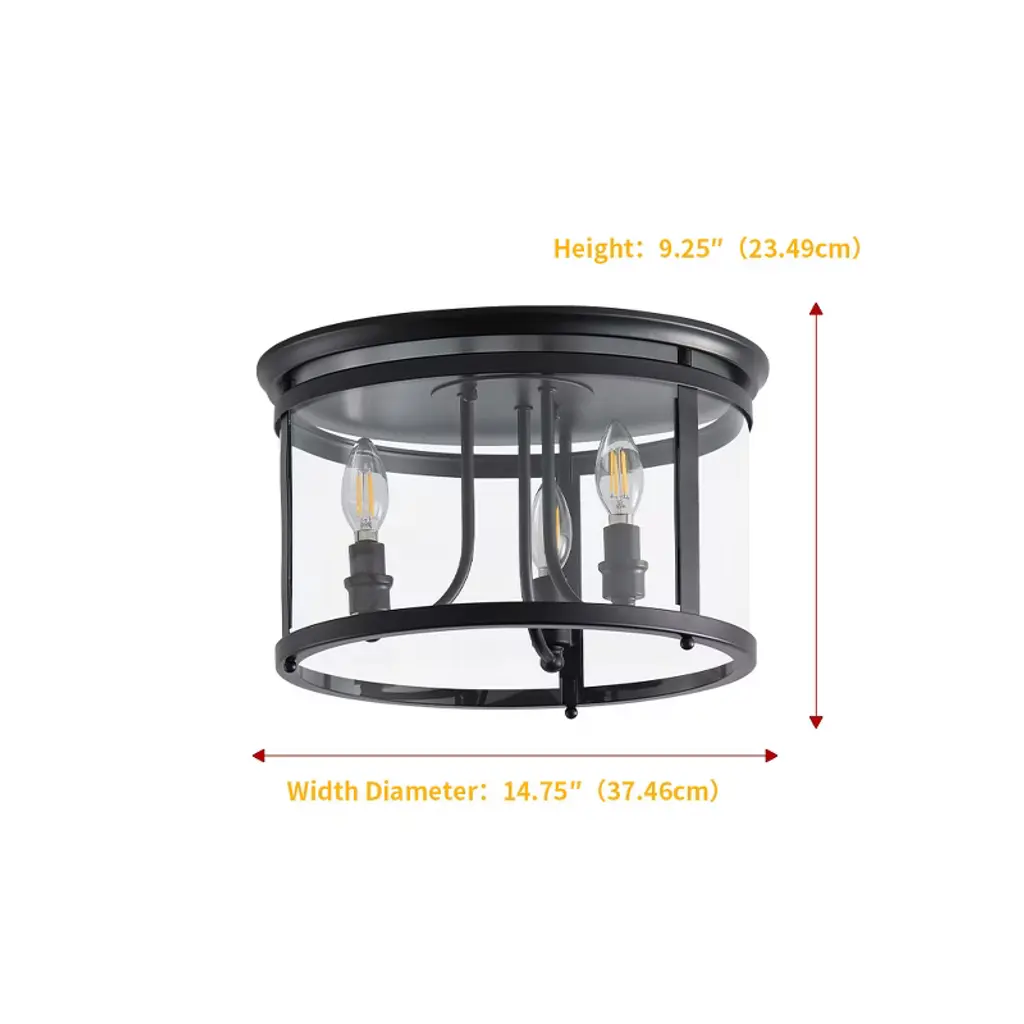 Dewdrop farmhouse flush mount ceiling light combines a matte black iron frame with a clear glass drum shade, creating a timeless blend of modern and industrial style. Equipped with three E12 bulb sockets (MAX 40W, bulbs not included), it provides bright, even lighting for kitchens, hallways, dining rooms, or entryways. Built with durable iron and thick clear glass, this ETL-listed ceiling light ensures safety and reliability. The semi flush mount design makes it ideal for low or standard ceilings. Easy to install with included hardware and backed by a 2-year warranty, this fixture is both stylish and dependable.