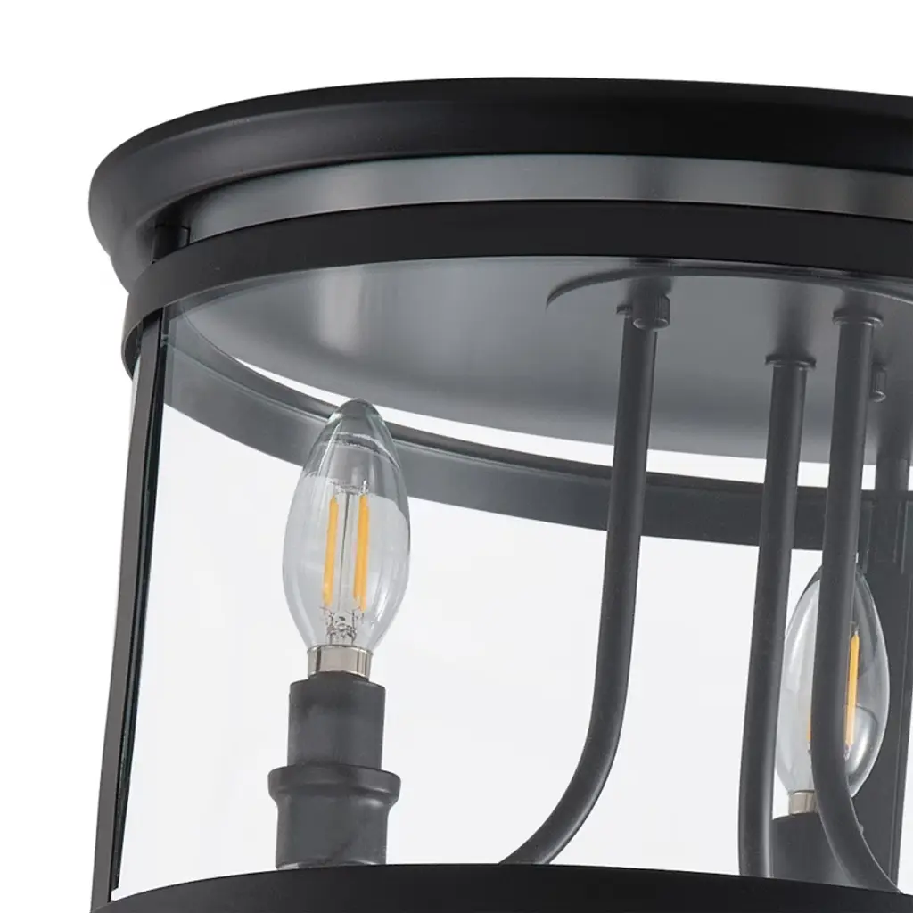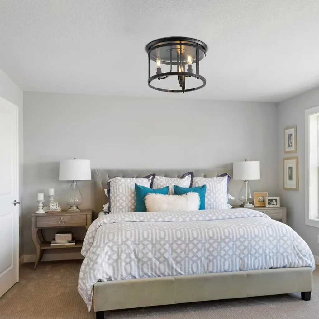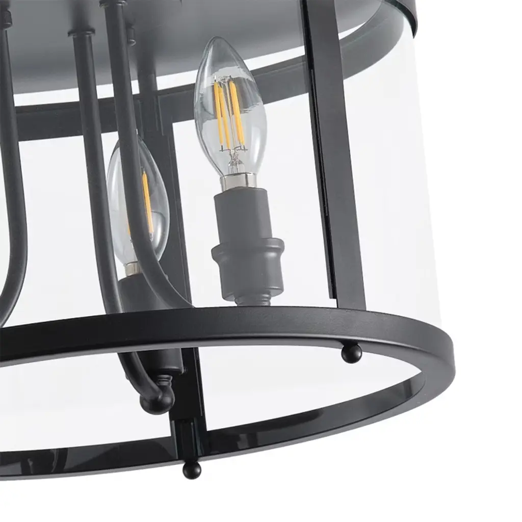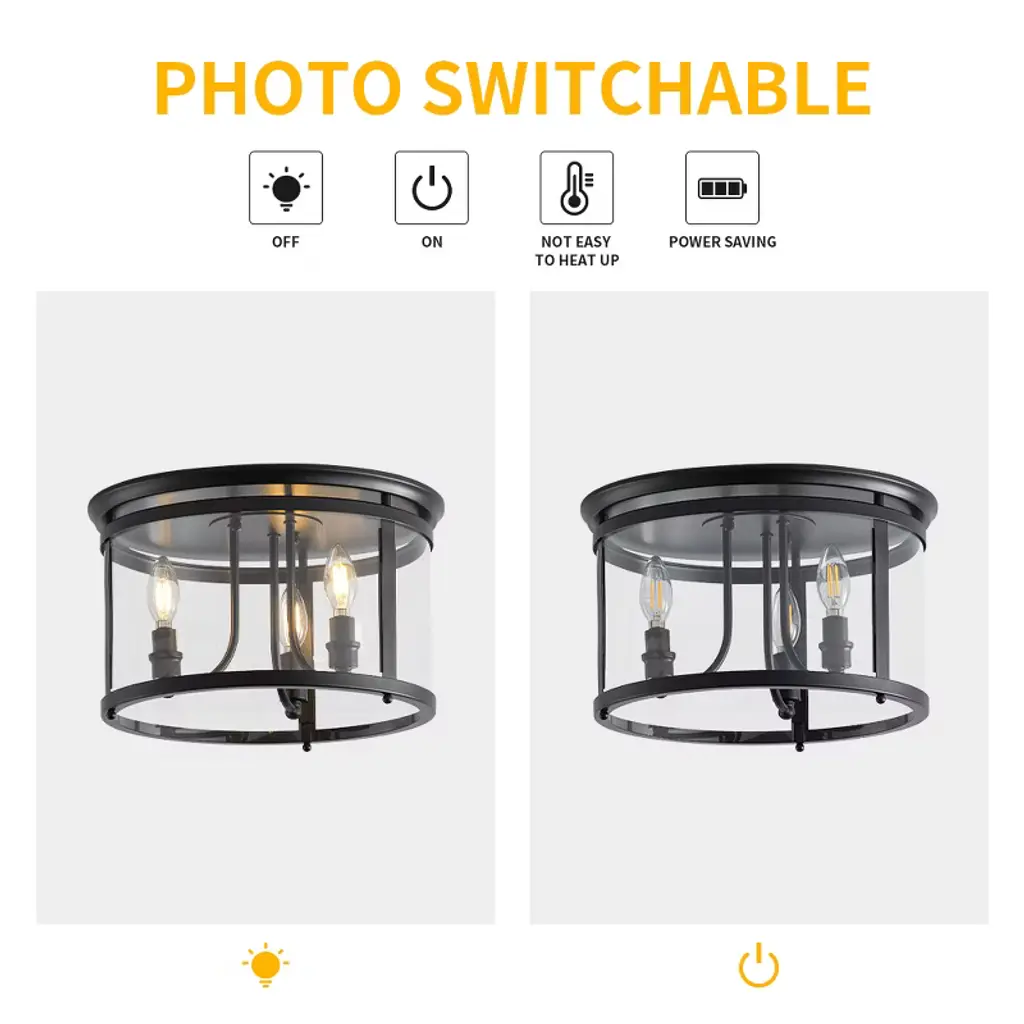 Dewdrop farmhouse flush mount ceiling light combines a matte black iron frame with a clear glass drum shade, creating a timeless blend of modern and industrial style. Equipped with three E12 bulb sockets (MAX 40W, bulbs not included), it provides bright, even lighting for kitchens, hallways, dining rooms, or entryways. Built with durable iron and thick clear glass, this ETL-listed ceiling light ensures safety and reliability. The semi flush mount design makes it ideal for low or standard ceilings. Easy to install with included hardware and backed by a 2-year warranty, this fixture is both stylish and dependable.