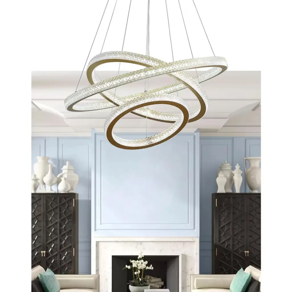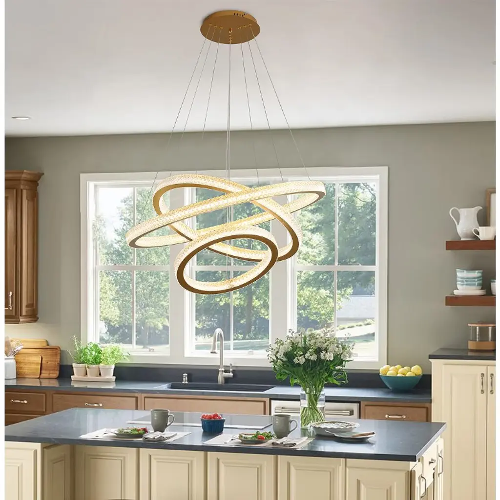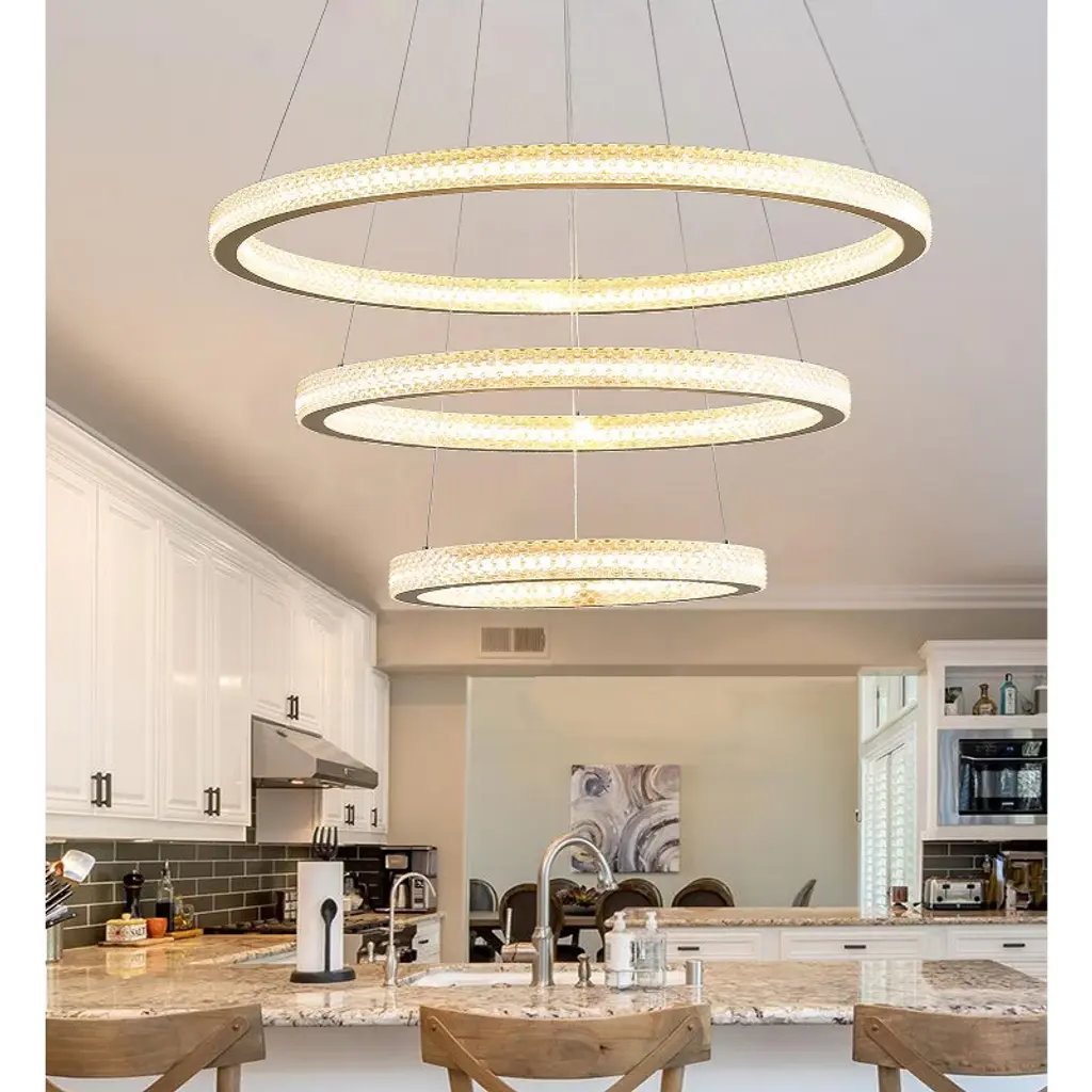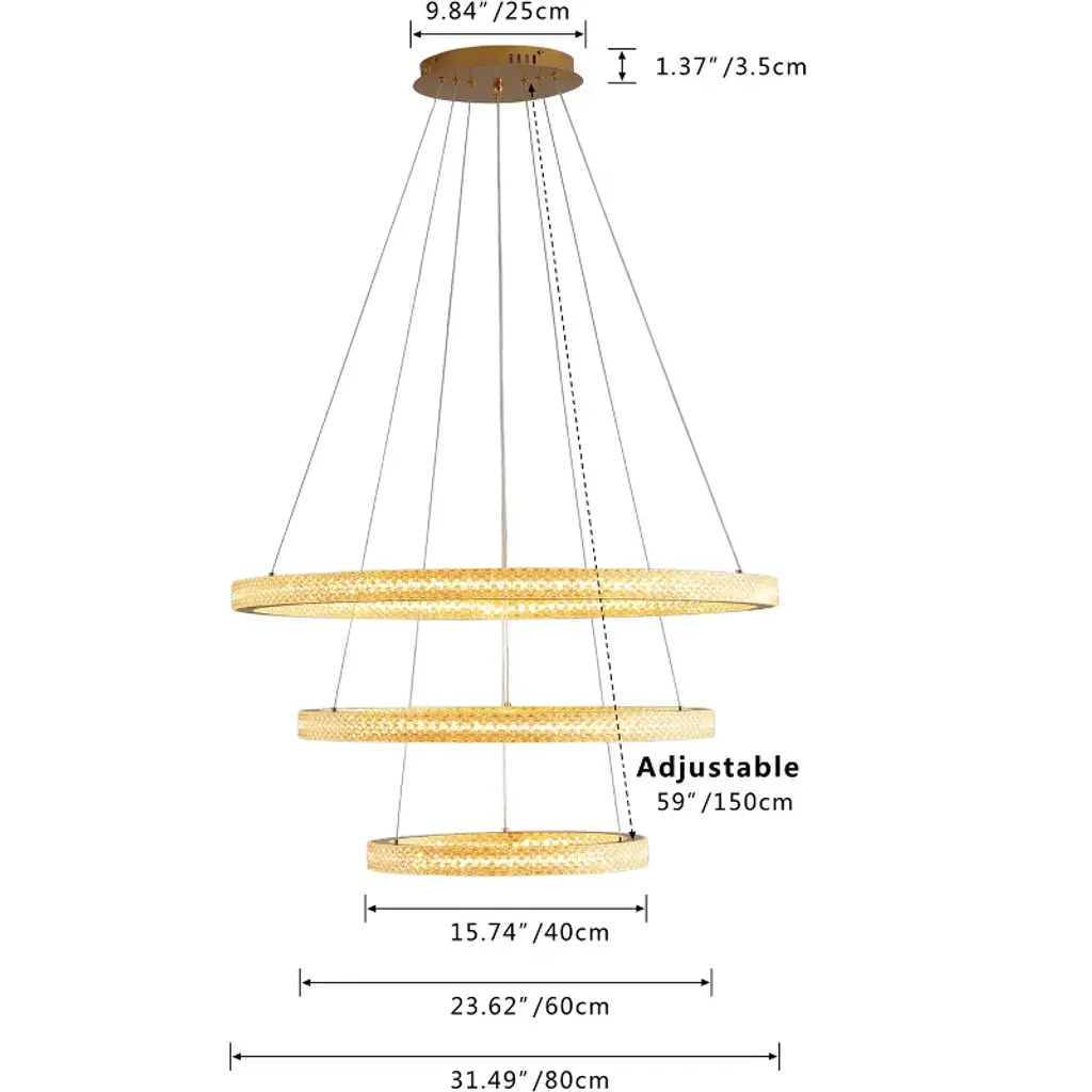 Specifications : Type: LED Chandelier Materials: Metal Finish: Painted Color: GoldNumber of Light Sources: 3 Light Wattage: 226W Voltage: 110V Color Rendering Index: 100 Brightness (Lumens): 12000 Lm Dimensions : 3 Rings Diameter: 15.74"+23.62"+31.49"Chain/Cord/Rod Length: 59"Adjustable or Not: Yes Features: Modern Material and Design: Exquisite 3-tier circle shape design and brushed gold finish add a luxurious feel and elegant glamour to your home. Quality Assurance: High-quality metal craft with painted finish. All products in the factory have to undergo rigorous safety monitoring, to ensure quality and safety. Easy Installation: Come with clear guidelines and mounting hardware, please install the chandelier with the guidelines or hire a professional electrician to finish the process. After installing the light frame on the ceiling, there will be minor assembly required. 3 Colors Dimmable: Our modern LED pendant light is a dimmable LED light. According to actual needs, the product can be adjusted between white light, warm light, and neutral light color temperatures. At the same time, the product can also achieve a dimming function. With the remote control we provided, you can enjoy a variety of lighting effects. Application: The luxurious chandelier is ideal for suspending over kitchen islands, dining rooms, living rooms, loft, cafes, bars, clubs, restaurants, libraries, and so on.