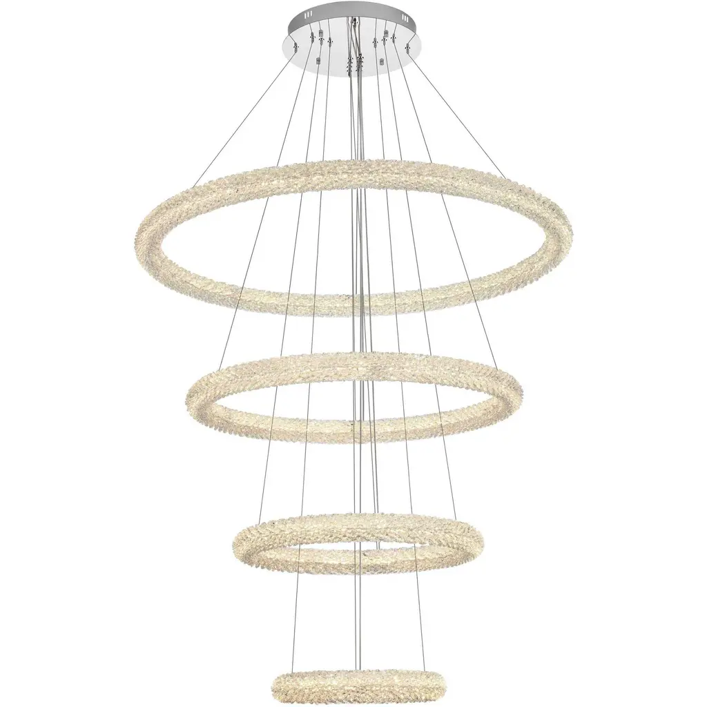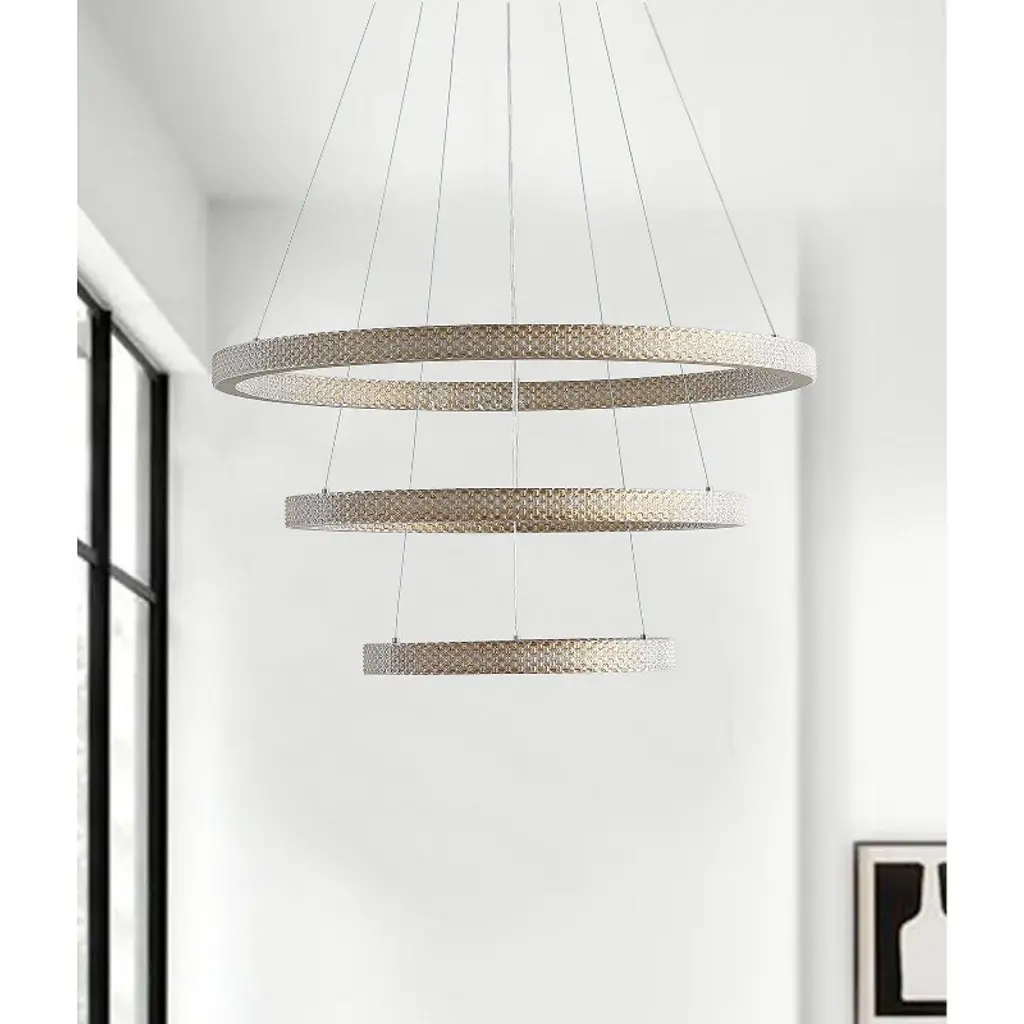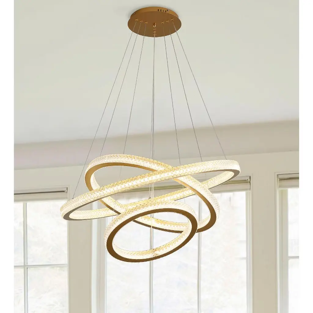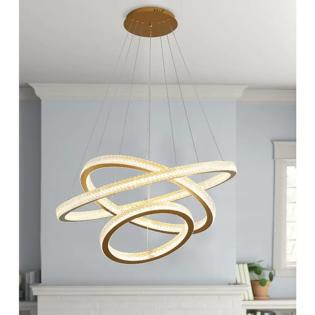 Specifications : Type: LED Chandelier Materials: Metal Finish: Painted Color: GoldNumber of Light Sources: 3 Light Wattage: 226W Voltage: 110V Color Rendering Index: 100 Brightness (Lumens): 12000 Lm Dimensions : 3 Rings Diameter: 15.74"+23.62"+31.49"Chain/Cord/Rod Length: 59"Adjustable or Not: Yes Features: Modern Material and Design: Exquisite 3-tier circle shape design and brushed gold finish add a luxurious feel and elegant glamour to your home. Quality Assurance: High-quality metal craft with painted finish. All products in the factory have to undergo rigorous safety monitoring, to ensure quality and safety. Easy Installation: Come with clear guidelines and mounting hardware, please install the chandelier with the guidelines or hire a professional electrician to finish the process. After installing the light frame on the ceiling, there will be minor assembly required. 3 Colors Dimmable: Our modern LED pendant light is a dimmable LED light. According to actual needs, the product can be adjusted between white light, warm light, and neutral light color temperatures. At the same time, the product can also achieve a dimming function. With the remote control we provided, you can enjoy a variety of lighting effects. Application: The luxurious chandelier is ideal for suspending over kitchen islands, dining rooms, living rooms, loft, cafes, bars, clubs, restaurants, libraries, and so on.