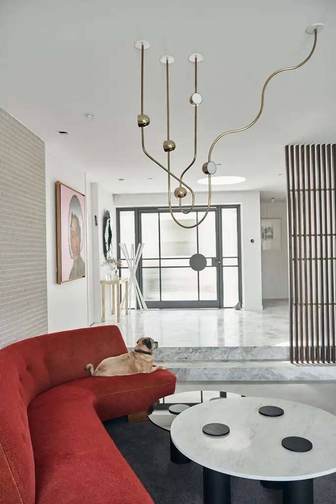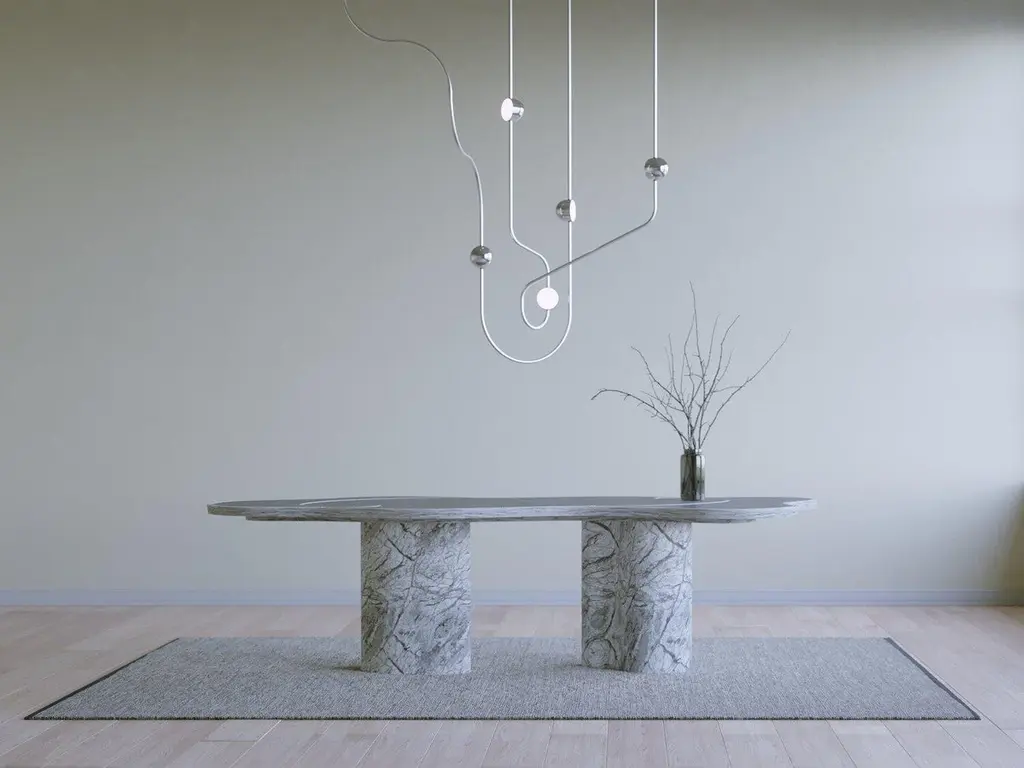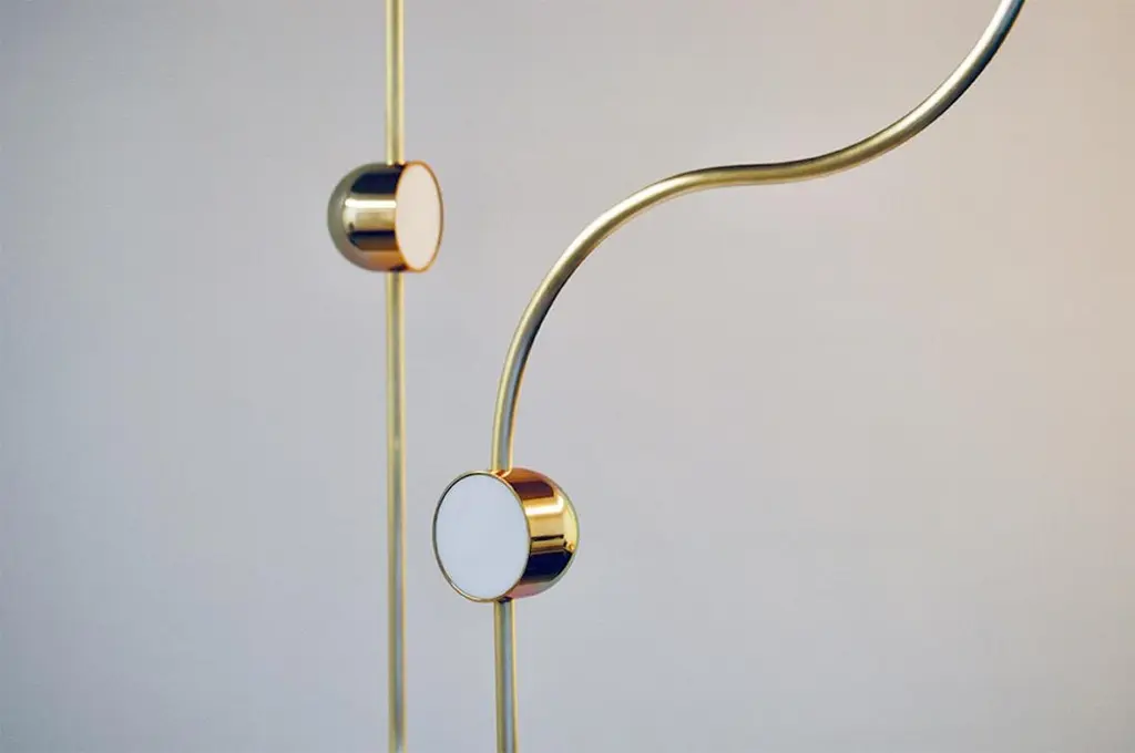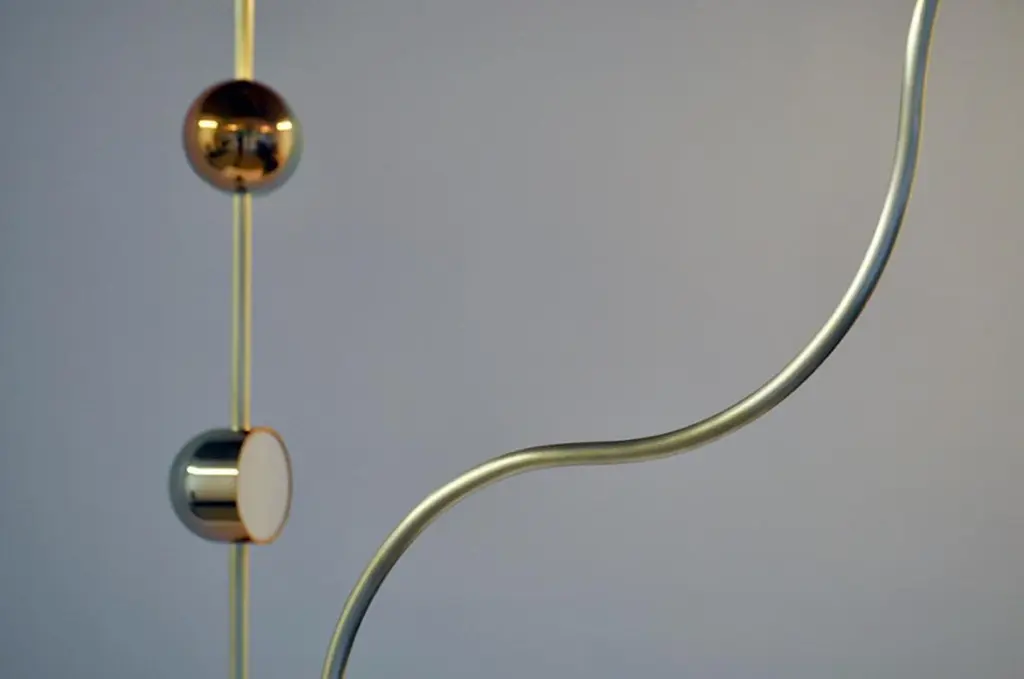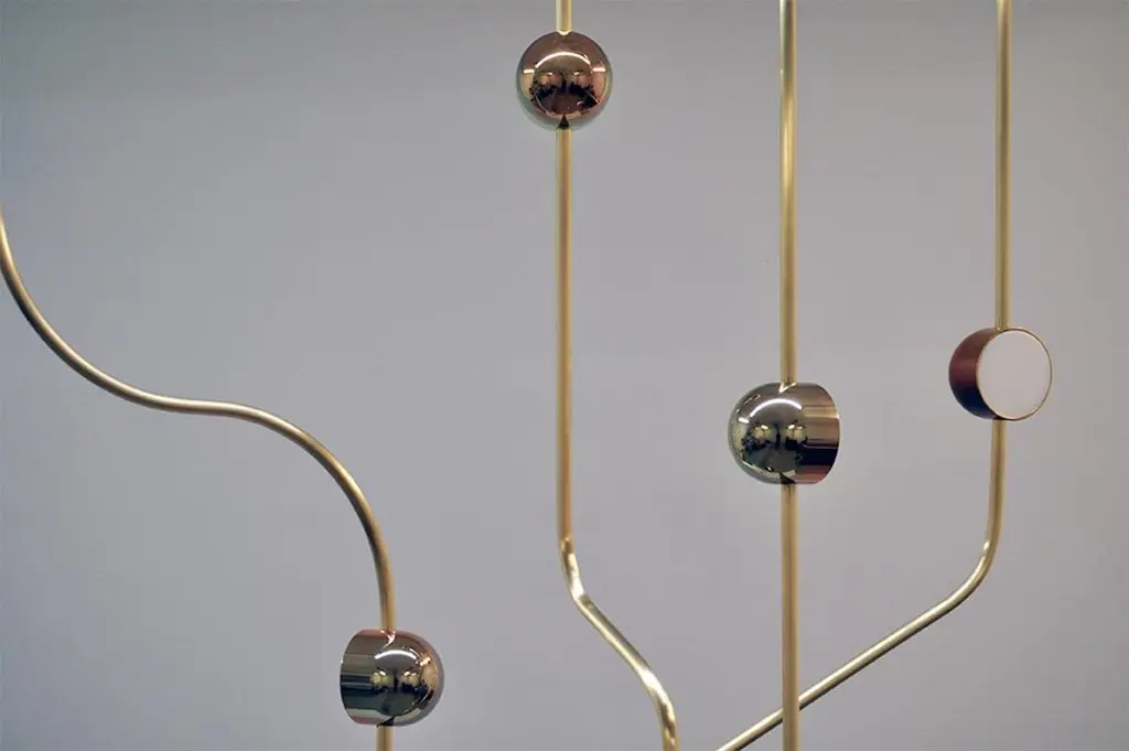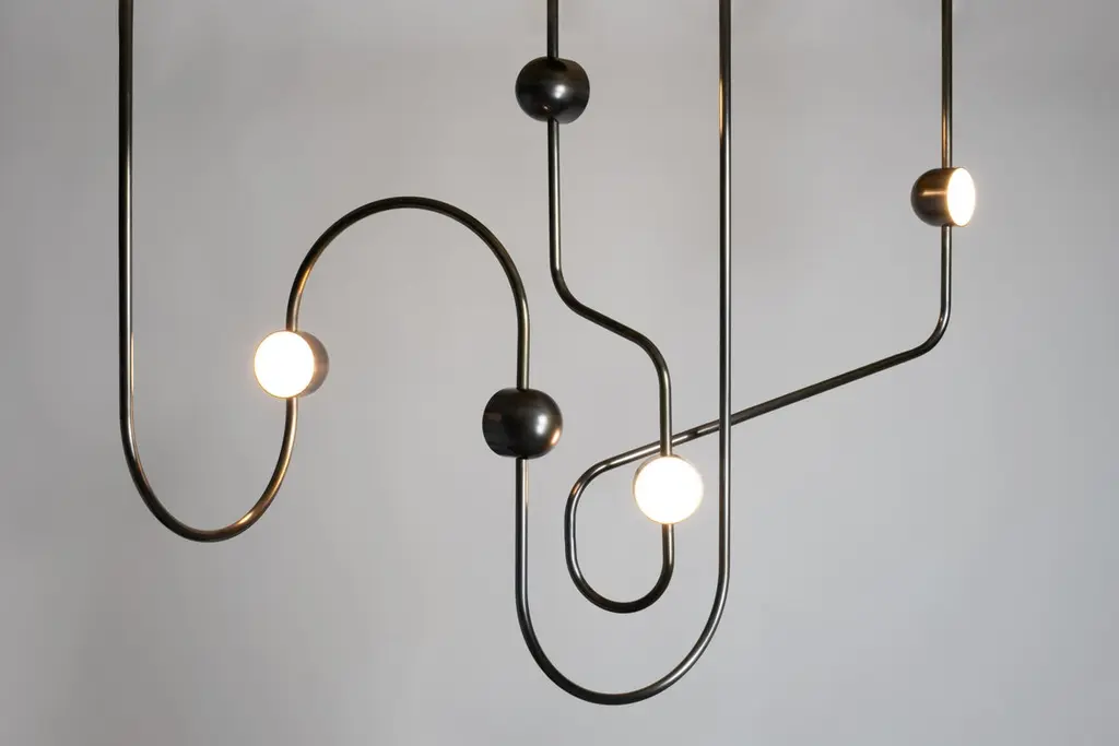 Dia is a sculptural chandelier inspired by the heterophony of natural sound. Each frame (or melody) is hand-rolled with all joints cleverly concealed within the circular light source, the playful LED light sources disperse ambient light in all directions. As this piece is handmade to order it is fully customizable in size, scale, hanging and arrangement on request. The given height is the minimum hanging height (from the ceiling to the bottom of the piece).