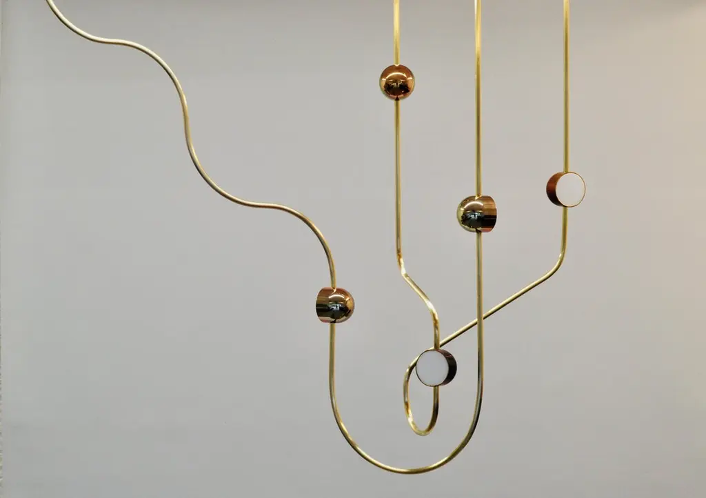 Dia is a sculptural chandelier inspired by the heterophony of natural sound. Each frame (or melody) is hand-rolled with all joints cleverly concealed within the circular light source, the playful LED light sources disperse ambient light in all directions. As this piece is handmade to order it is fully customizable in size, scale, hanging and arrangement on request. The given height is the minimum hanging height (from the ceiling to the bottom of the piece).