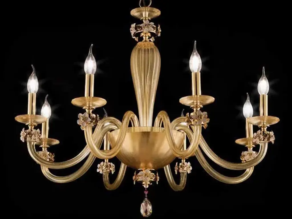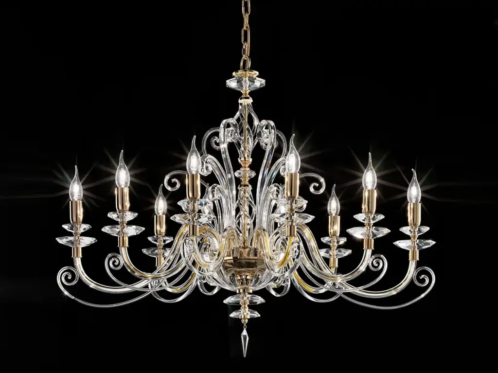 Finish: shiny gold. Other finishes on request.Color: transparent Diamond: crystal central body, crystal cup, bobeche and spheres in transparent color. Green Diamond: crystal central body, crystal cup, bobeche in green color; spheres in violet color.Amber Diamond: crystal central body, crystal cup, bobeche in amber color; spheres in fumè color. Other colors on request.Details: central body and cup are in crystal material with diamond effect and they are made in Tuscany. All metal components are in brass material.Shade 34/45 bordeaux/light yellow mod. impero with ponge fabric ½ mod.Giuditta organza , ½ mod. elica organza . Bordeaux velvet trimming. Shade 34/44 black/ violet mod. impero with Asia voile and ½ mod. Giuditta organza , ½ mod. elica organza. Black velvet trimming.