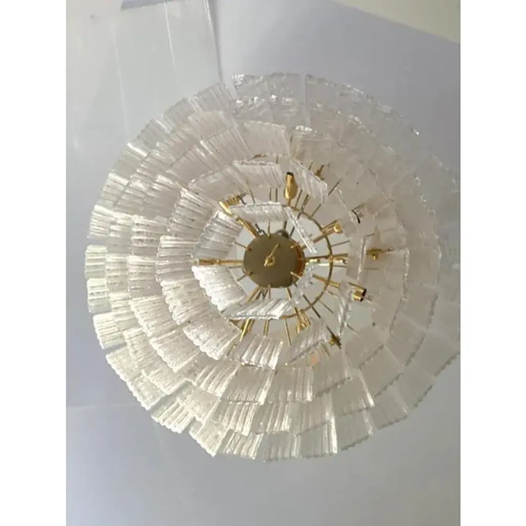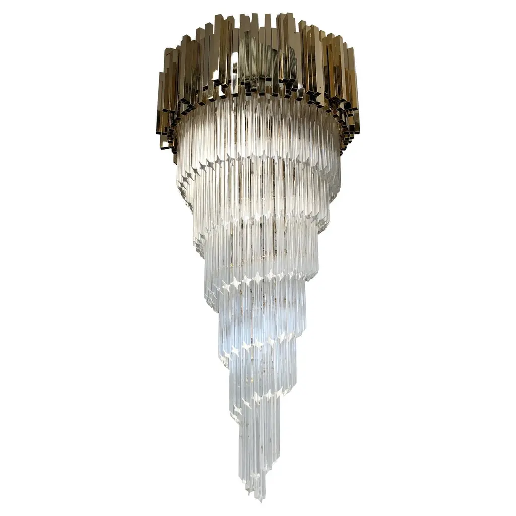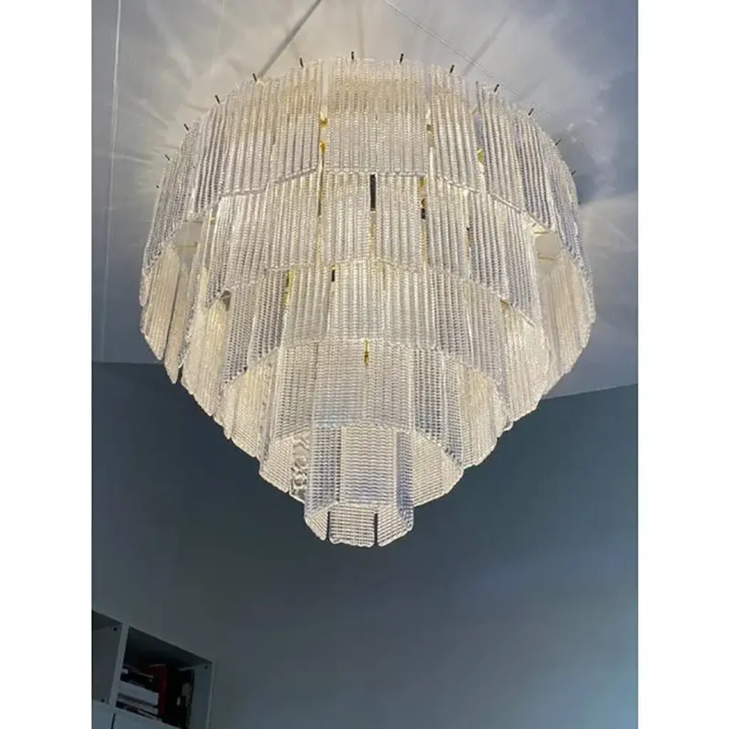 Contemporary diamond striped “listelli ” murano glass flush mount. huge chandelier in five levels of rectangular strips “listelli ” elements of murano glass worked with traditional tecnique in “piastra” -slab. this working process made with this diamanted texture the trasparent murano glass very sparkling also when the chandelier is turned off.entirely made in italy, fruit of murano glass of high italian know-how.exclusive design by simoeng. a luxury piece of italian art. metal frame in gold 24k plating bath. spare parts are included. Bulbs not included, they are compatible with led sustainability. entirely made in italy, made in murano glass fruit of of high italian know-how. dimensions (cm/in): d 80 cm h 67cm/ d 31.5″ in h 23.6″ us plug (up to 110v).