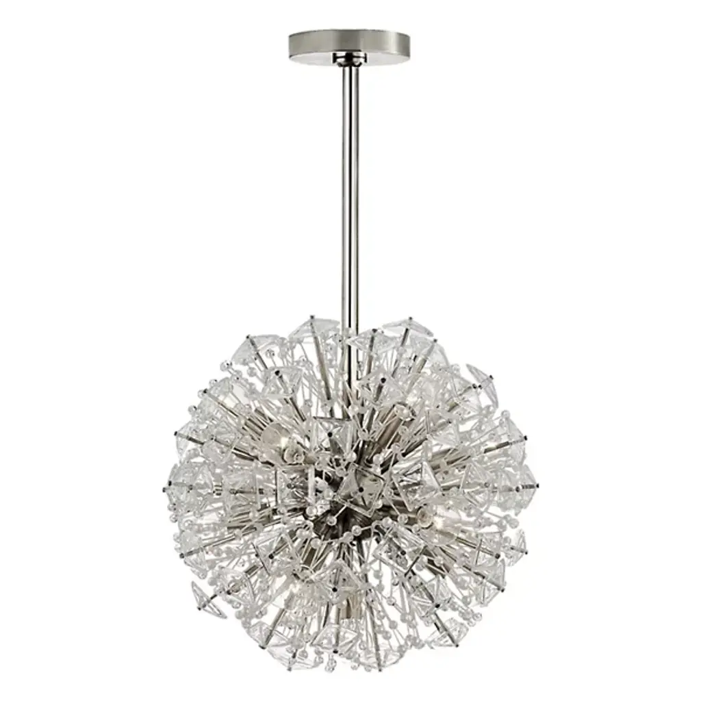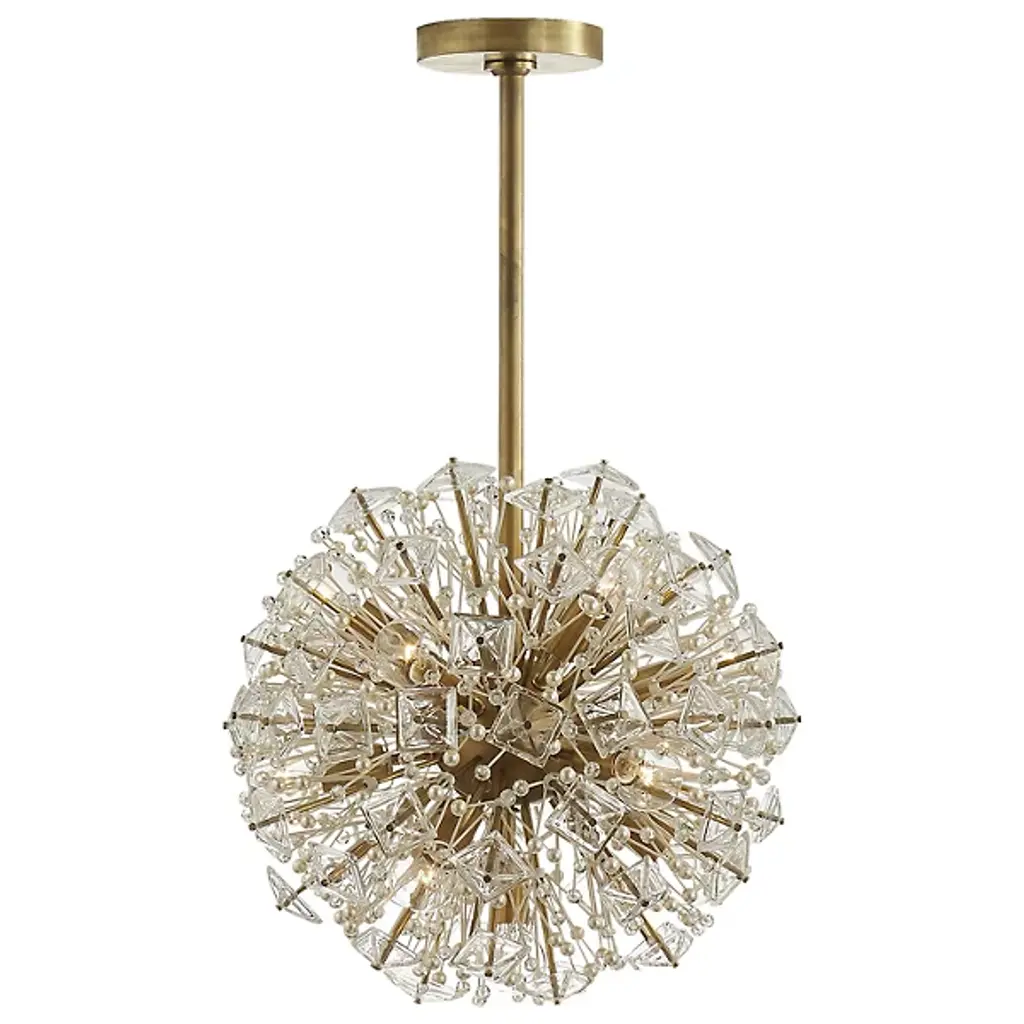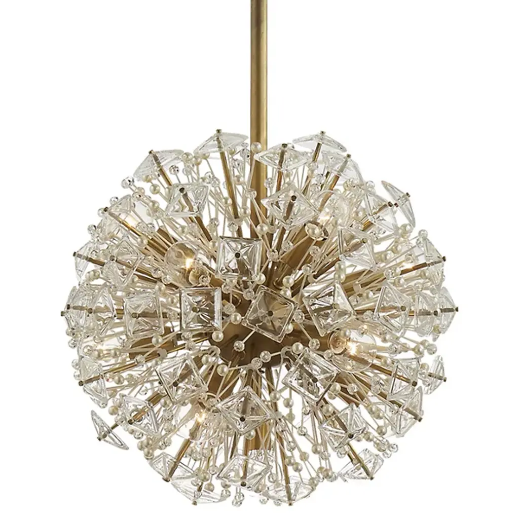 Visual Comfort Signature, formerly known as Visual Comfort, presents the Dickinson Chandelier. Designed by Kate Spade New York, the aesthetic has been inspired by different styles across the spectrum. Pulling from the iconic Sputnik silhouette of the 60s, the mindful attention to detail in the filigree is reminiscent of the roaring 20s. Featuring a brass bodice with glass and cream pearl accents, this elegant luxury light furnishing is meant to elevate the illumination experience in style.