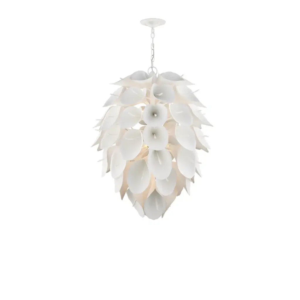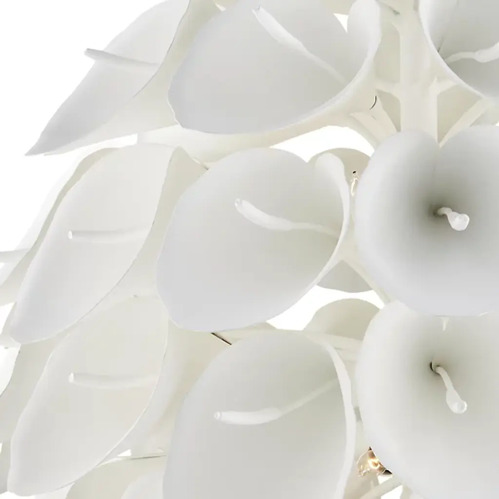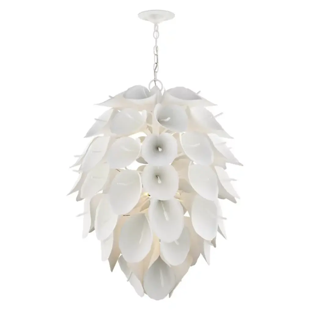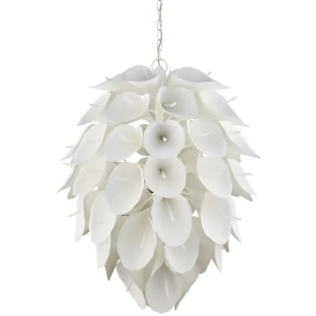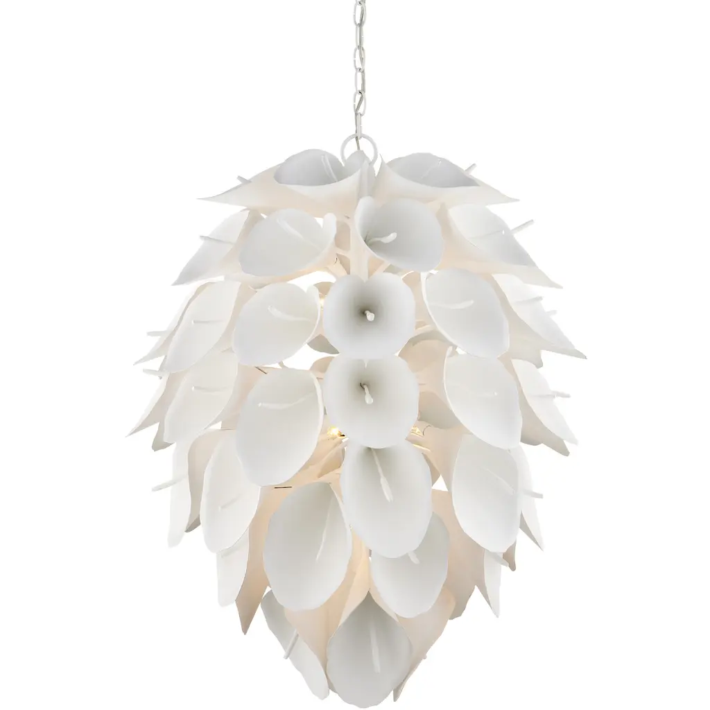 The Diego Chandelier from Currey & Company exudes enchantment with its teardrop-shaped design crafted from wrought iron and finished in white gesso. Designed by Marjorie Skouras, it pays homage to the Yucatan Peninsula, her cherished home. Inspired by the flourishing Calla Lily native to her surroundings, this white chandelier is part of her collection, celebrating the region's rich flora and fauna. Adjustable from 40.25" to 108.25" with the included chain, rod kit, and cable, additional options are available to accommodate longer drops, ensuring it fits perfectly into any space.